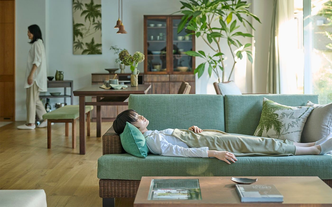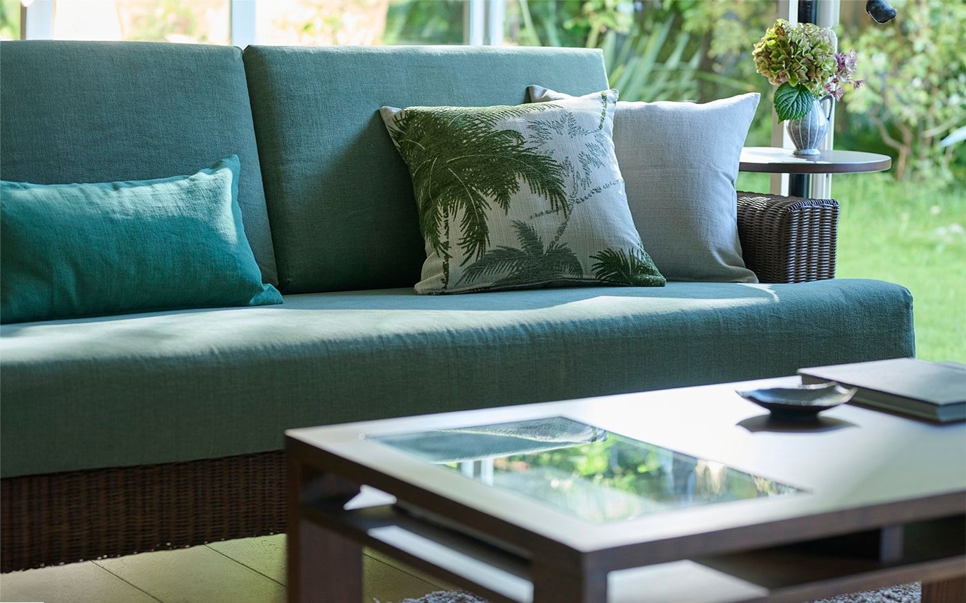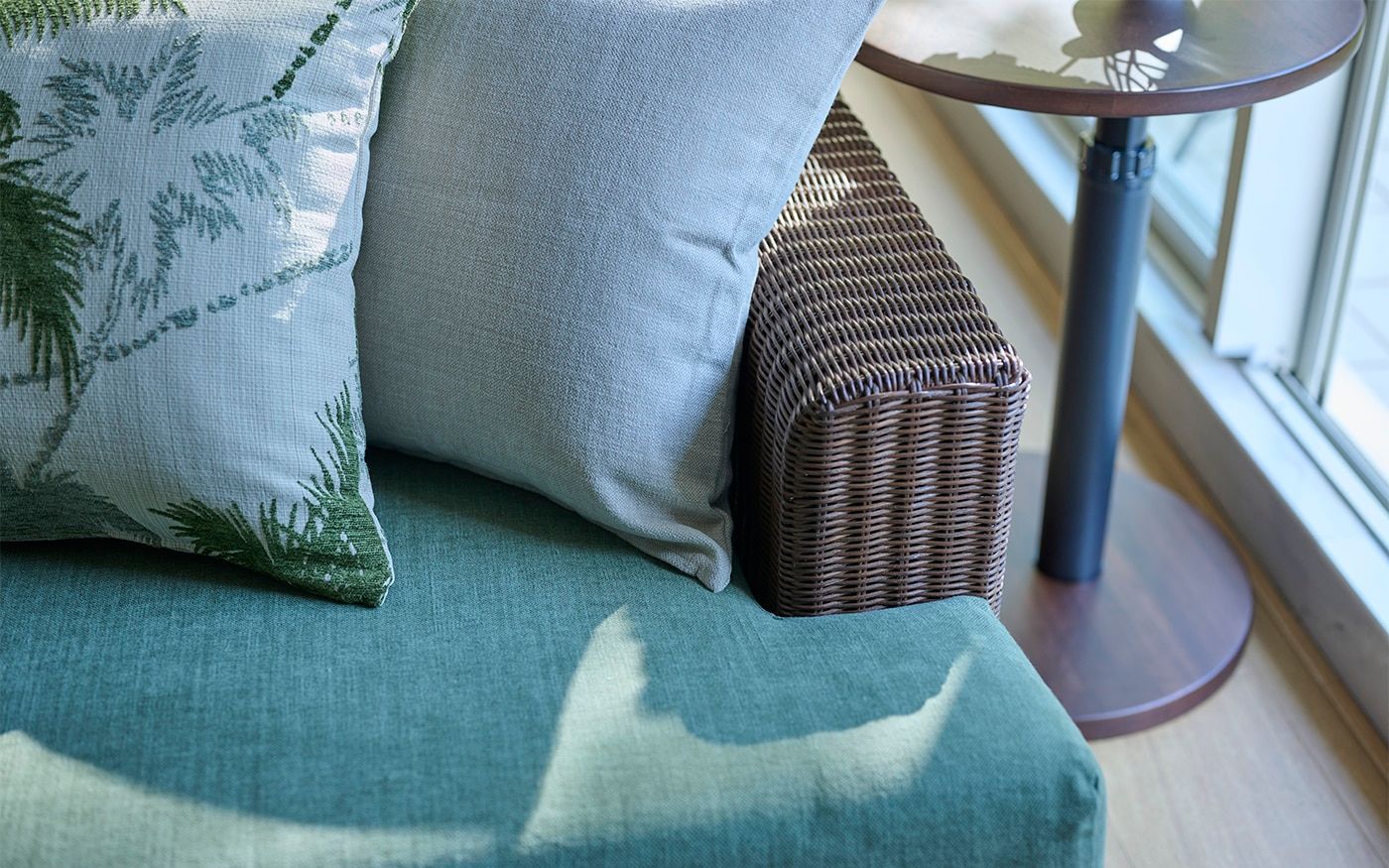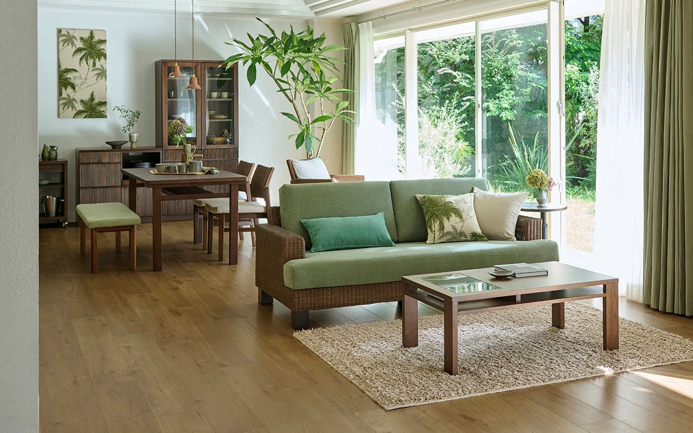 ハーブグリーンのソファには、ヤシ柄や鮮やかな緑色のクッションが映えます。それらに落ち着いたベージュのクッションを加えることで、洗練されたバランスのある空間に。色と柄の組み合わせで、お部屋に自然な温もりとスタイリッシュさを演出しましょう。