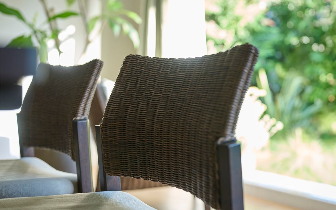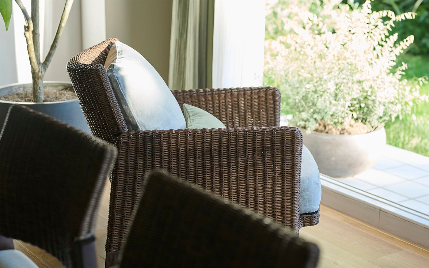 自然に溶け込むブラウンラタンのラウンジチェアで、ガーデンの緑に囲まれた至福のひとときを。室内には大きな観葉植物を添えて、自然の癒しを毎日の生活に取り入れました。このチェアが一つあれば、心地よいリラックス空間を演出できるはずです。