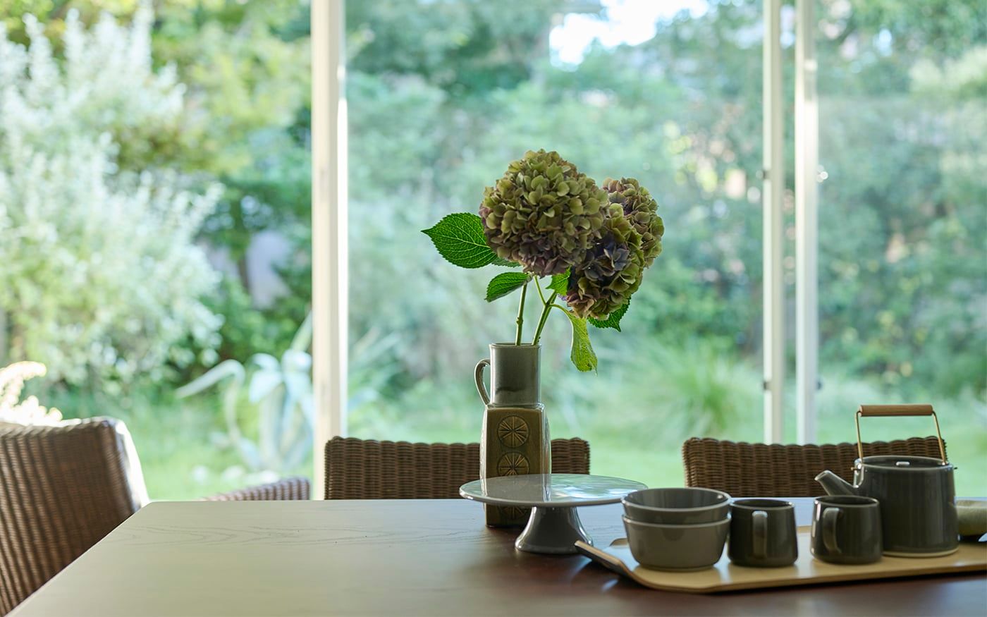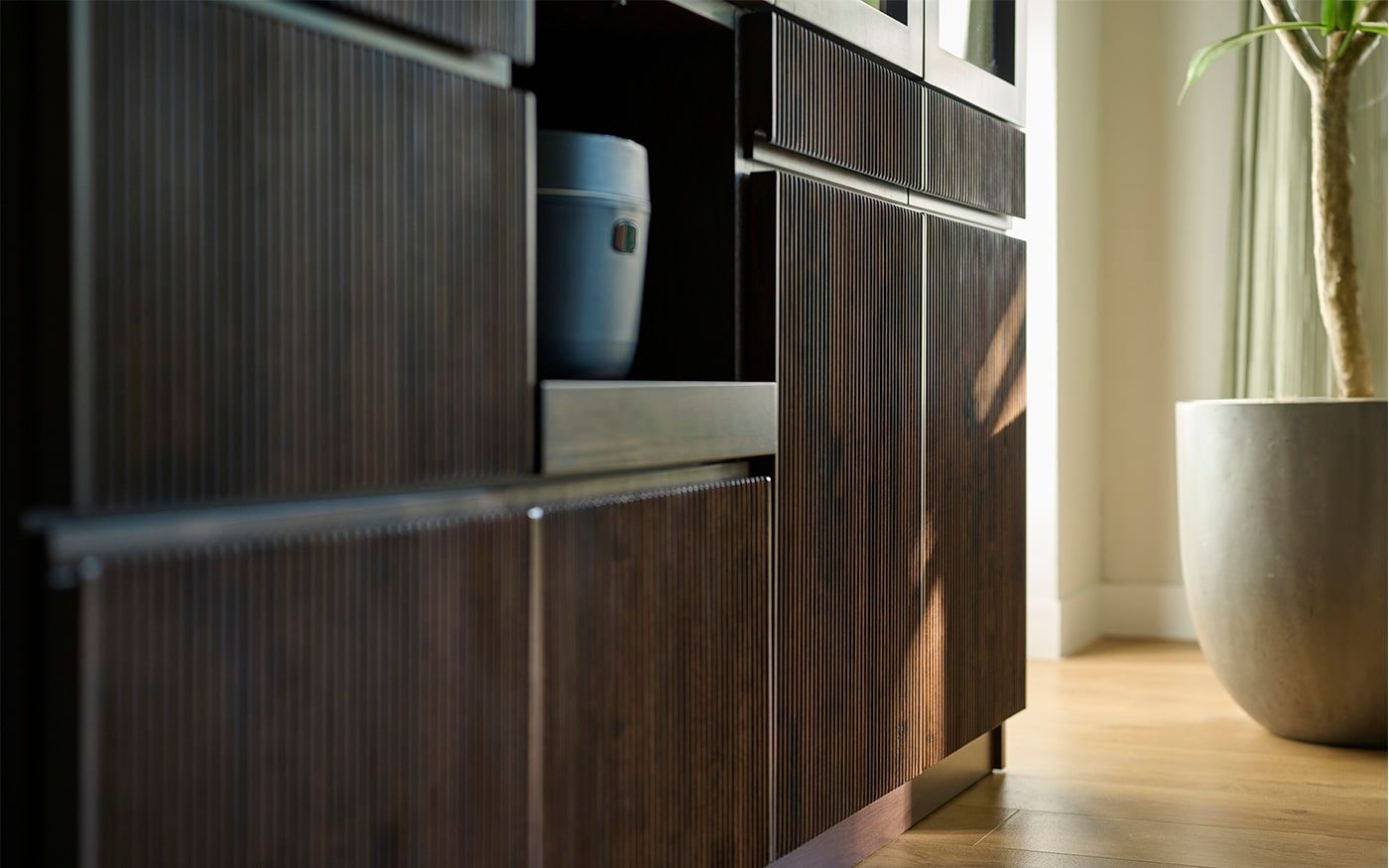 無垢材から削り出された繊細な縦ラインが特徴の木製キッチン収納は、お部屋に温もりを与えます。周囲に配置したグリーンのアートや植栽が、キッチン空間に穏やかなリラックス感をもたらし、日々の時間がより心地よいものになるでしょう。