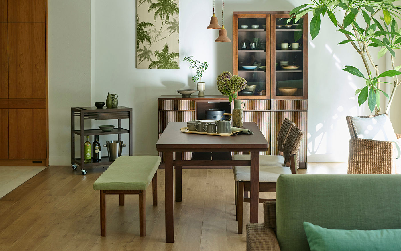 無垢材から削り出された繊細な縦ラインが特徴の木製キッチン収納は、お部屋に温もりを与えます。周囲に配置したグリーンのアートや植栽が、キッチン空間に穏やかなリラックス感をもたらし、日々の時間がより心地よいものになるでしょう。