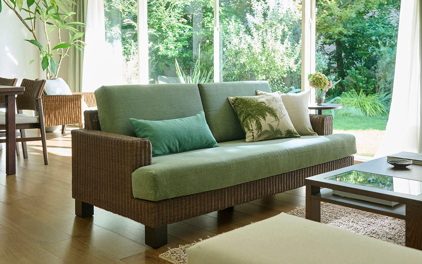 ハーブグリーンのソファには、ヤシ柄や鮮やかな緑色のクッションが映えます。それらに落ち着いたベージュのクッションを加えることで、洗練されたバランスのある空間に。色と柄の組み合わせで、お部屋に自然な温もりとスタイリッシュさを演出しましょう。