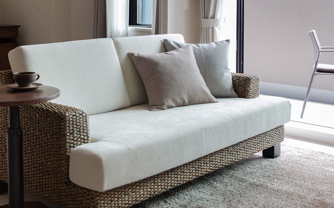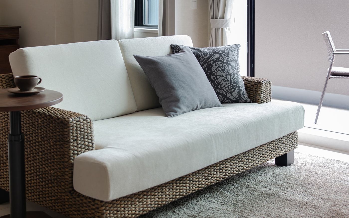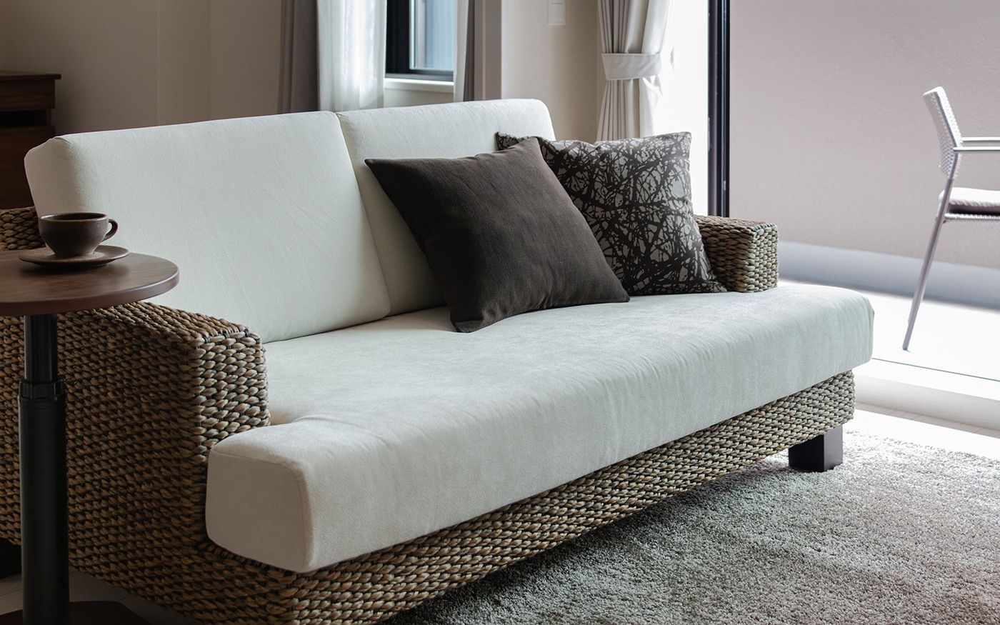 お部屋に癒しやリゾート感を演出したいときは、木材とも相性の良い編み込み素材のソファを取り入れるのがポイントです。内装色に合わせた淡いブラウンのカラーを選ぶことでより一層リラックス感が増します。