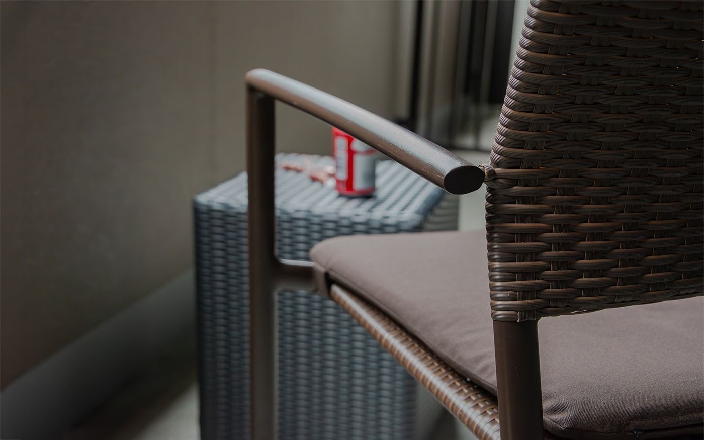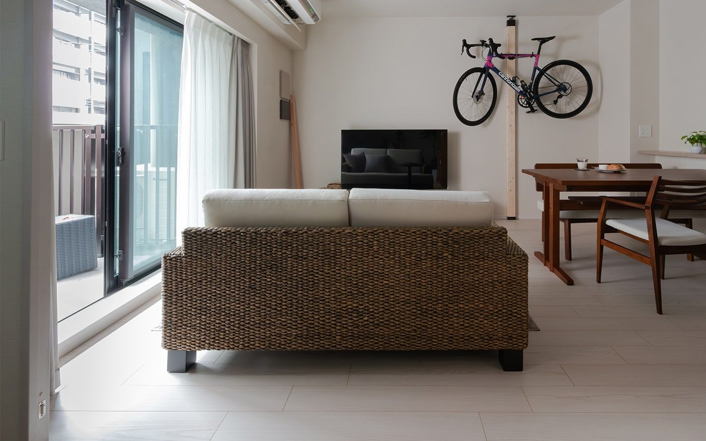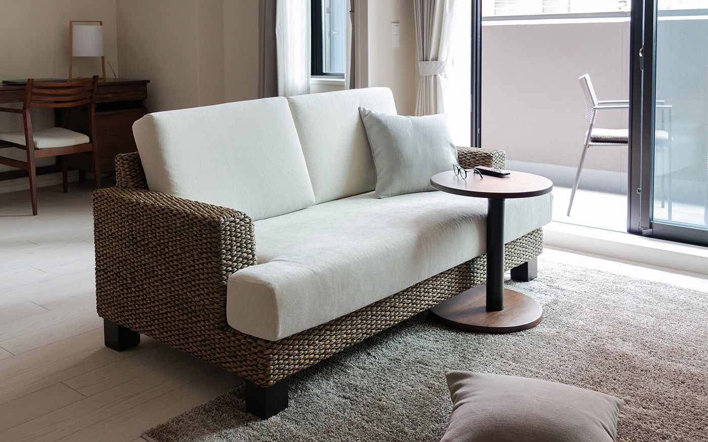 お部屋に癒しやリゾート感を演出したいときは、木材とも相性の良い編み込み素材のソファを取り入れるのがポイントです。内装色に合わせた淡いブラウンのカラーを選ぶことでより一層リラックス感が増します。