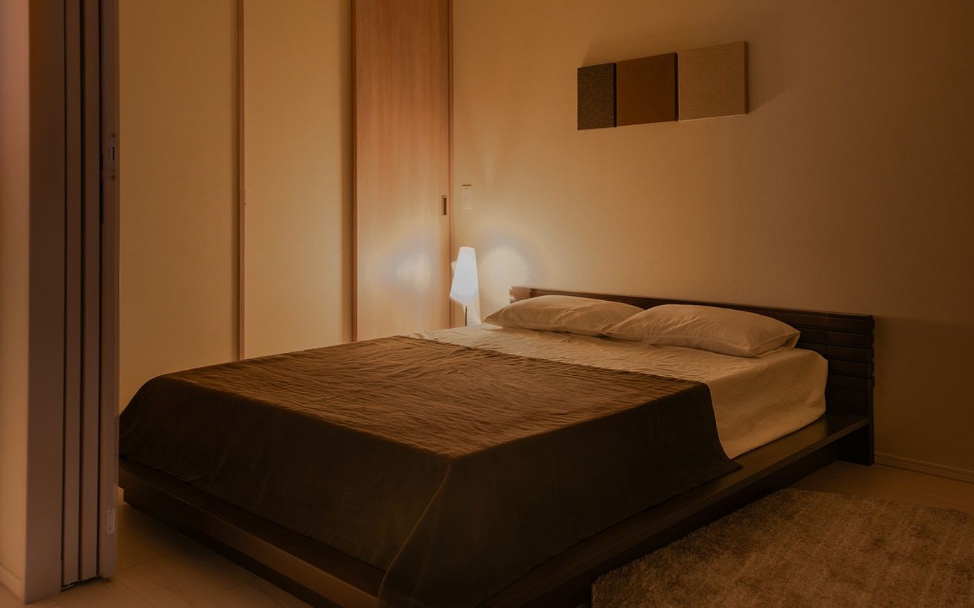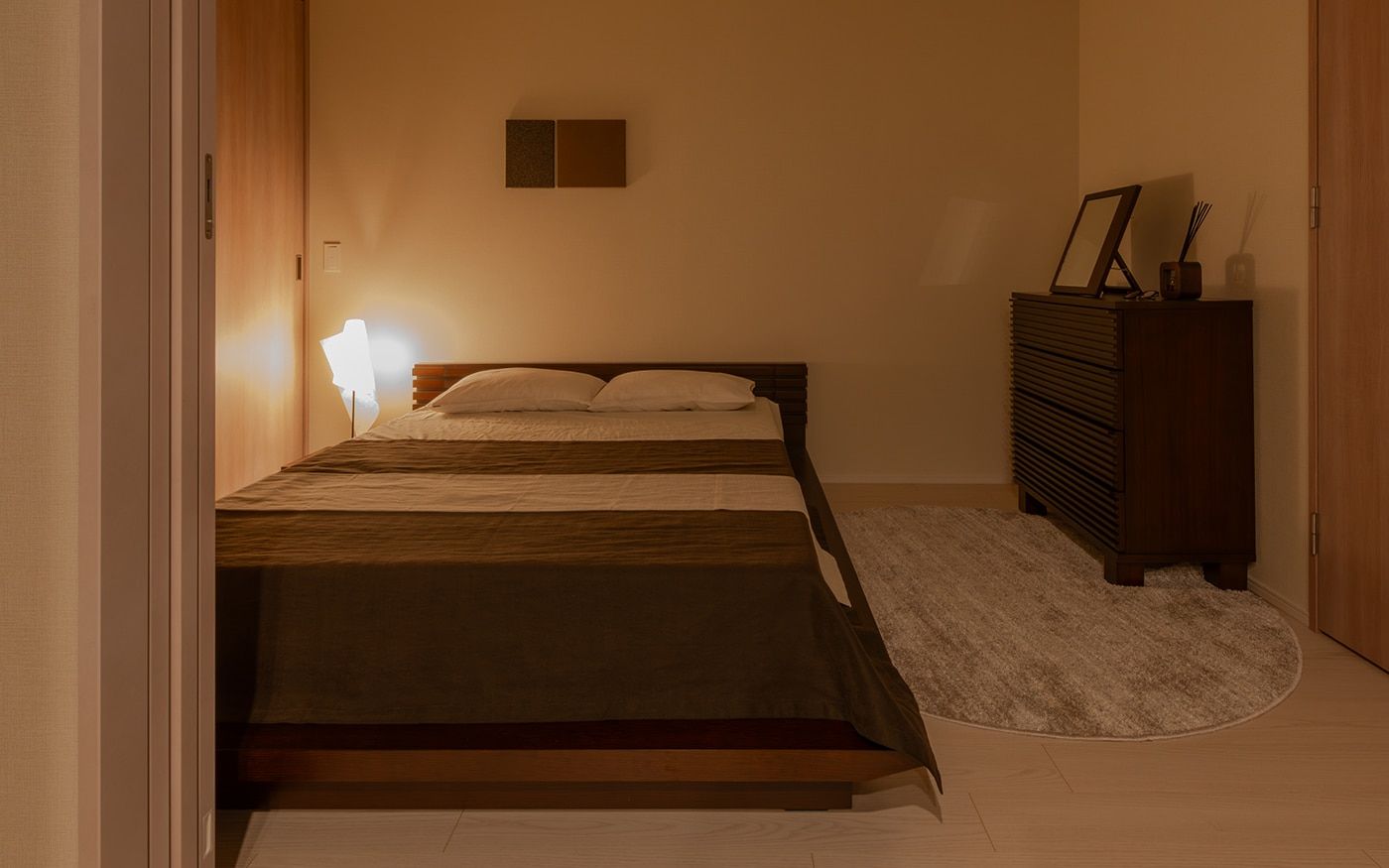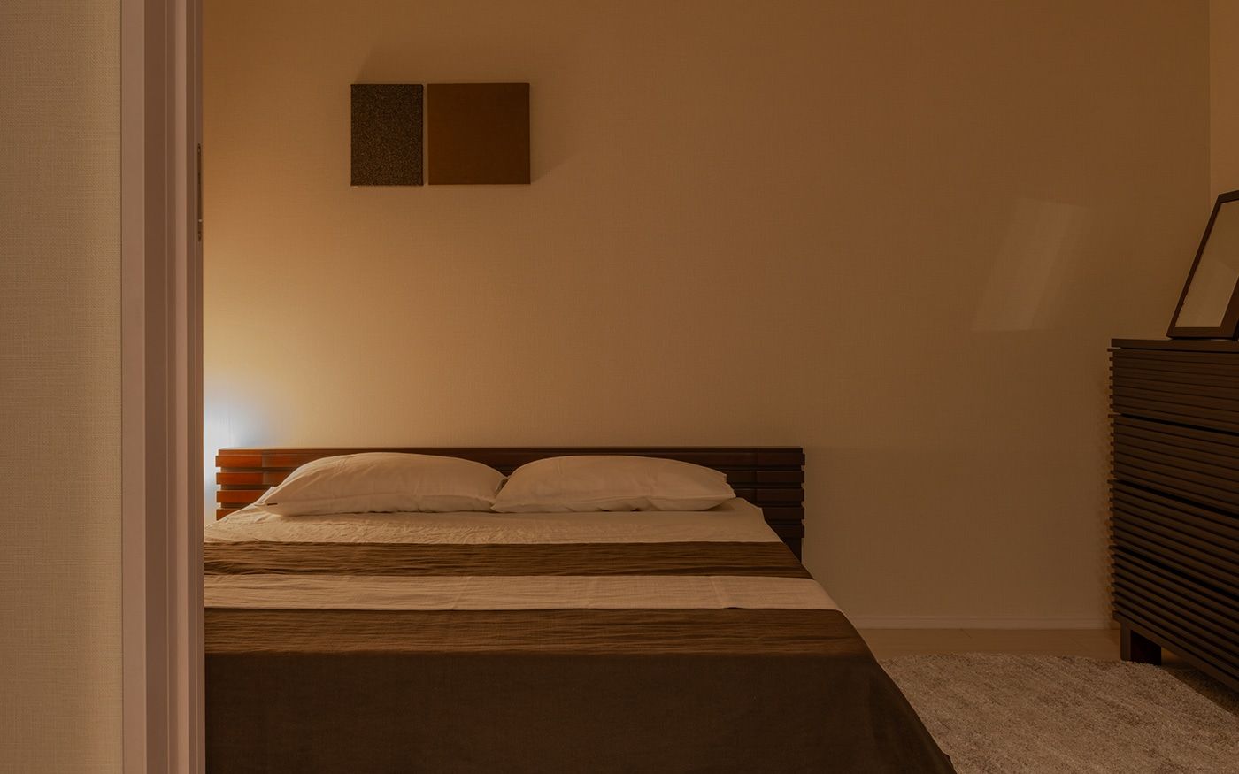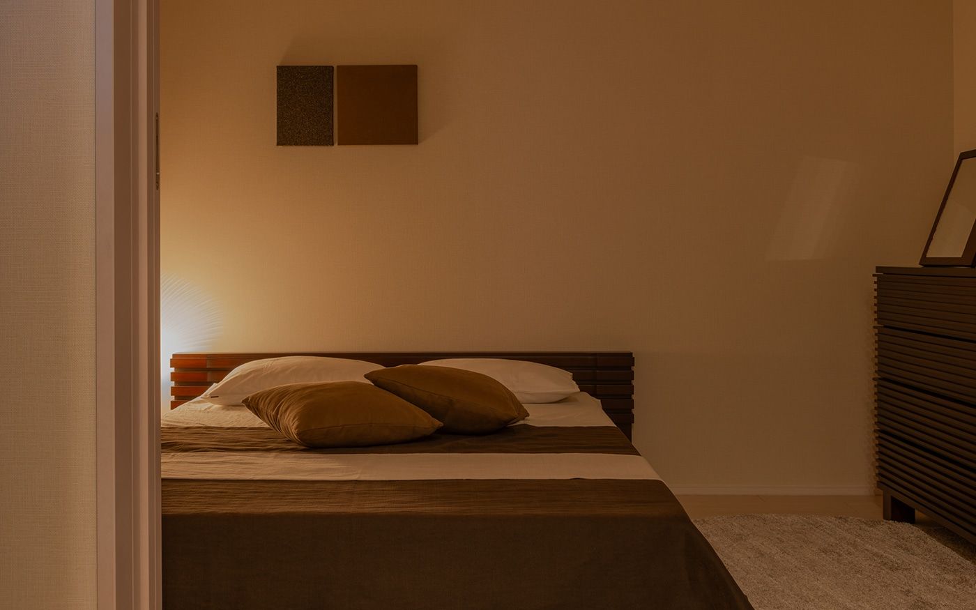 ブラウン系のカラーや和紙など柔らかい素材感のある小物を取り入れることで、温かみのある落ち着いた寝室に。ベッド周りにはベッドスプレッド&スローに合わせて、ファブリックパネルや間接照明も取り入れ、洗練された雰囲気を演出しています。