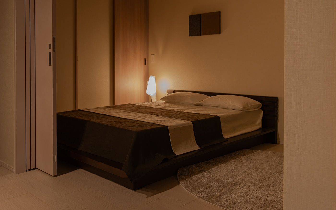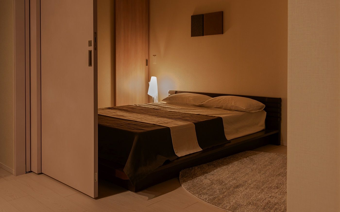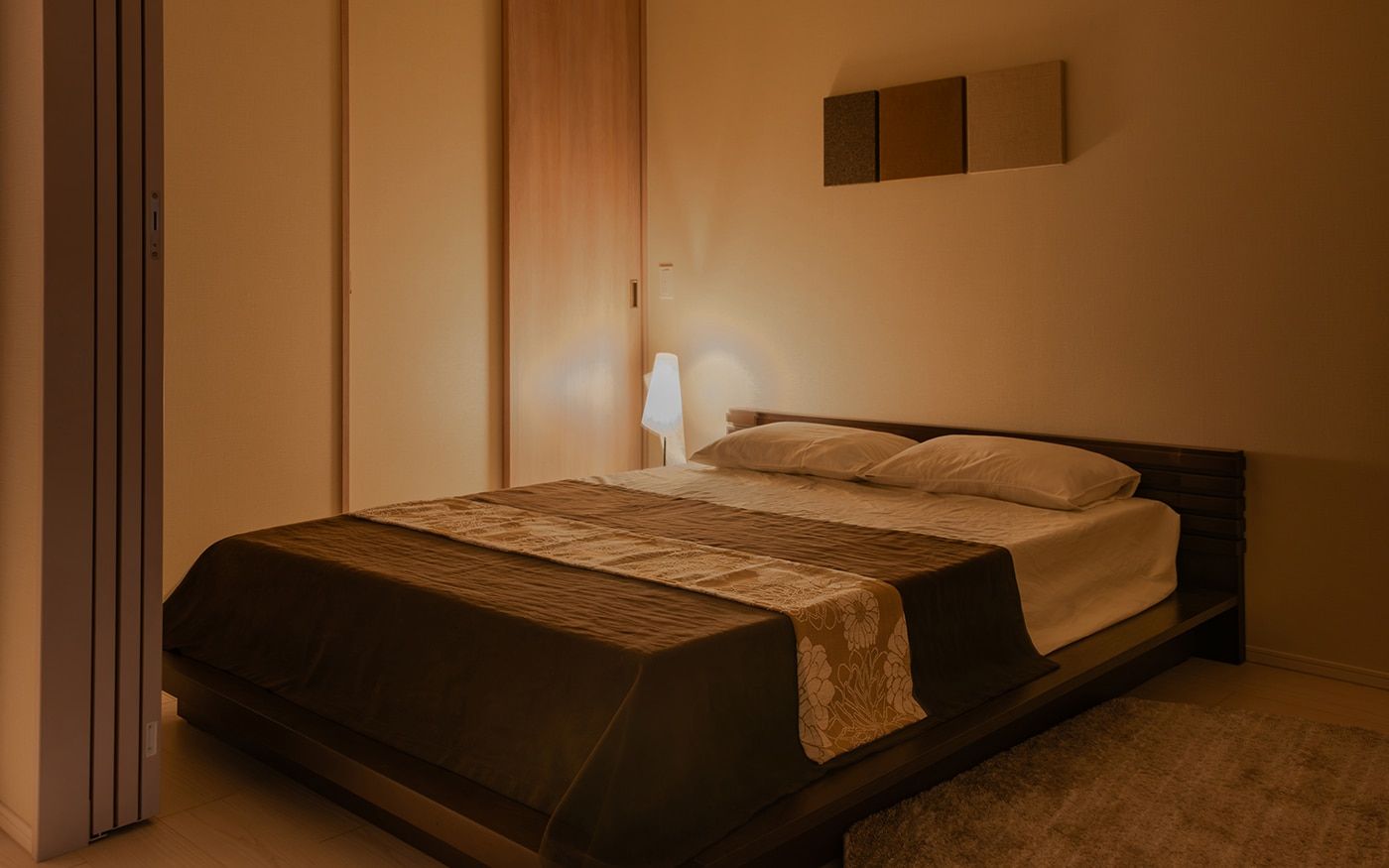 ブラウン系のカラーや和紙など柔らかい素材感のある小物を取り入れることで、温かみのある落ち着いた寝室に。ベッド周りにはベッドスプレッド&スローに合わせて、ファブリックパネルや間接照明も取り入れ、洗練された雰囲気を演出しています。