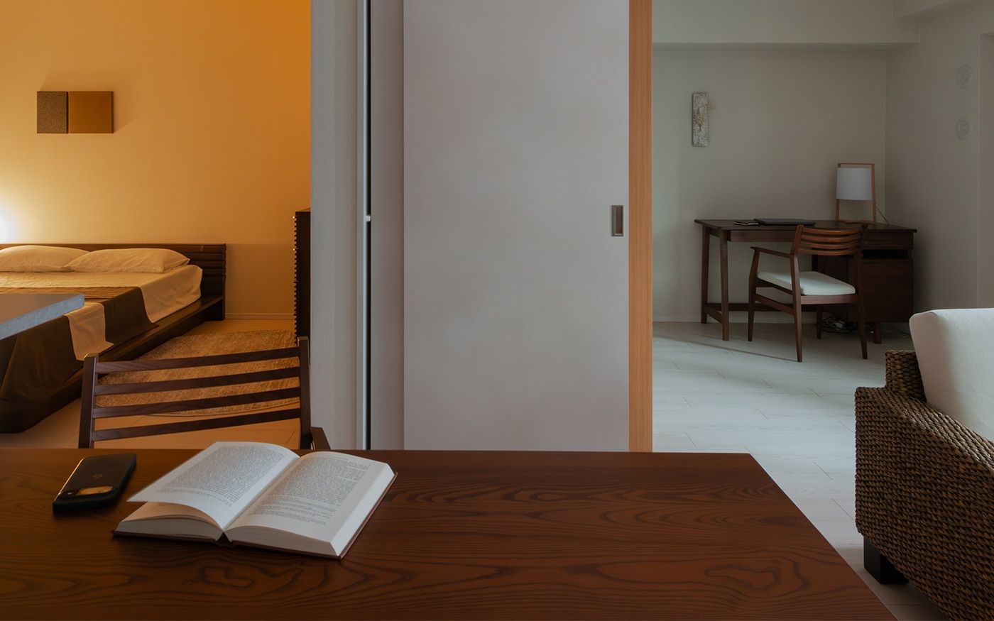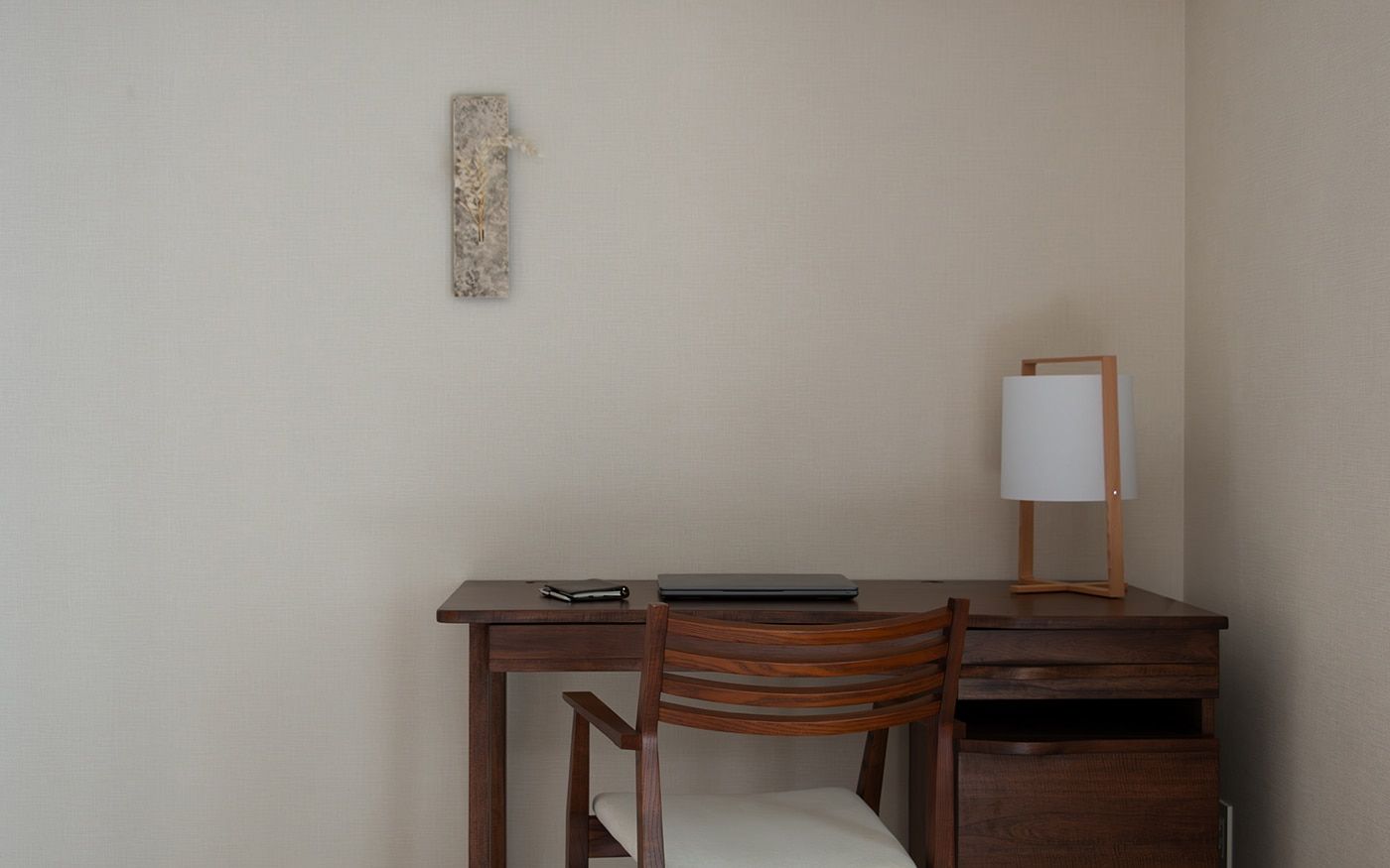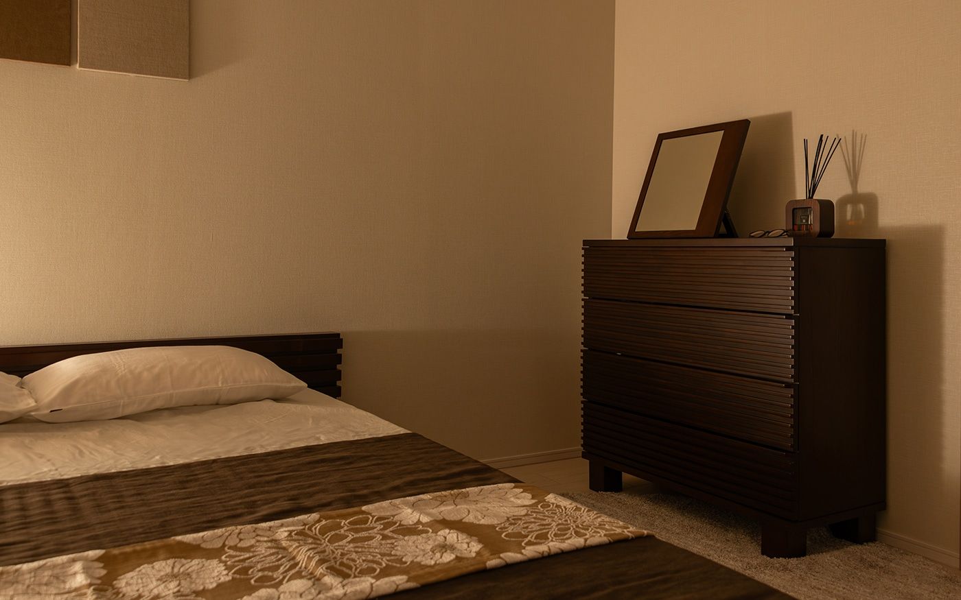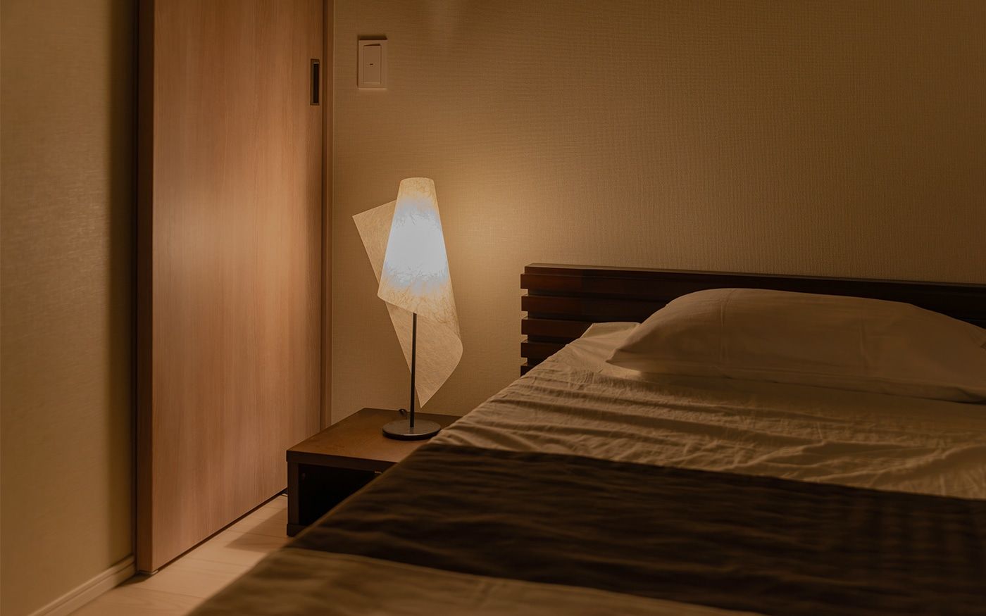 ブラウン系のカラーや和紙など柔らかい素材感のある小物を取り入れることで、温かみのある落ち着いた寝室に。ベッド周りにはベッドスプレッド&スローに合わせて、ファブリックパネルや間接照明も取り入れ、洗練された雰囲気を演出しています。