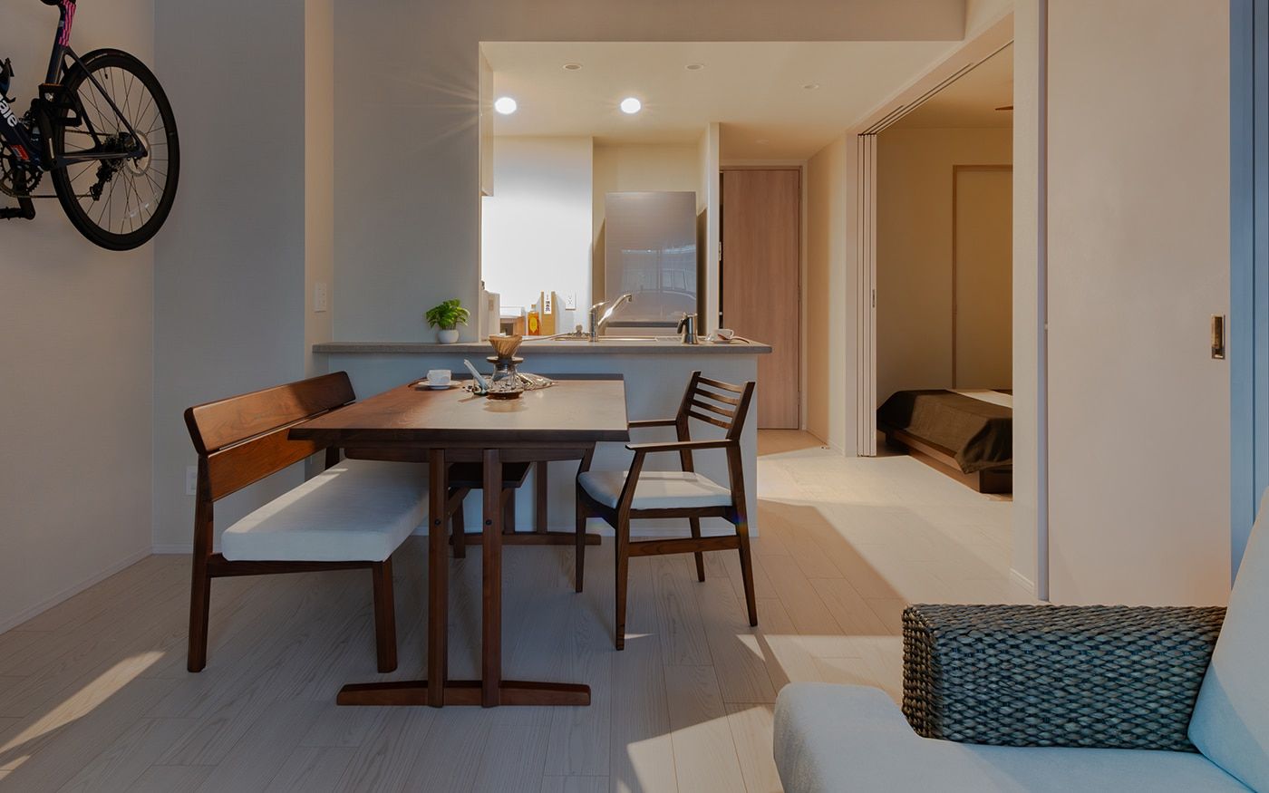リゾートのような開放感をコンセプトに、広々とした天板に脚下がT字で抜け感のあるダイニングテーブルをセレクト。普段は一人で広々としたダイニングでゆったり食事を楽しみ、来客があれば書斎の椅子を持ってきて充実したカフェタイムを。
