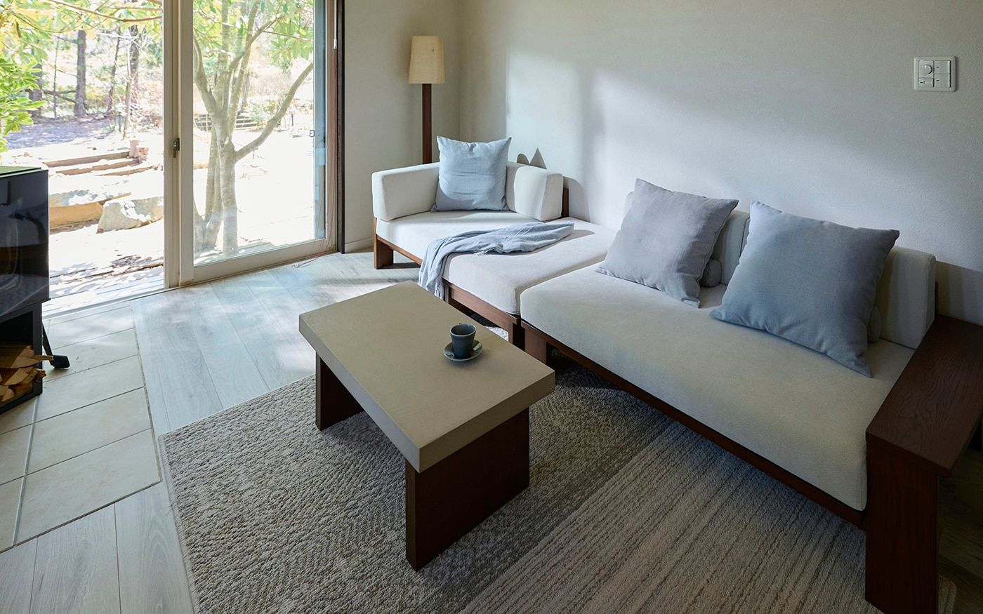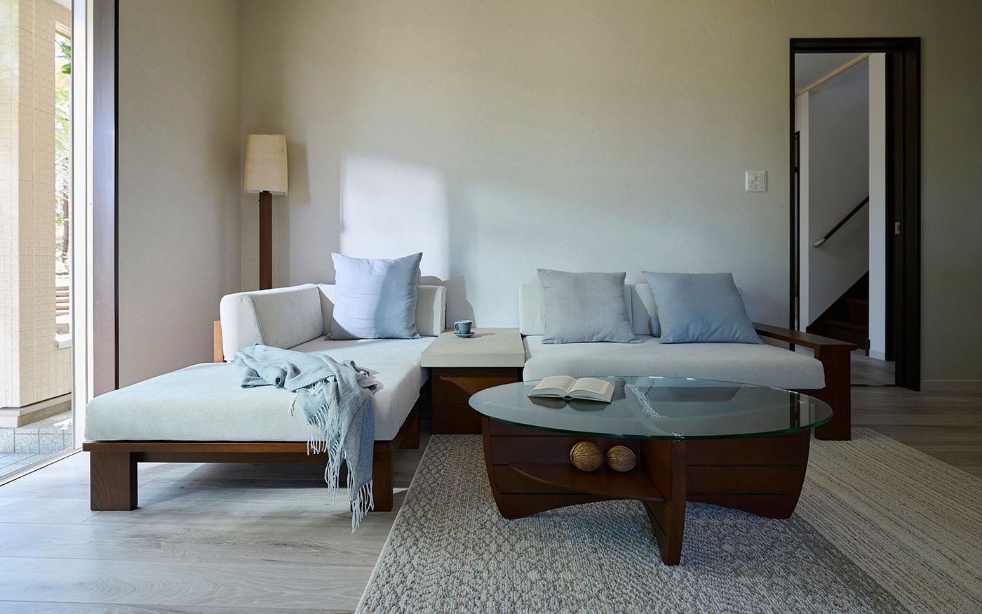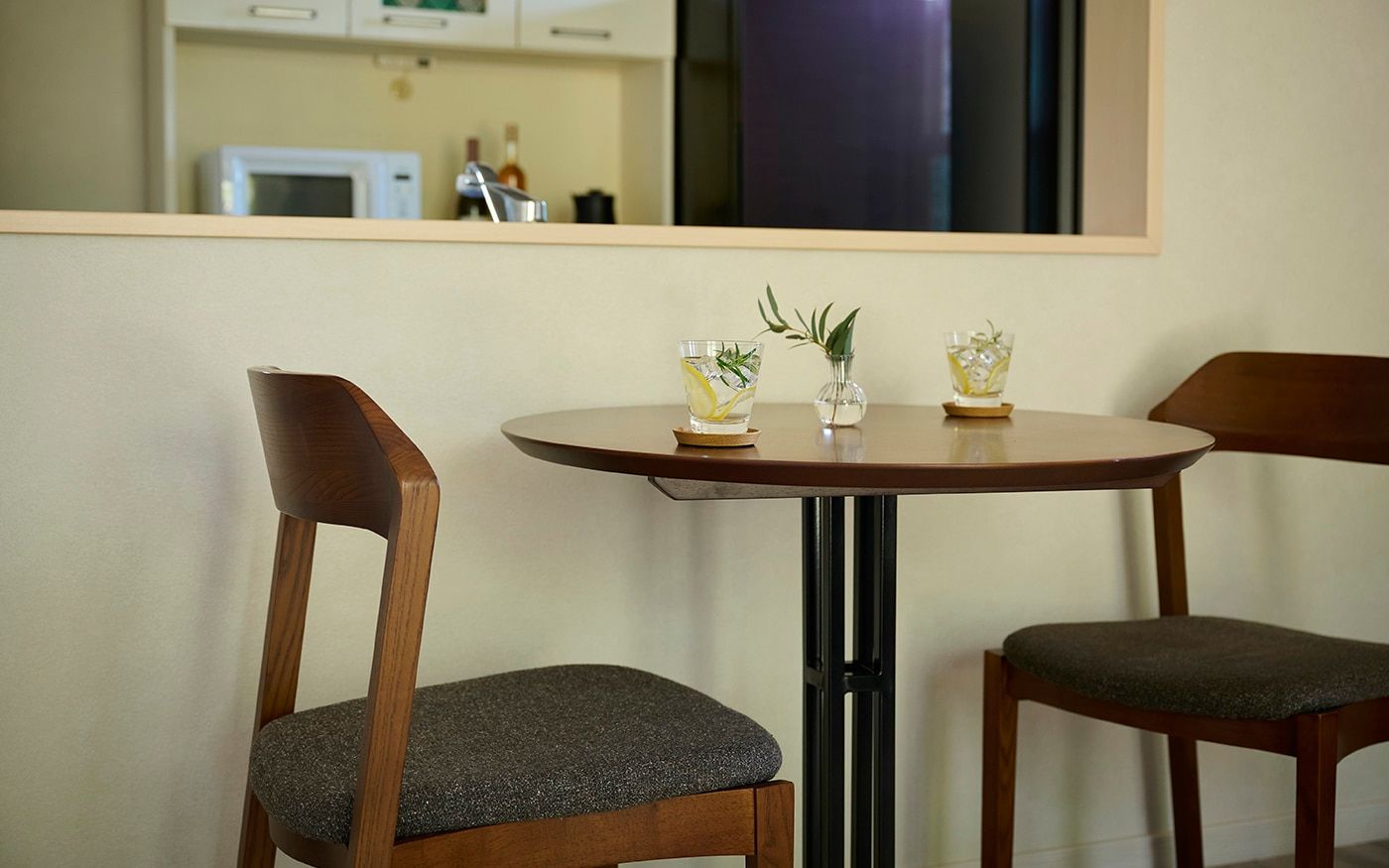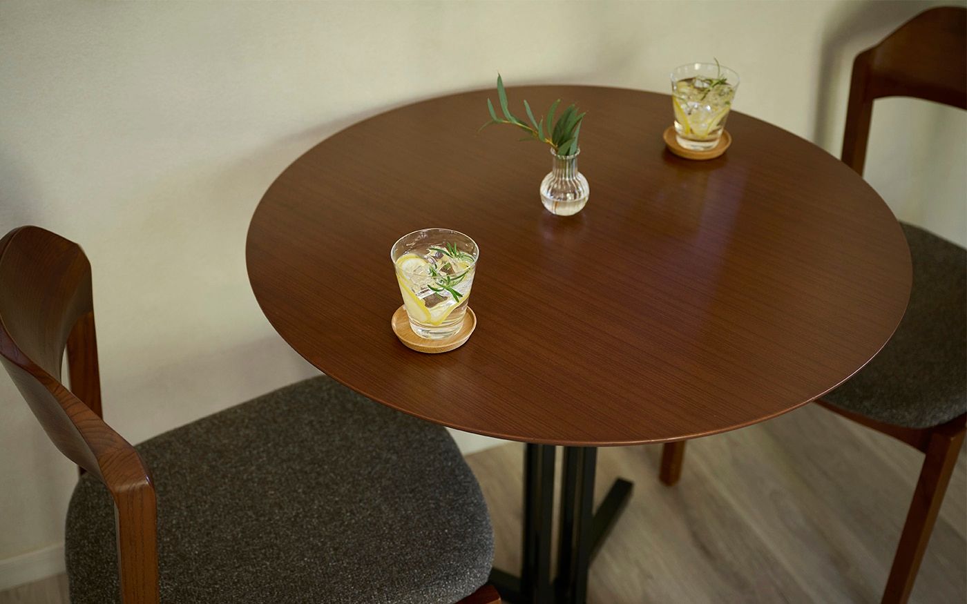 リゾートカフェのようなリラックススペースを演出する、おしゃれな円形カフェテーブルと無垢材チェアをセレクト。自然の温もりを感じる無垢材のチェアは、座るたびに心地よさを感じ、円形テーブルは会話を弾ませるデザインです。別荘ならではの贅沢なひとときを楽しめます。