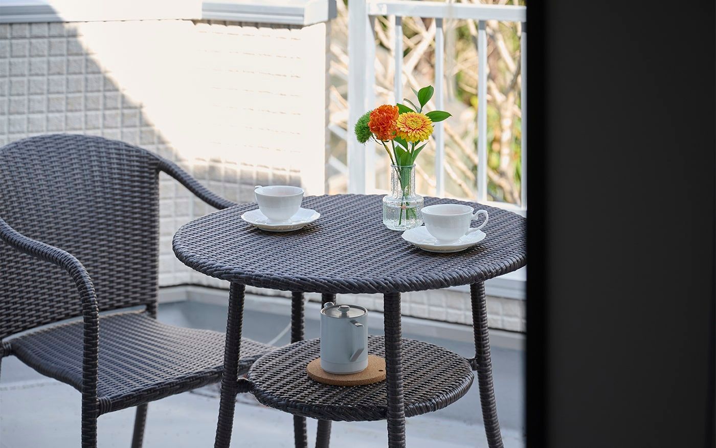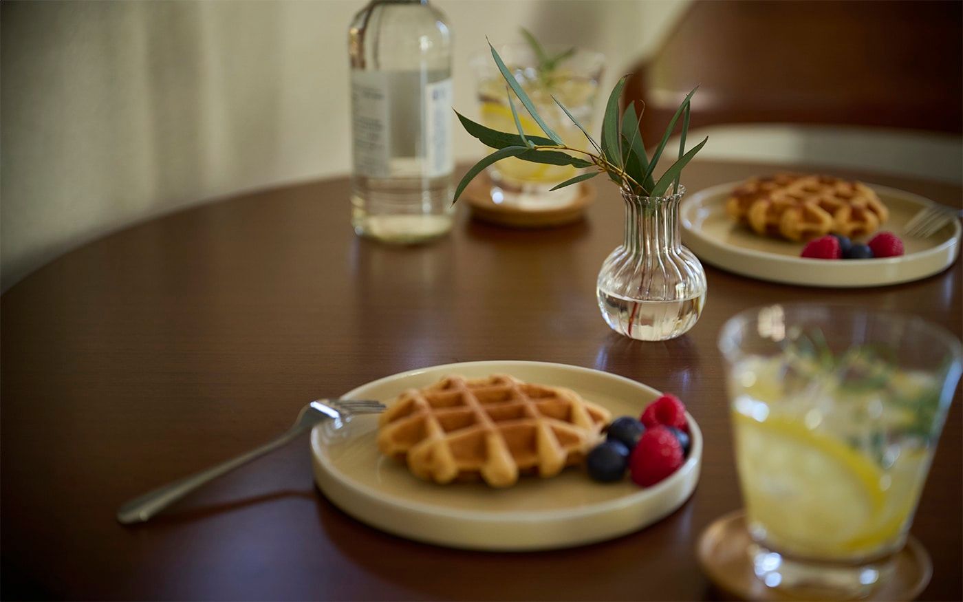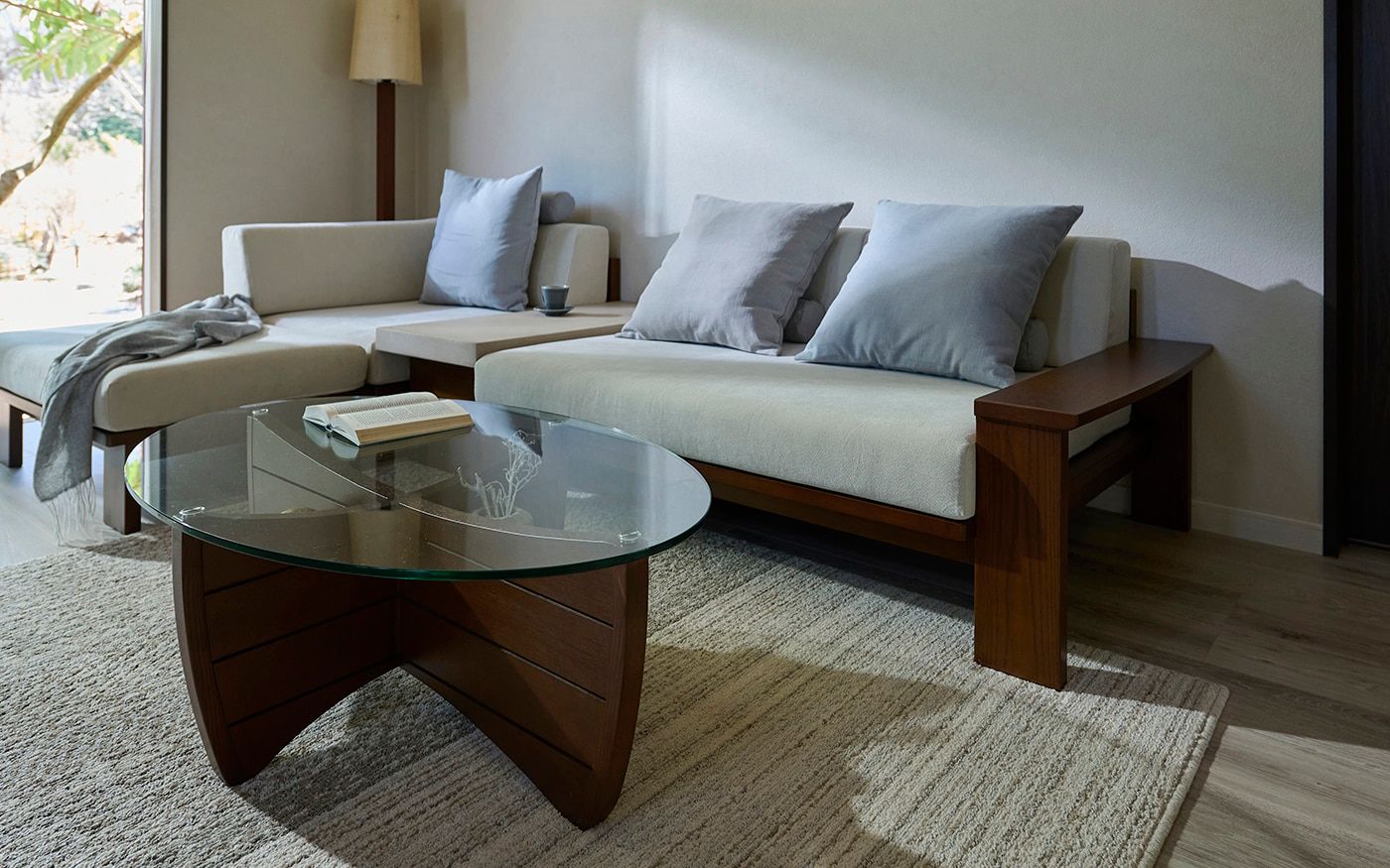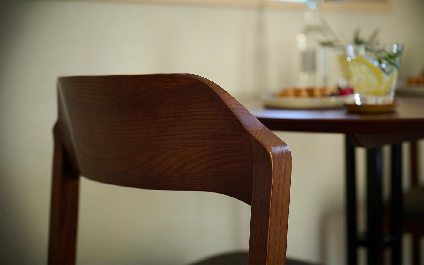 リゾートカフェのようなリラックススペースを演出する、おしゃれな円形カフェテーブルと無垢材チェアをセレクト。自然の温もりを感じる無垢材のチェアは、座るたびに心地よさを感じ、円形テーブルは会話を弾ませるデザインです。別荘ならではの贅沢なひとときを楽しめます。