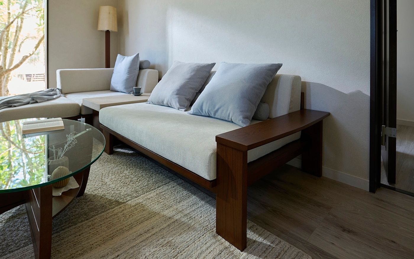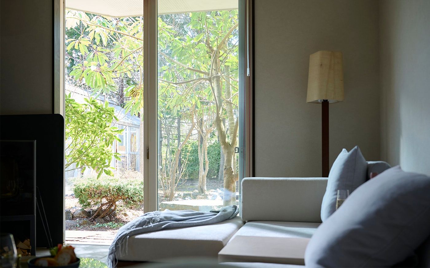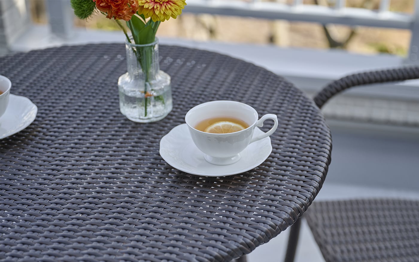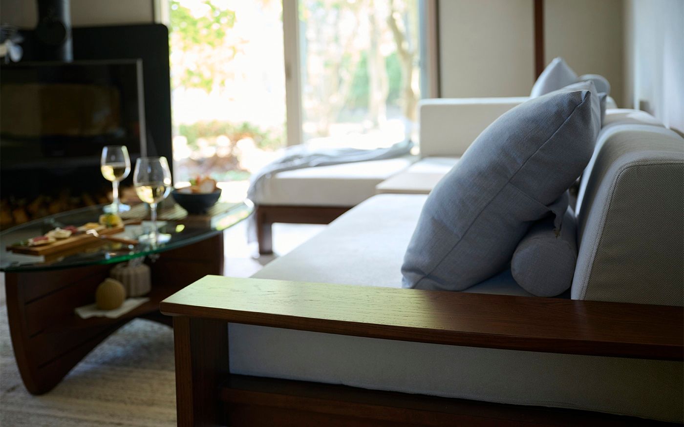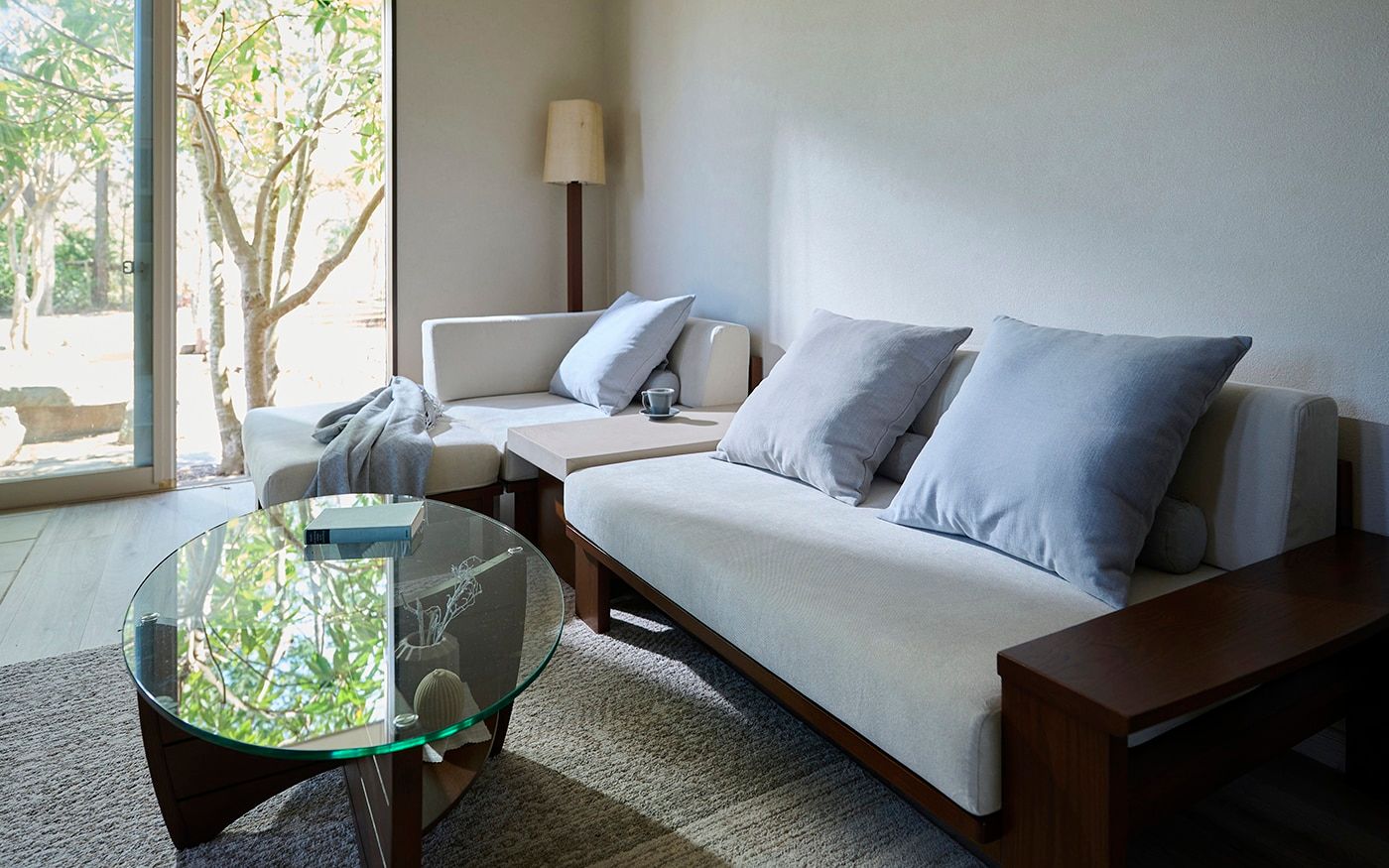 リゾートカフェのようなリラックススペースを演出する、おしゃれな円形カフェテーブルと無垢材チェアをセレクト。自然の温もりを感じる無垢材のチェアは、座るたびに心地よさを感じ、円形テーブルは会話を弾ませるデザインです。別荘ならではの贅沢なひとときを楽しめます。