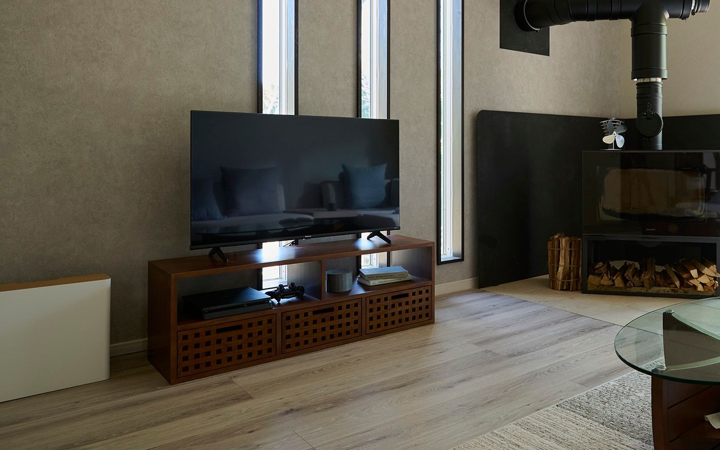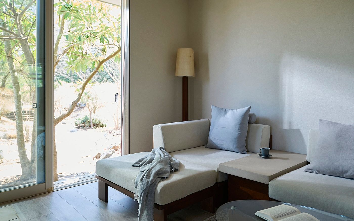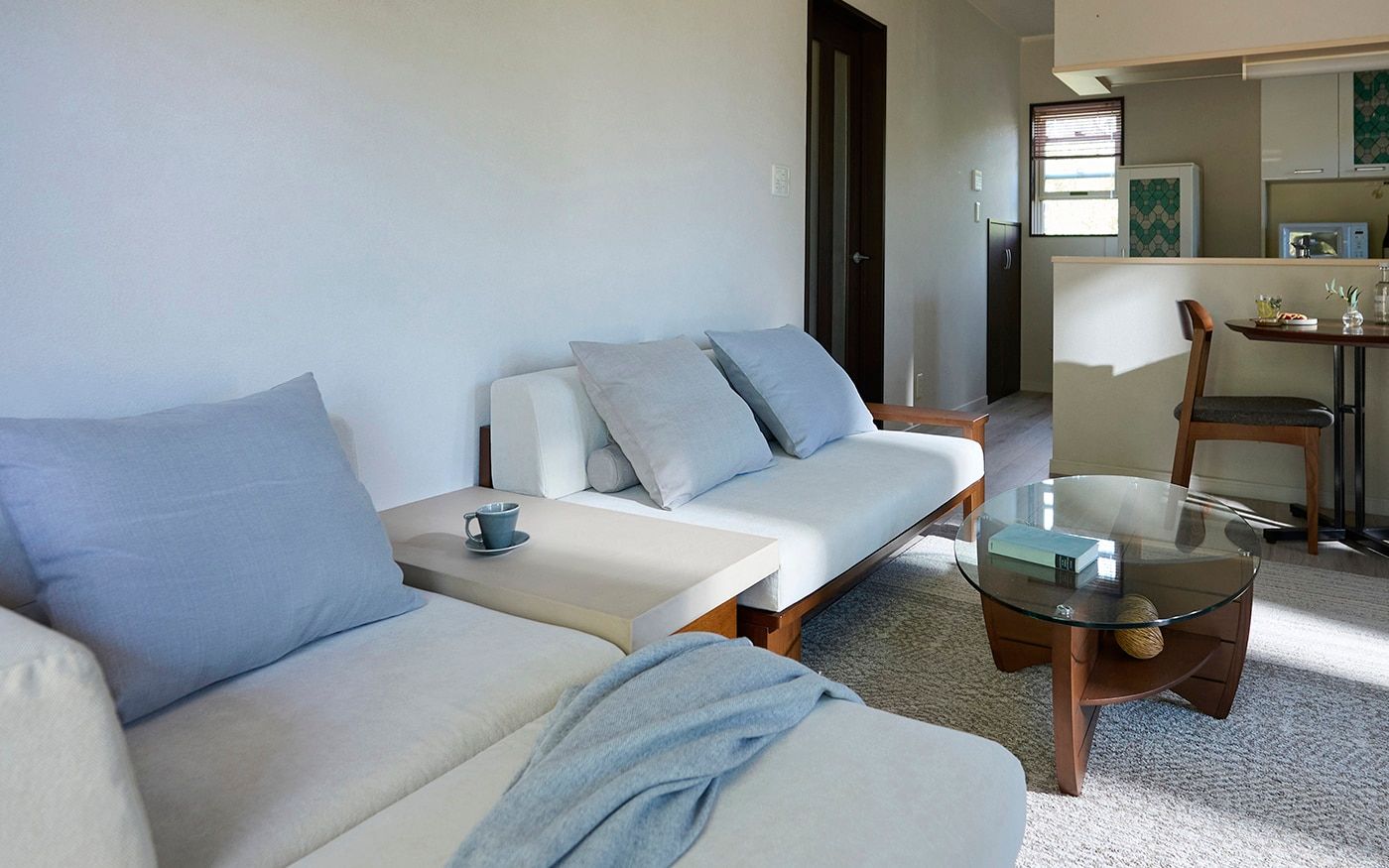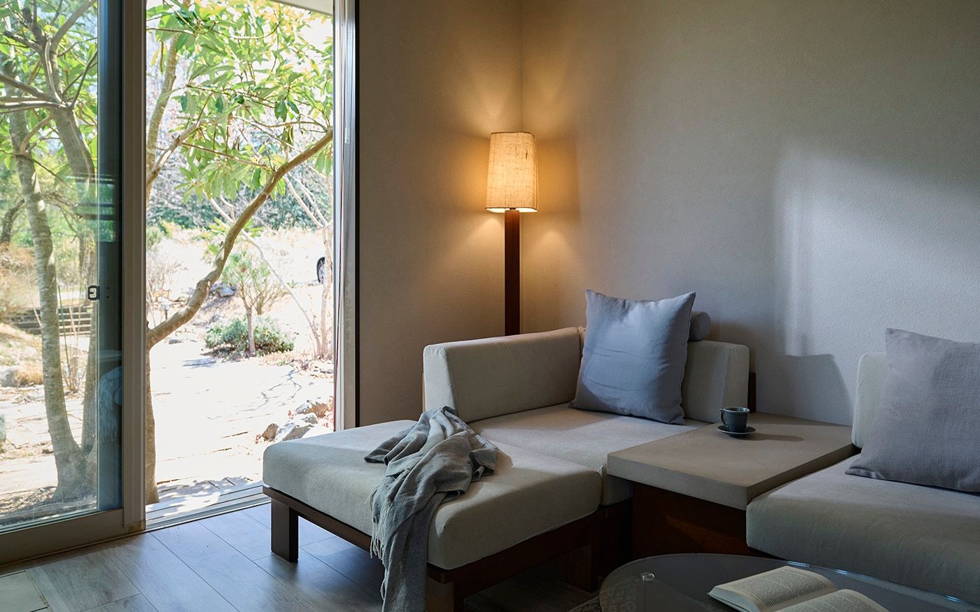 リゾートカフェのようなリラックススペースを演出する、おしゃれな円形カフェテーブルと無垢材チェアをセレクト。自然の温もりを感じる無垢材のチェアは、座るたびに心地よさを感じ、円形テーブルは会話を弾ませるデザインです。別荘ならではの贅沢なひとときを楽しめます。