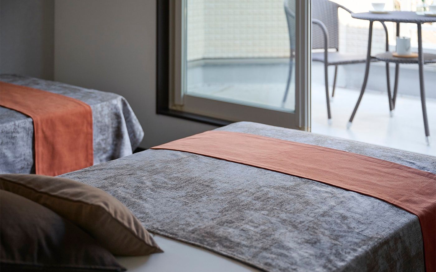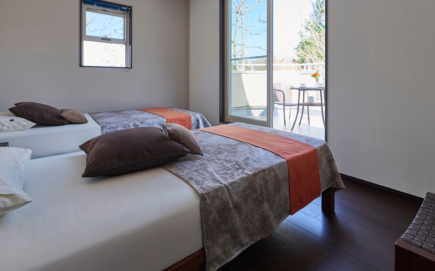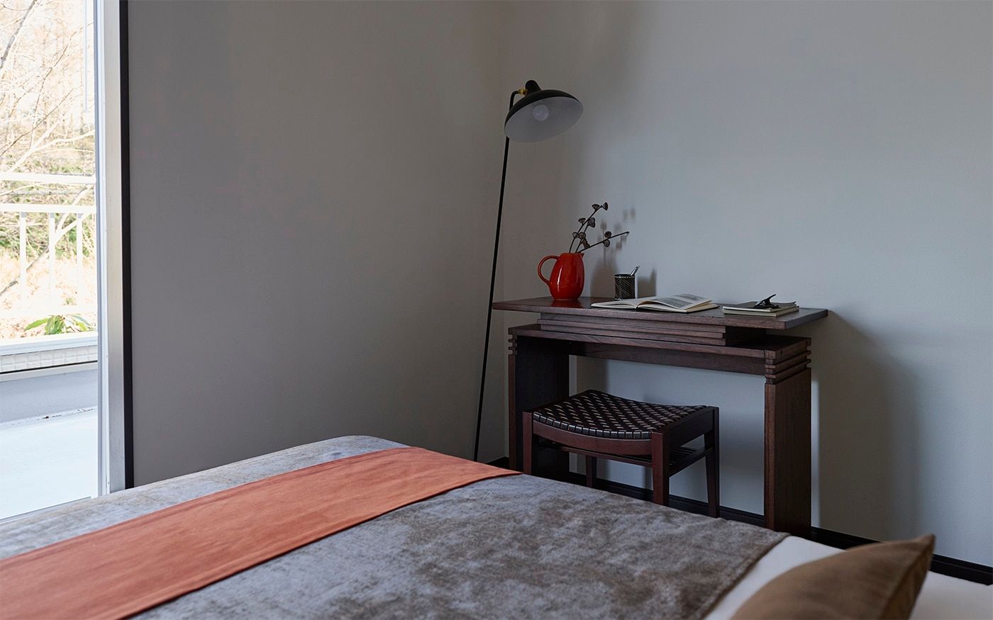 ブラウンとベージュを基調とした寝室は、落ち着きと温かみを感じさせる空間を演出します。そこにオレンジのビタミンカラーをベッドスローとして取り入れることで、別荘ならではの非日常感を楽しむことができます。オレンジのアクセントが、視覚的な刺激を与え、心地よいリフレッシュ感をもたらします。