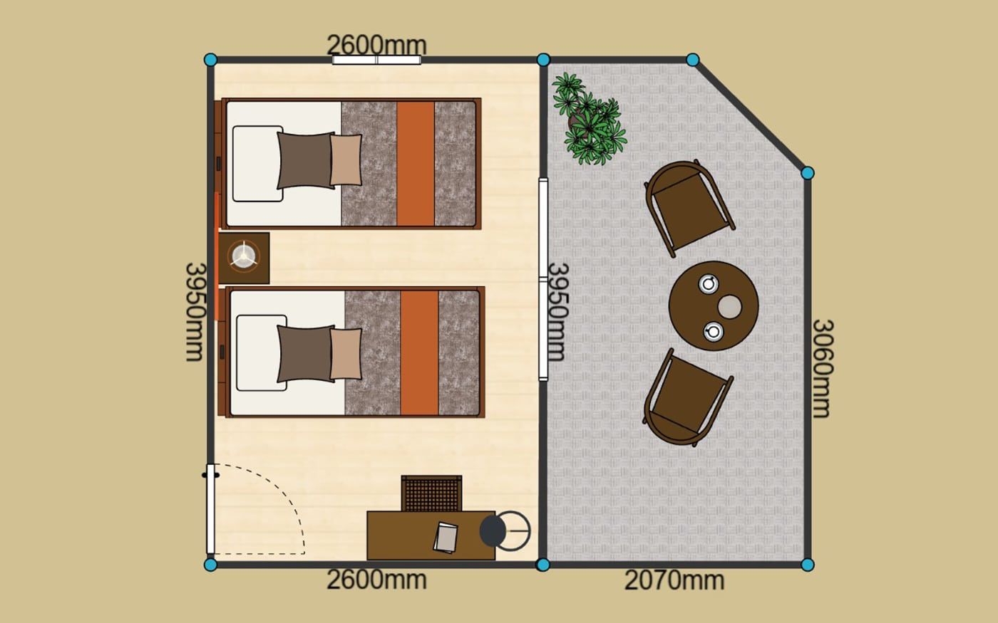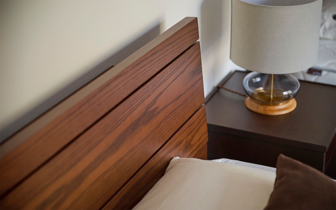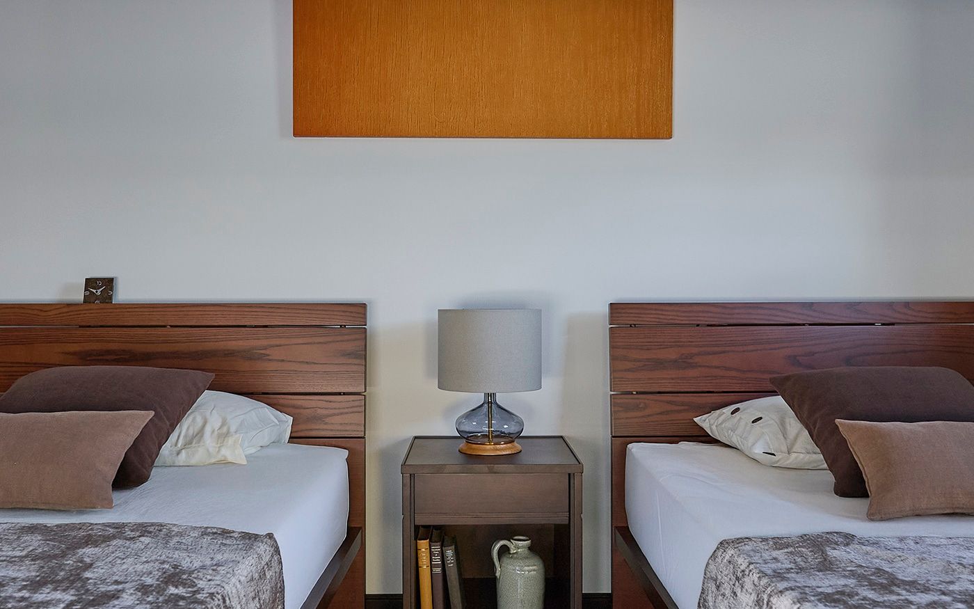 ブラウンとベージュを基調とした寝室は、落ち着きと温かみを感じさせる空間を演出します。そこにオレンジのビタミンカラーをベッドスローとして取り入れることで、別荘ならではの非日常感を楽しむことができます。オレンジのアクセントが、視覚的な刺激を与え、心地よいリフレッシュ感をもたらします。
