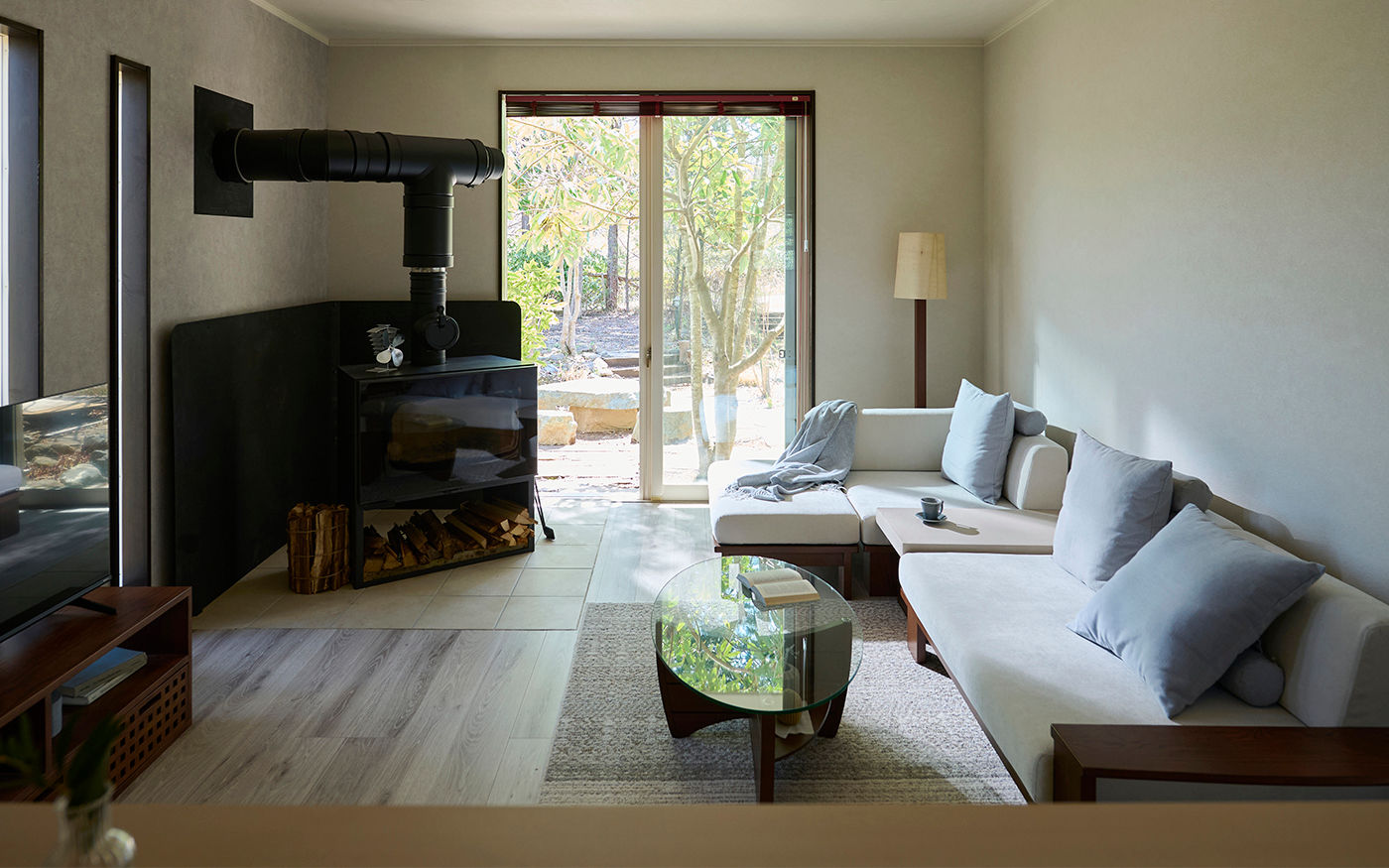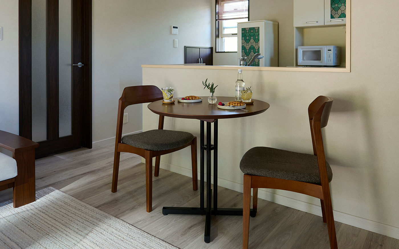 リゾートカフェのようなリラックススペースを演出する、おしゃれな円形カフェテーブルと無垢材チェアをセレクト。自然の温もりを感じる無垢材のチェアは、座るたびに心地よさを感じ、円形テーブルは会話を弾ませるデザインです。別荘ならではの贅沢なひとときを楽しめます。