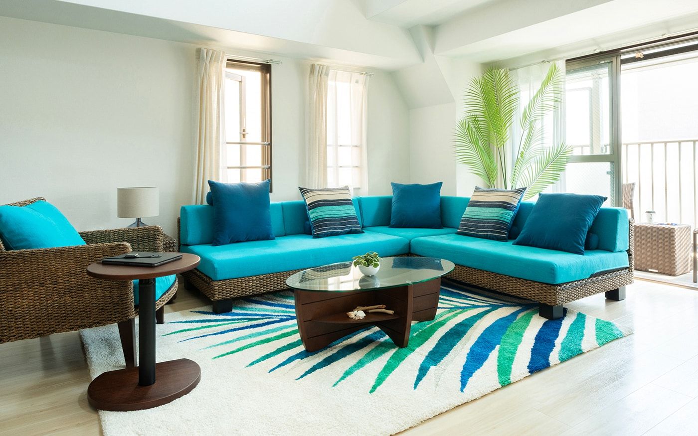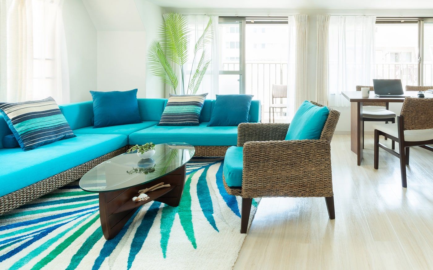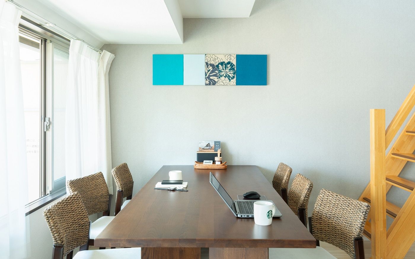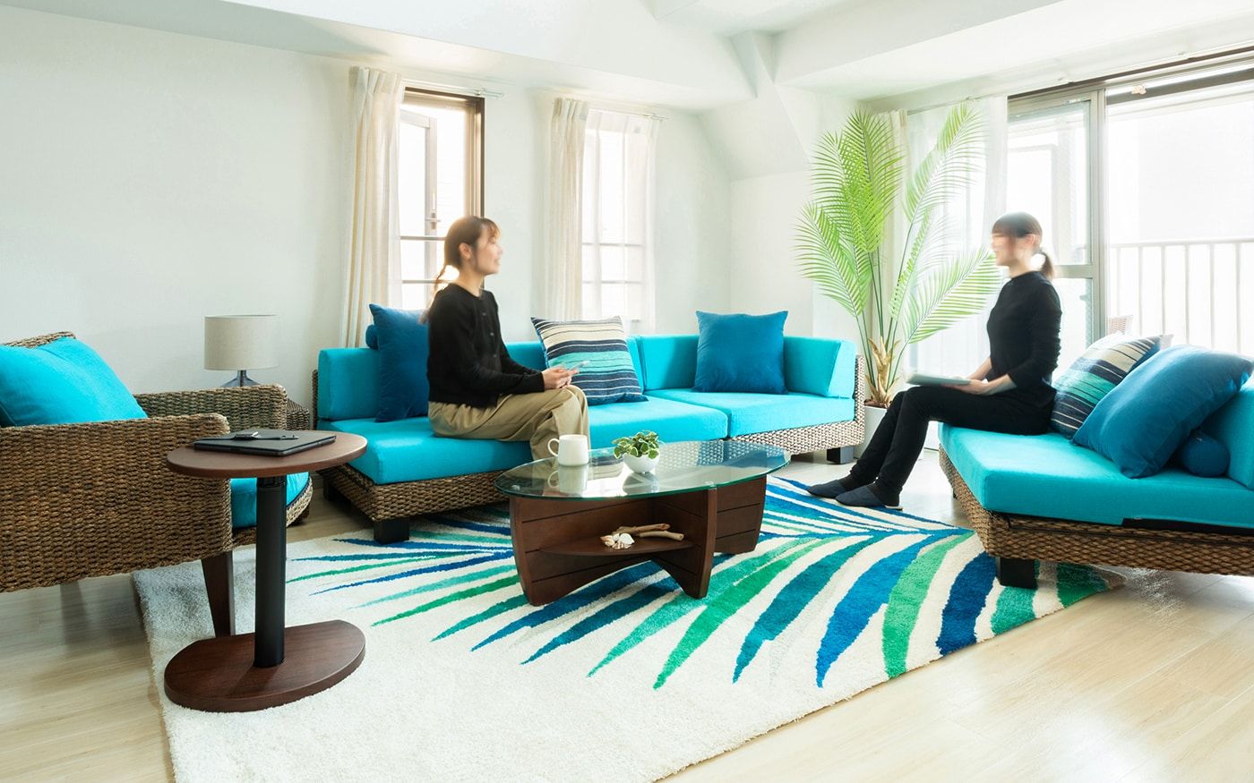 会社のロゴカラーイメージと社員が寛げる空間をイメージしたハワイのリゾート感を取り入れたいとのご希望でしたので、鮮やかなブルーのコーディネートをご提案させていただきました。澄んだハワイの海や青空を思わせるターコイズブルーを基調にしたカラーコーデです。