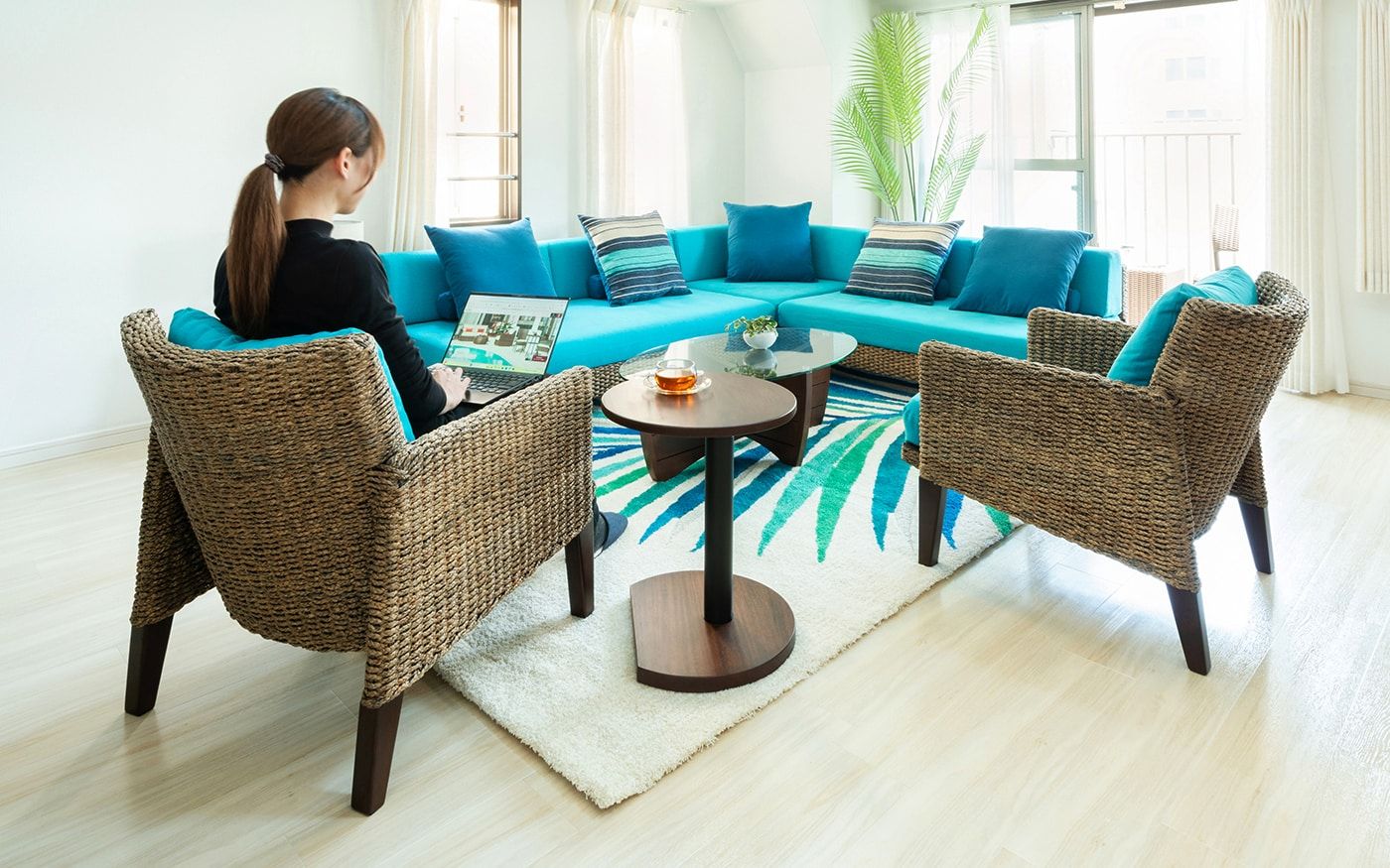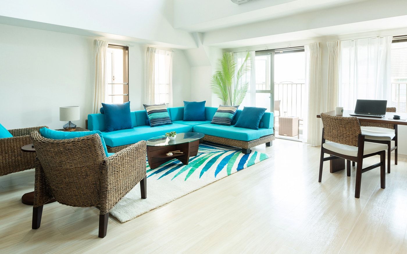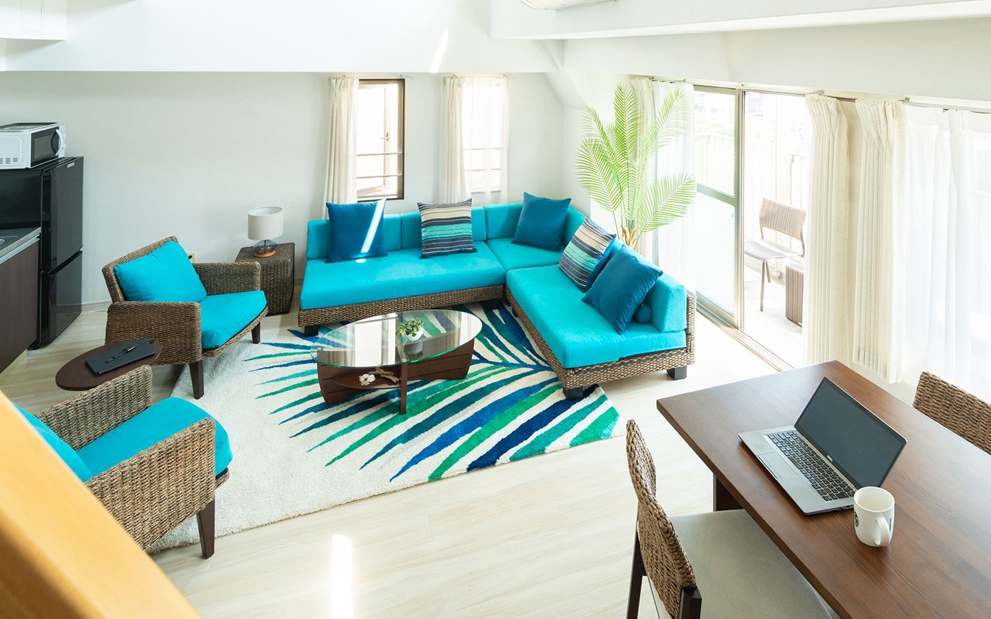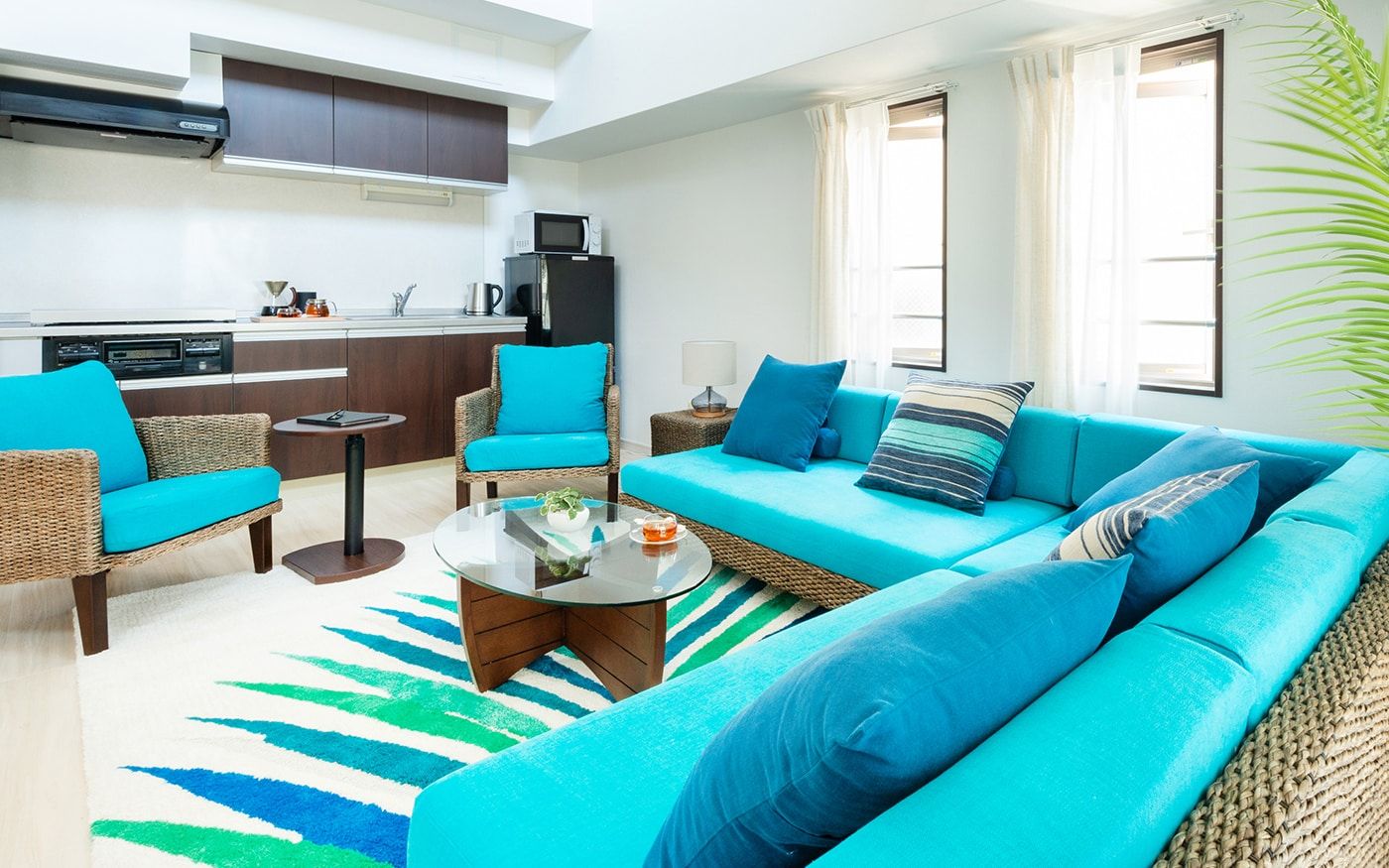 会社のロゴカラーイメージと社員が寛げる空間をイメージしたハワイのリゾート感を取り入れたいとのご希望でしたので、鮮やかなブルーのコーディネートをご提案させていただきました。澄んだハワイの海や青空を思わせるターコイズブルーを基調にしたカラーコーデです。