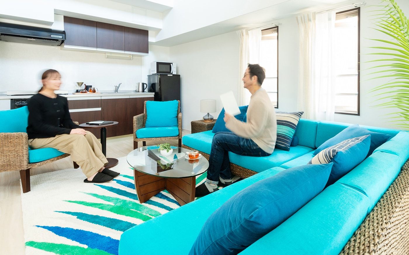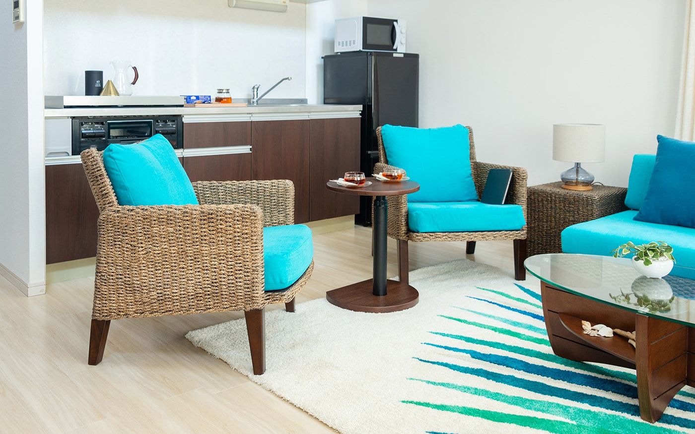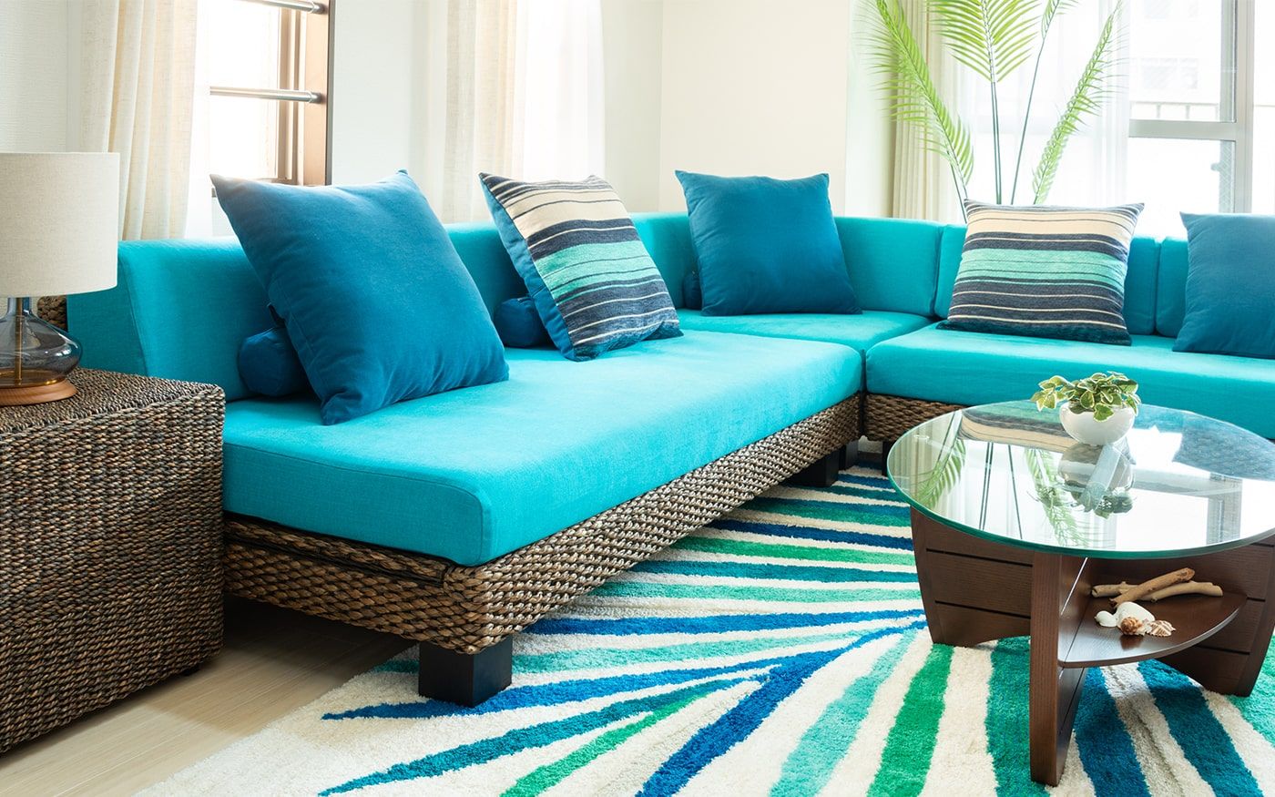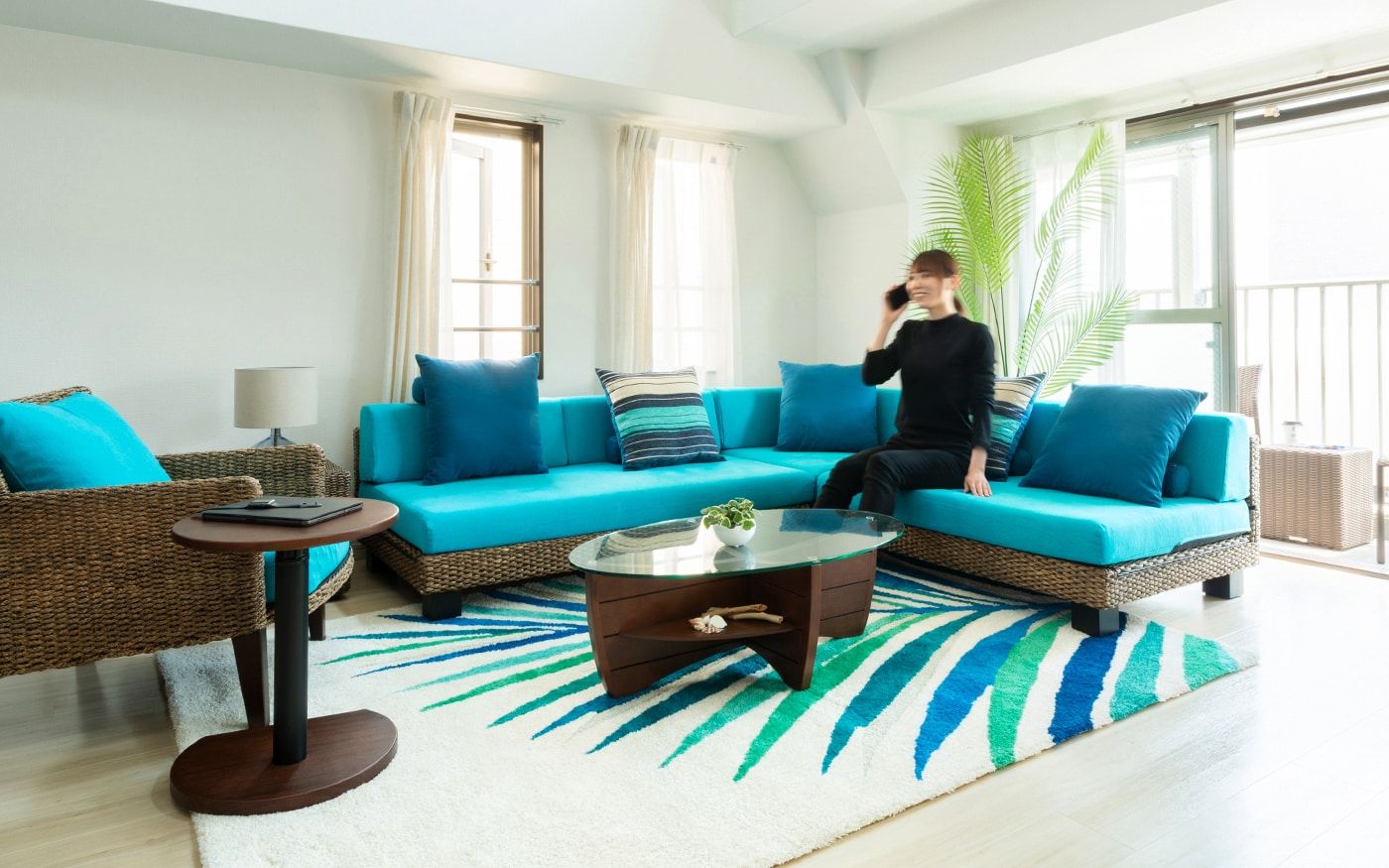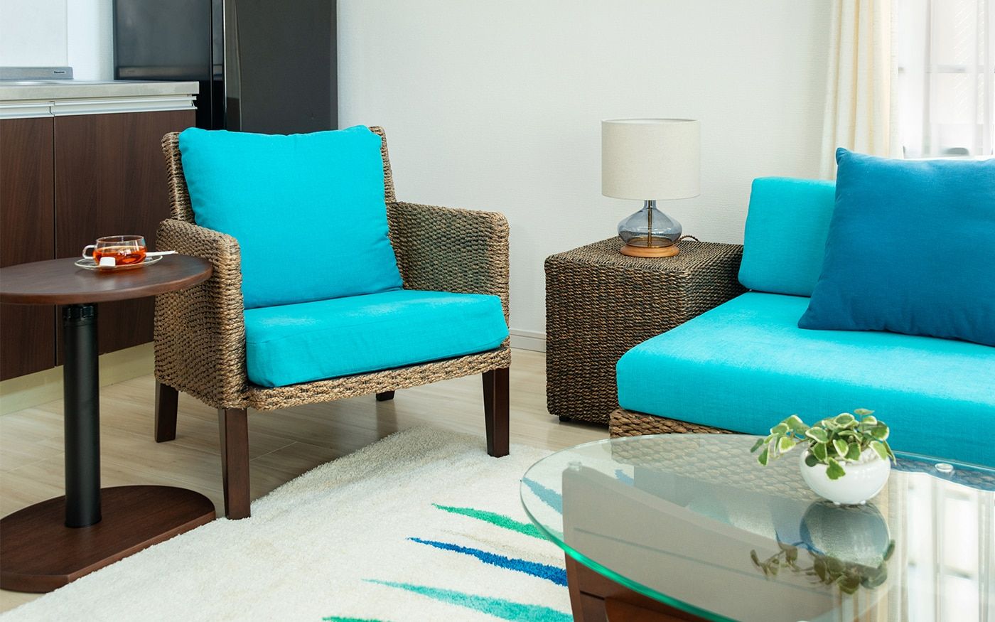 会社のロゴカラーイメージと社員が寛げる空間をイメージしたハワイのリゾート感を取り入れたいとのご希望でしたので、鮮やかなブルーのコーディネートをご提案させていただきました。澄んだハワイの海や青空を思わせるターコイズブルーを基調にしたカラーコーデです。
