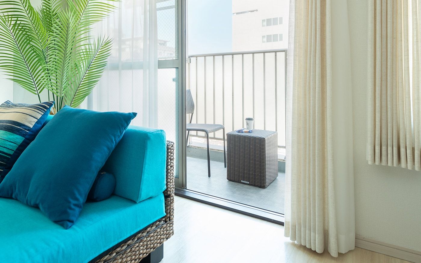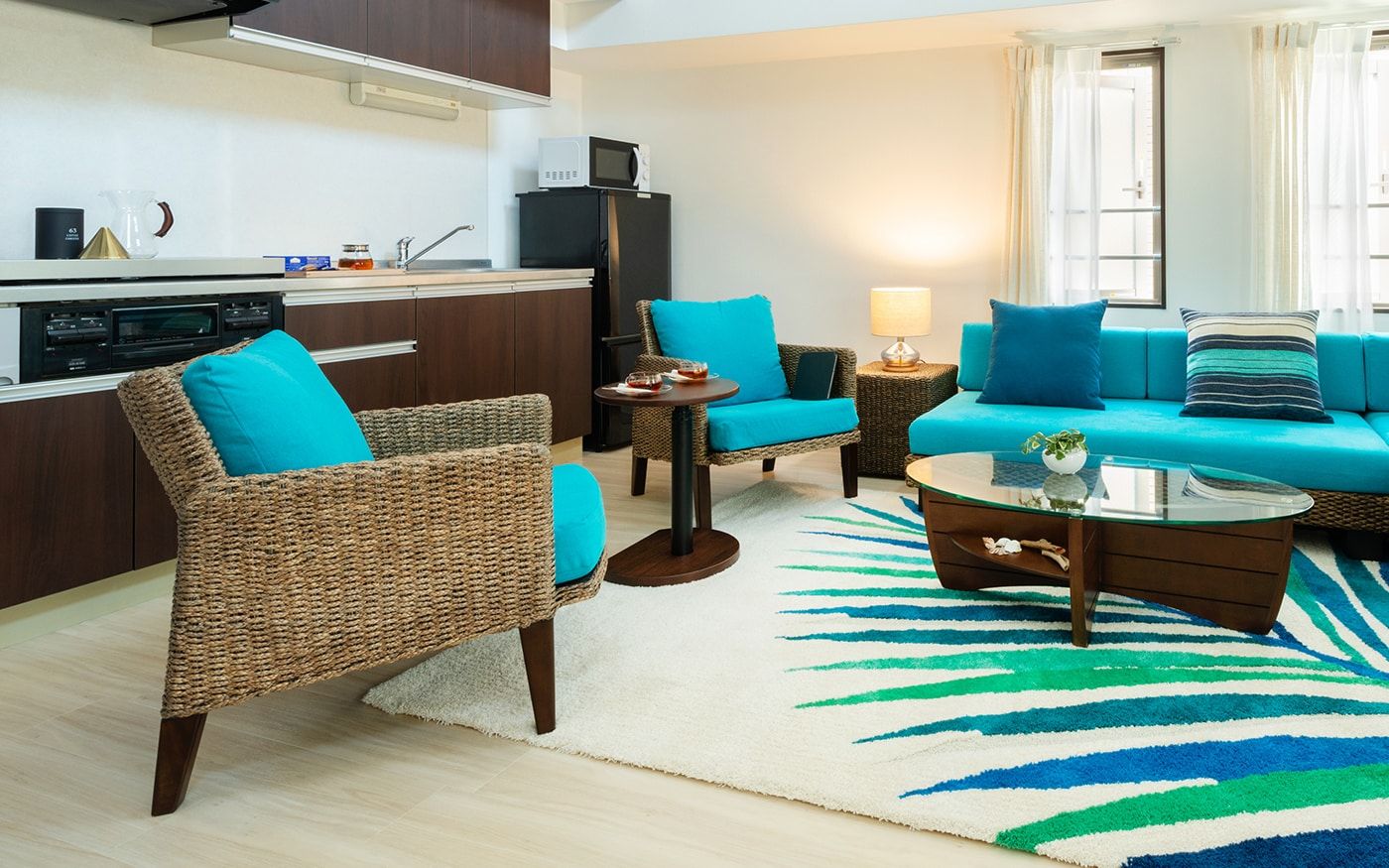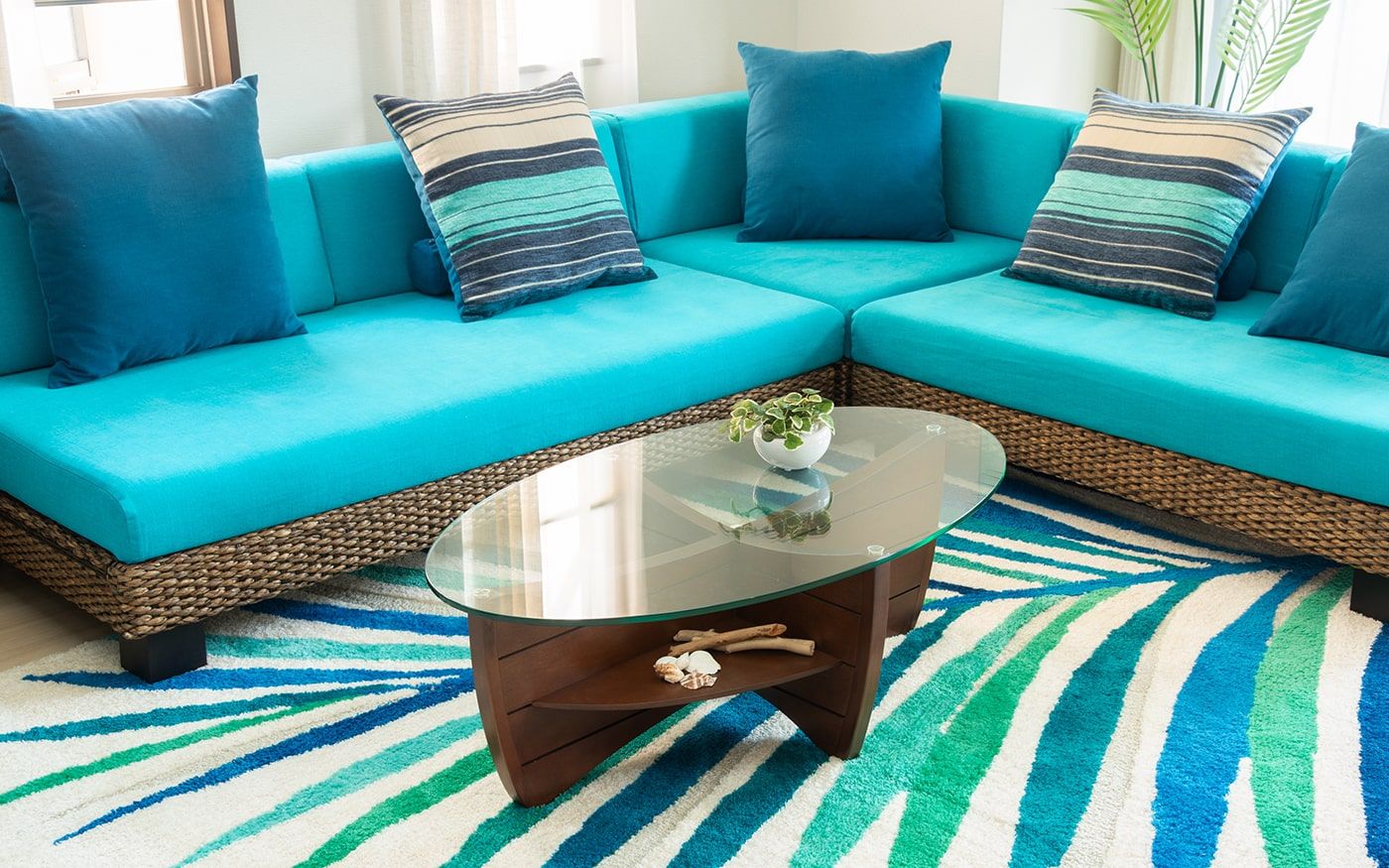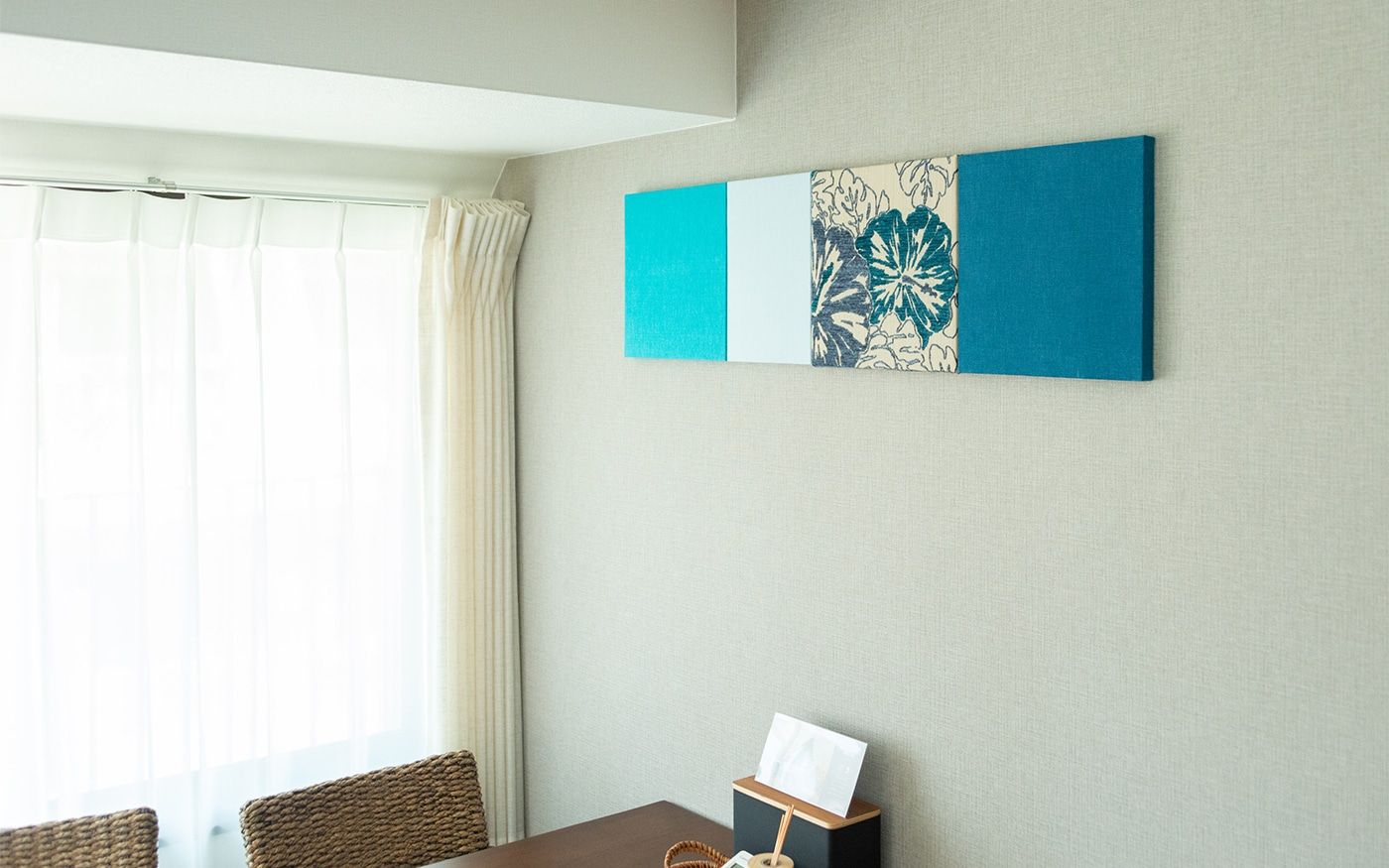会社のロゴカラーイメージと社員が寛げる空間をイメージしたハワイのリゾート感を取り入れたいとのご希望でしたので、鮮やかなブルーのコーディネートをご提案させていただきました。澄んだハワイの海や青空を思わせるターコイズブルーを基調にしたカラーコーデです。