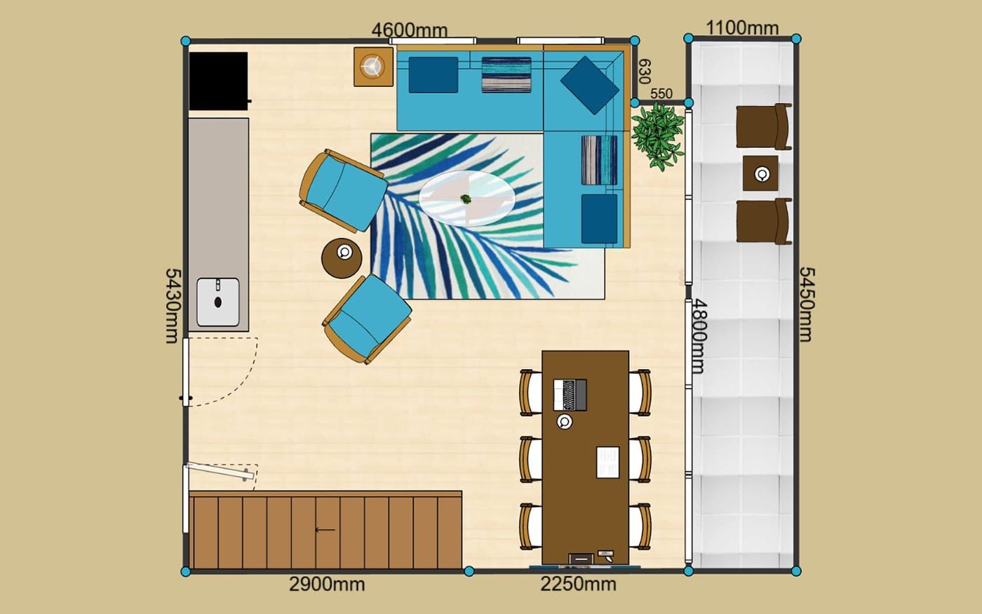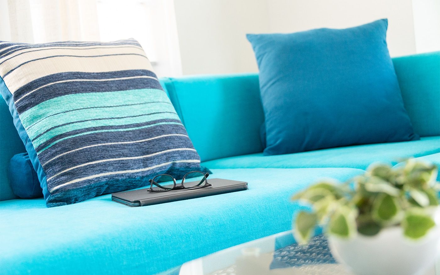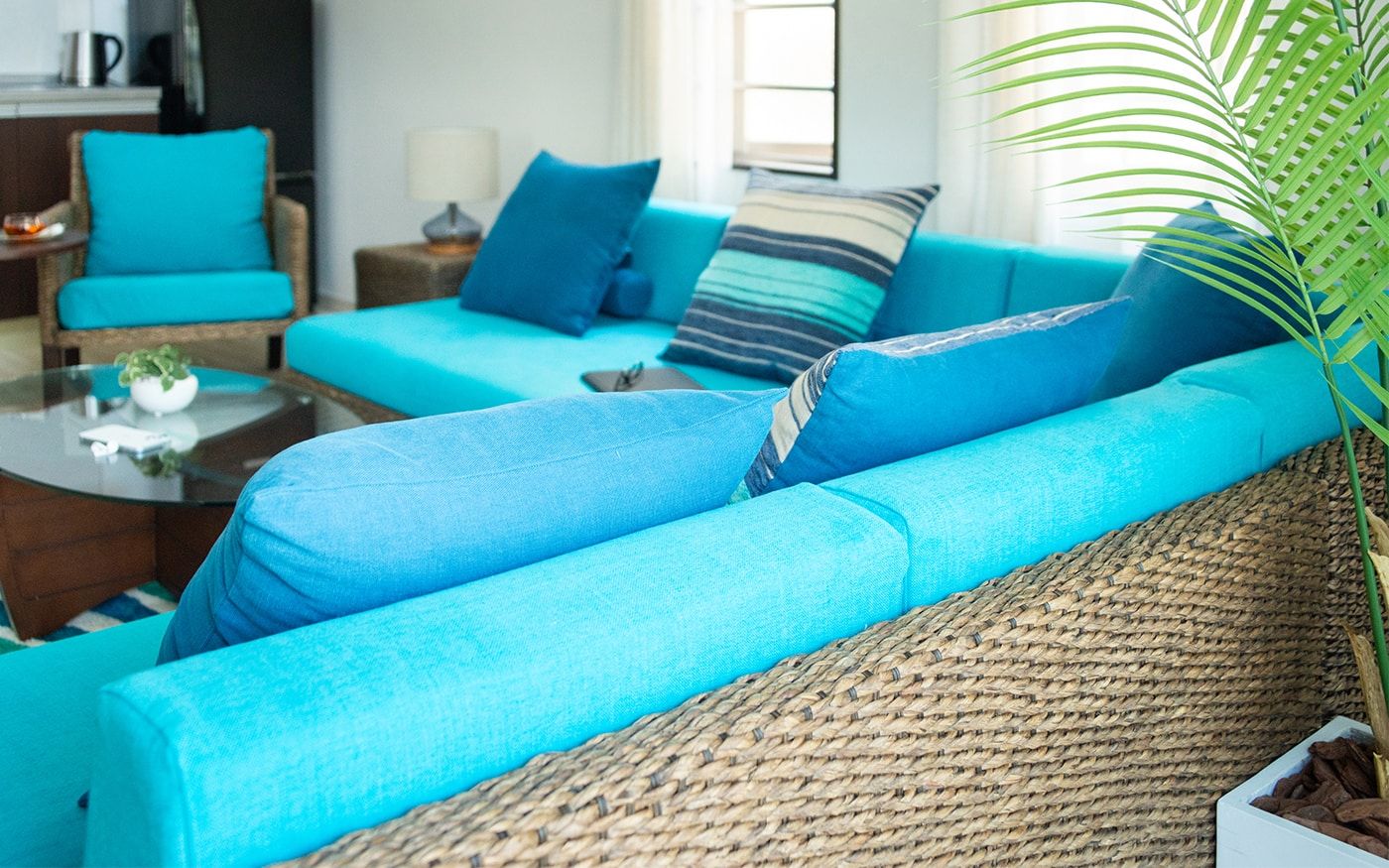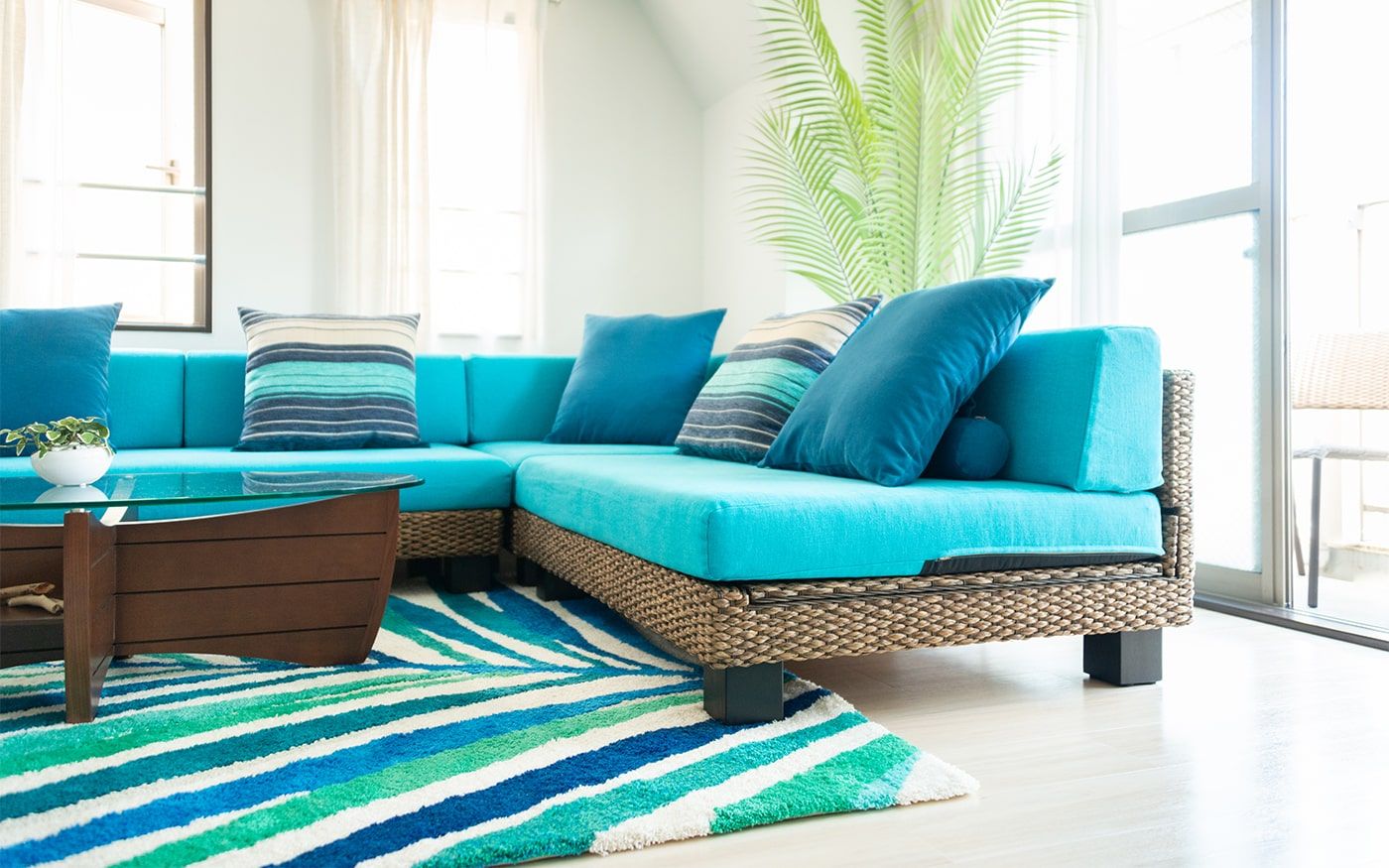 会社のロゴカラーイメージと社員が寛げる空間をイメージしたハワイのリゾート感を取り入れたいとのご希望でしたので、鮮やかなブルーのコーディネートをご提案させていただきました。澄んだハワイの海や青空を思わせるターコイズブルーを基調にしたカラーコーデです。