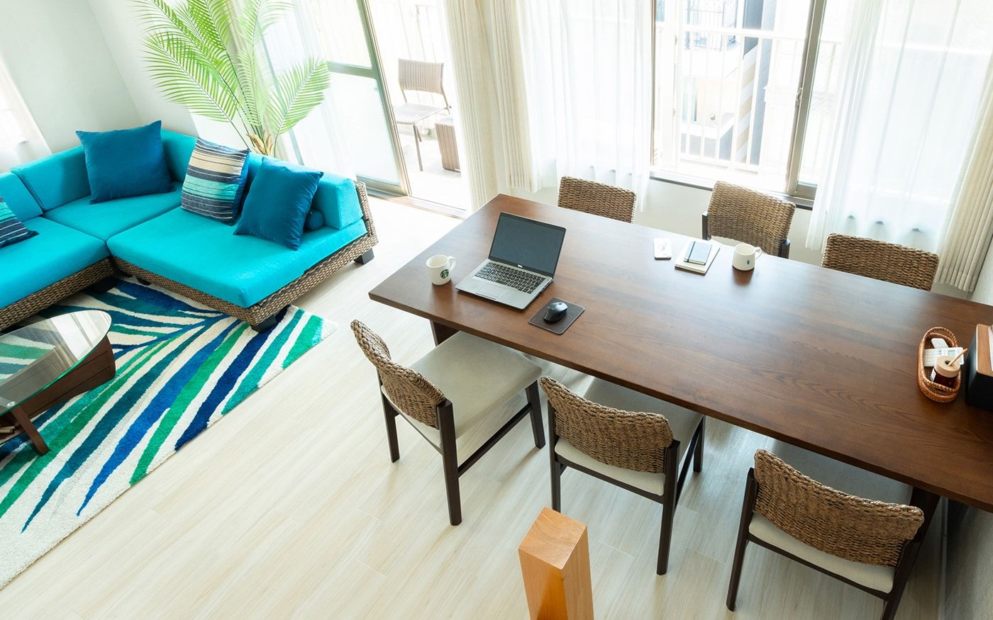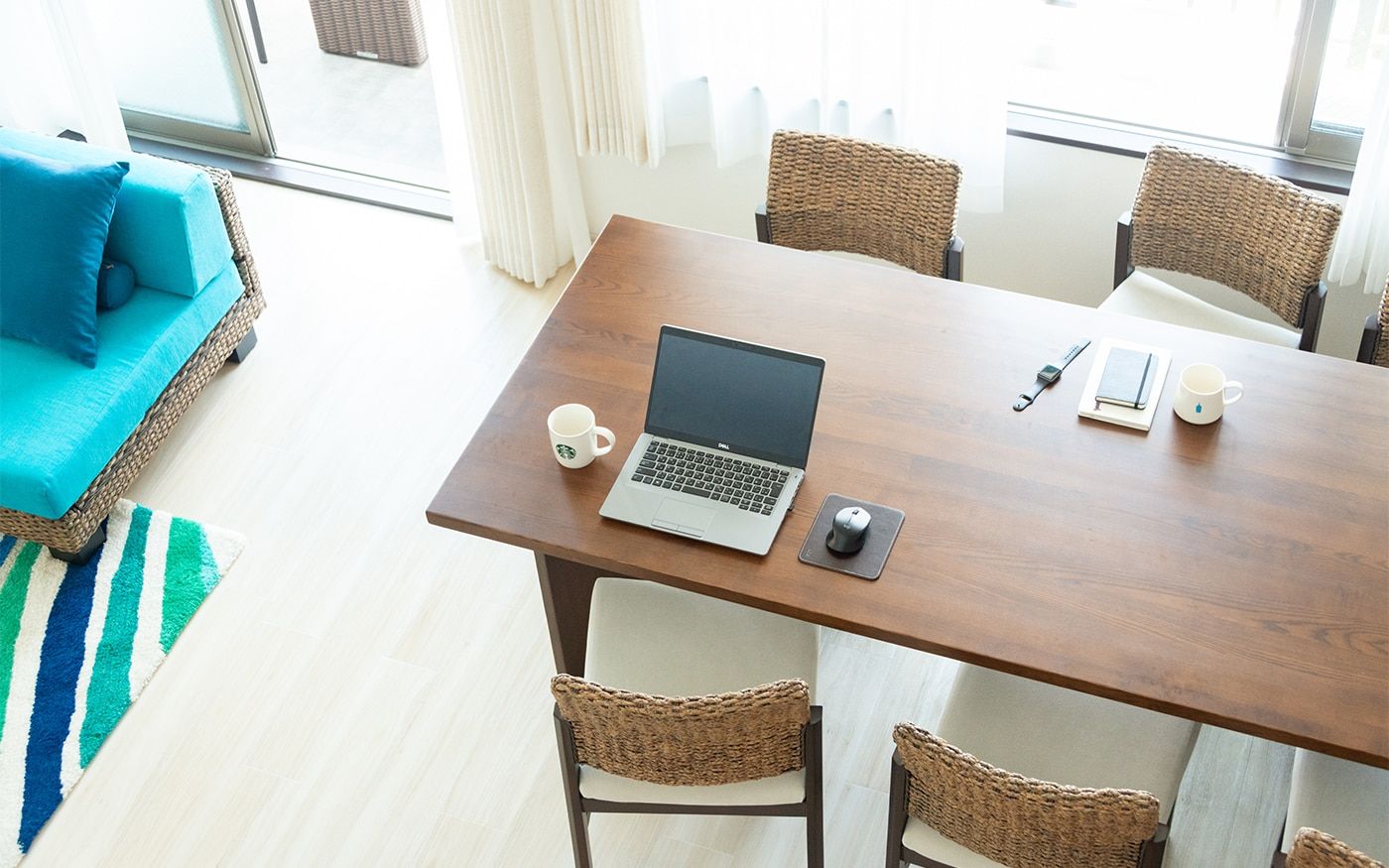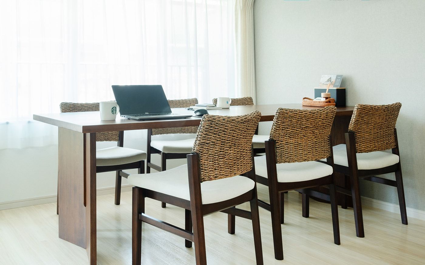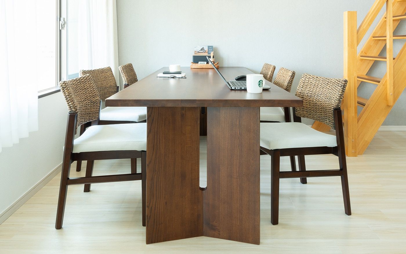横幅2200mmあるダイナミックな天板で広々と作業ができるリゾート風のテーブルセット。広いテーブルは打合せや食事、休憩の時間を快適に過ごすのに最適です。心地よい空間で、リラックスしながら効率的に業務を進められます。