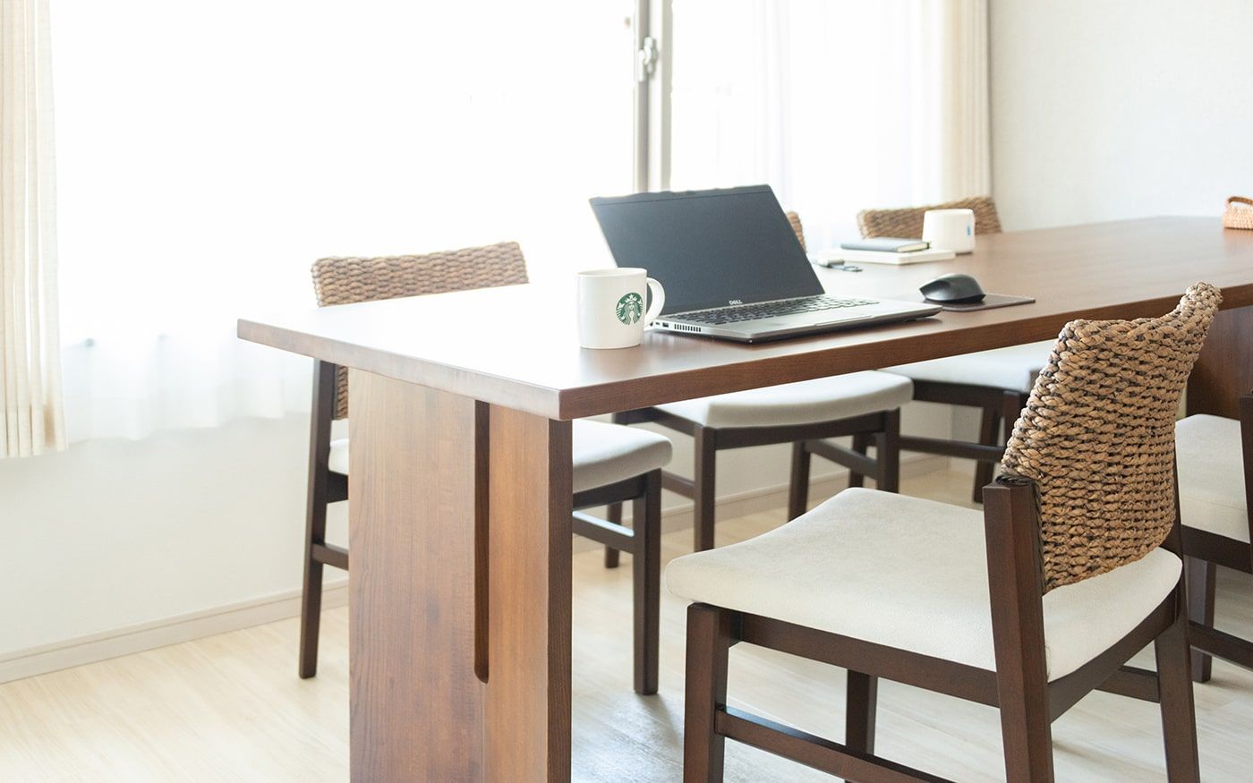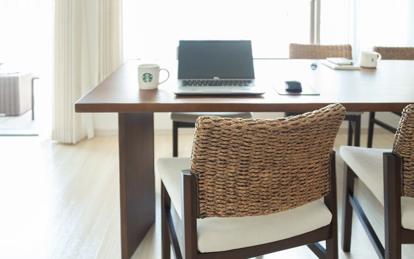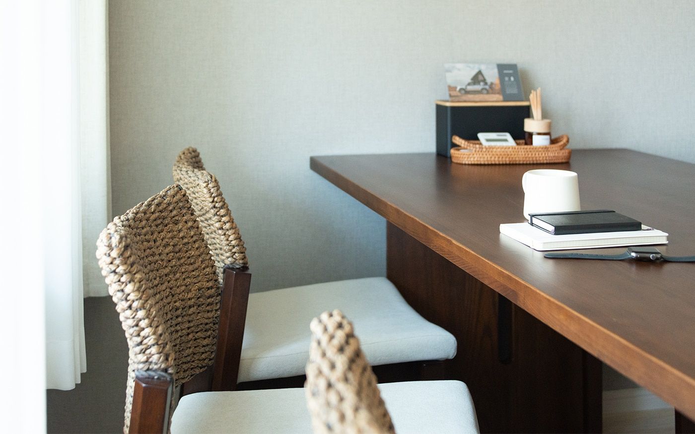 横幅2200mmあるダイナミックな天板で広々と作業ができるリゾート風のテーブルセット。広いテーブルは打合せや食事、休憩の時間を快適に過ごすのに最適です。心地よい空間で、リラックスしながら効率的に業務を進められます。