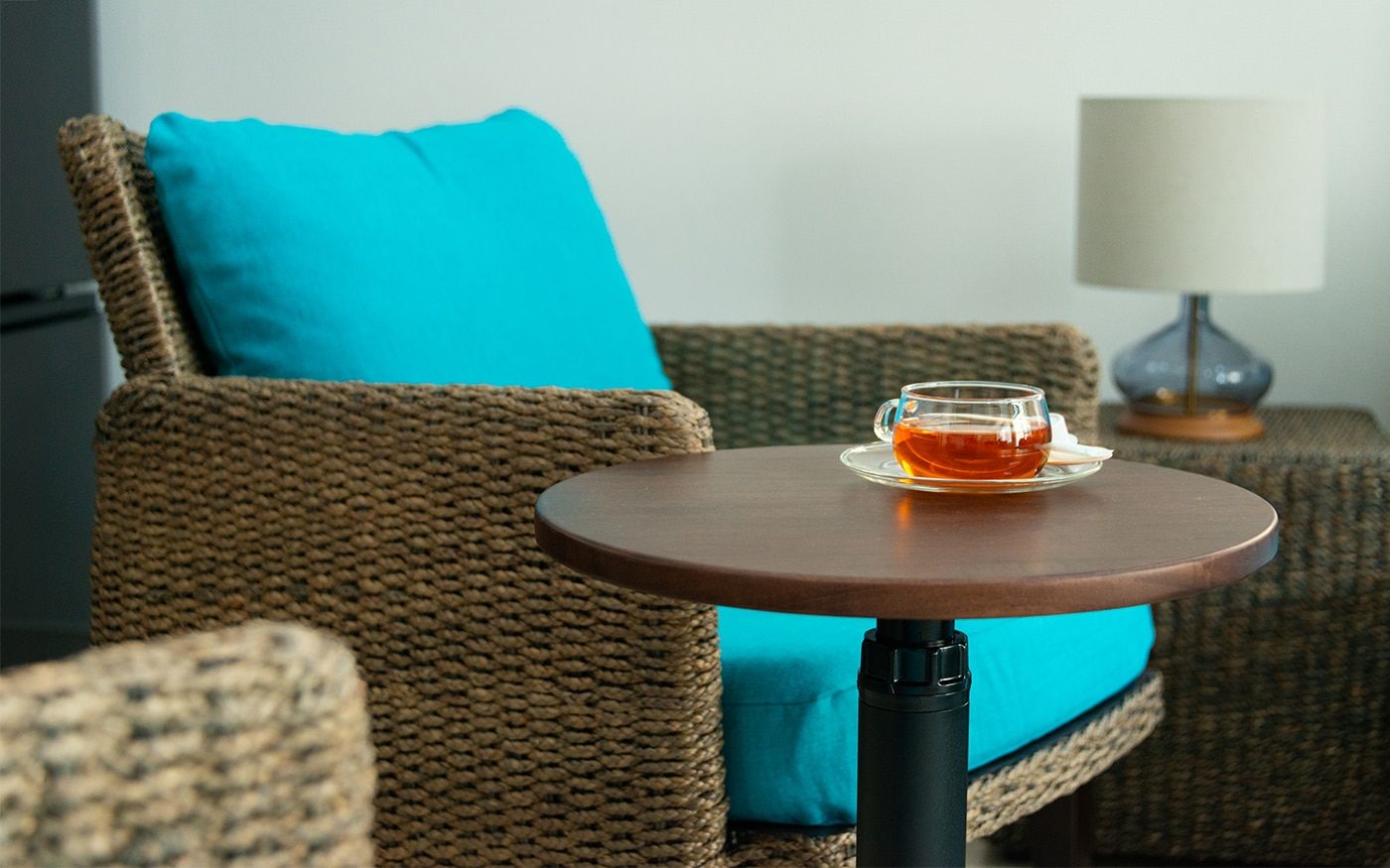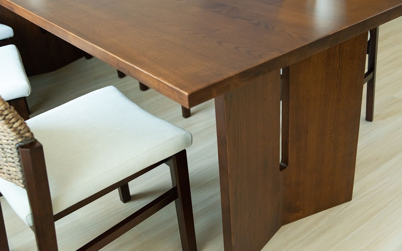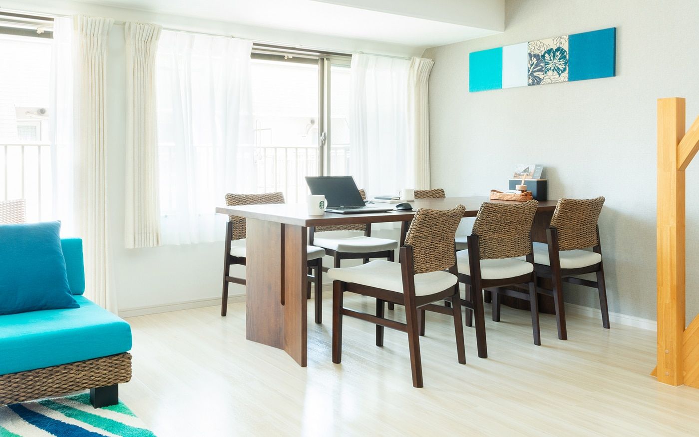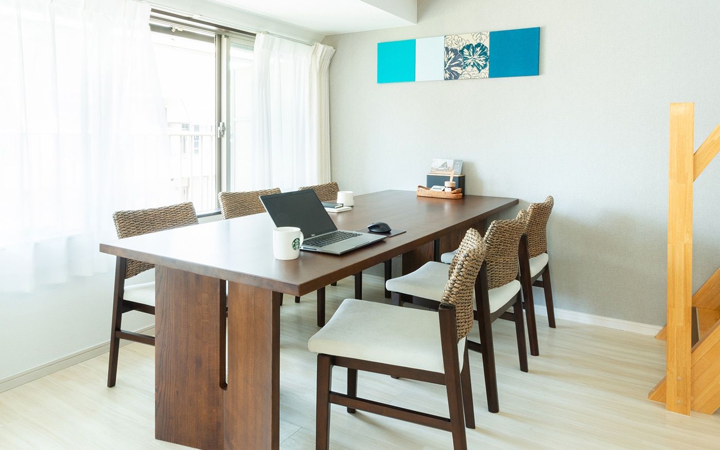 横幅2200mmあるダイナミックな天板で広々と作業ができるリゾート風のテーブルセット。広いテーブルは打合せや食事、休憩の時間を快適に過ごすのに最適です。心地よい空間で、リラックスしながら効率的に業務を進められます。