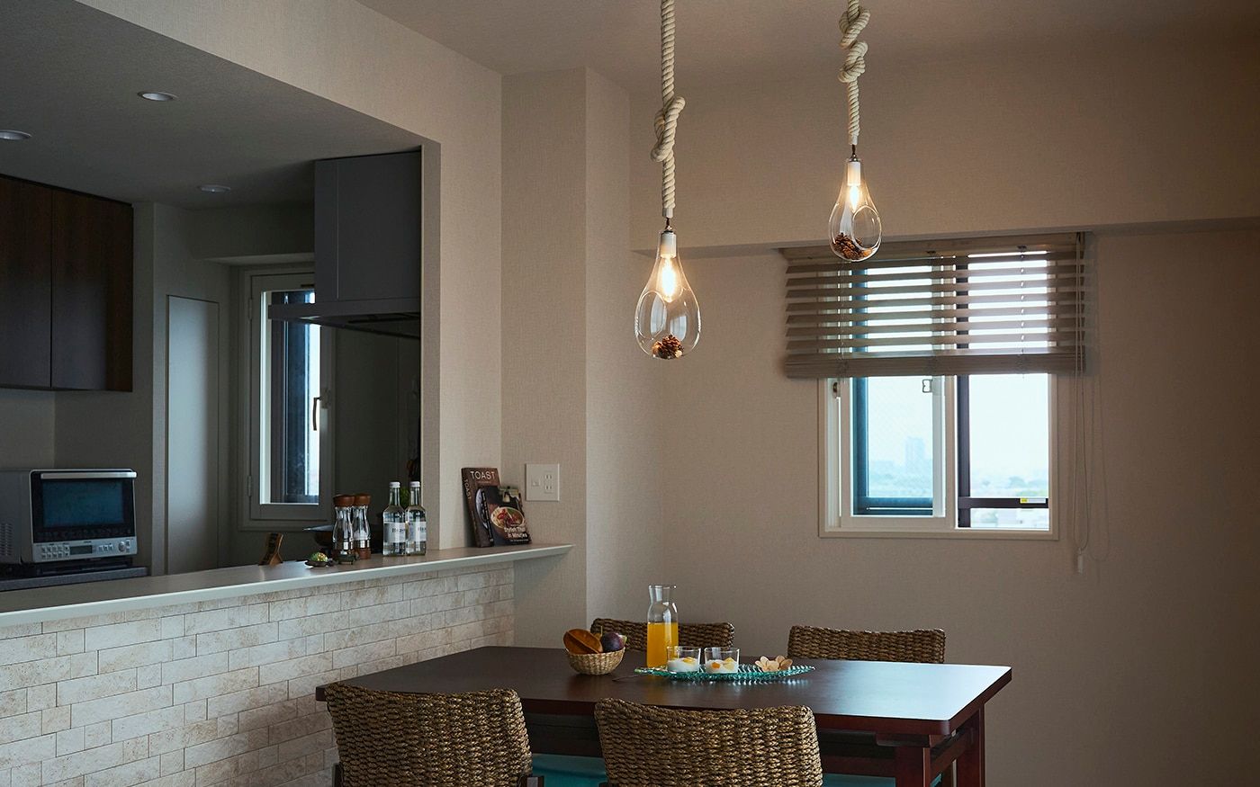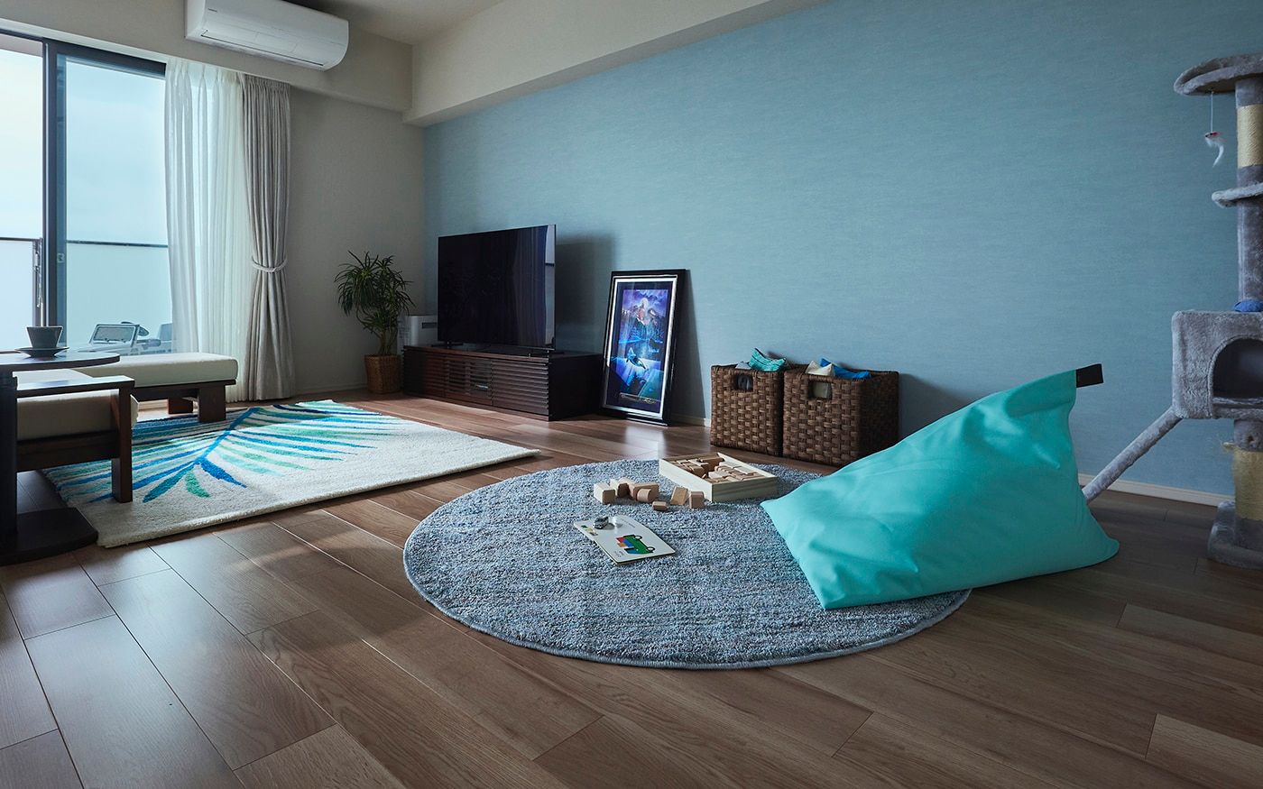 ラッセンのアートカラーを取り入れたハワイアンブルーのインテリアで、海辺にいるかのような爽やかさを演出した実例です。壁に飾られたラッセンの作品が、部屋全体に深い青と鮮やかな色彩をもたらし、リラックスした雰囲気を醸し出しています。家具や小物もブルー系で統一し、小さいお子様とも心地よく過ごせる空間を作り上げました。