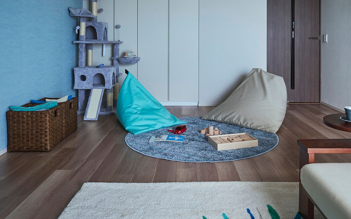 小さなお子様や猫ちゃんとの暮らしを大切にするためには、ロースタイルの家具が安心です。ビーズクッションやラグを敷くことで、床座の生活をリビングに取り入れ、家族全員がリラックスできる空間に。転倒のリスクを減らし、お子様も自由に動き回れる快適な環境が整うでしょう。