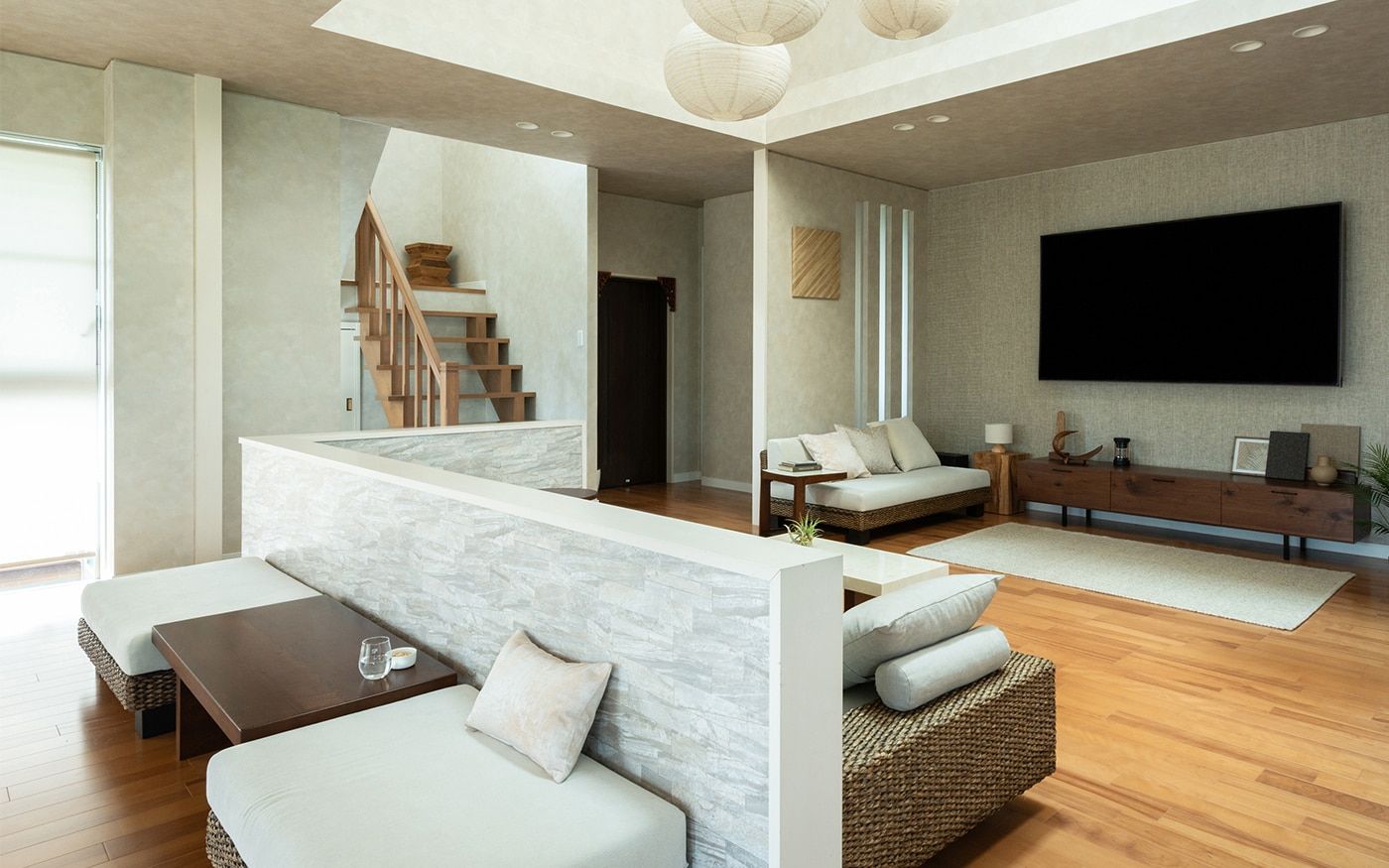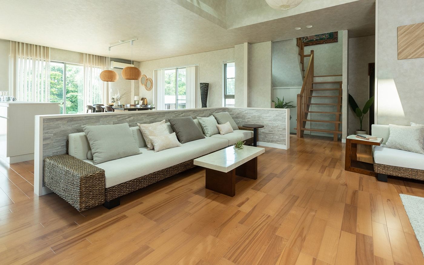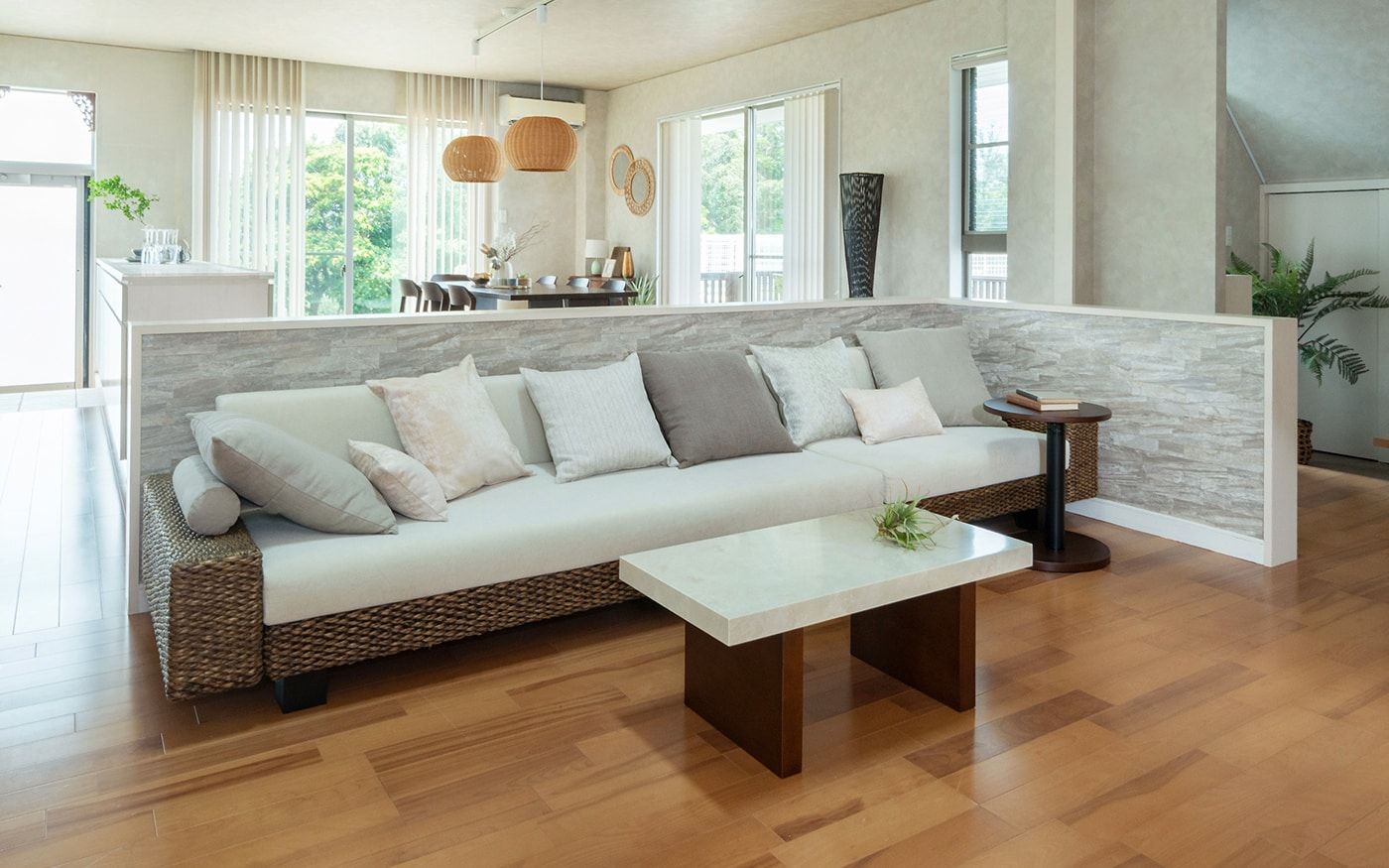 アースカラーであるベージュ・ブラウンなどのナチュラルカラーを取り入れることでお部屋に白浜リゾートの浜辺や土、木々を連想させる効果があるため、自然の情景を切り取ったようなリビングが完成します。