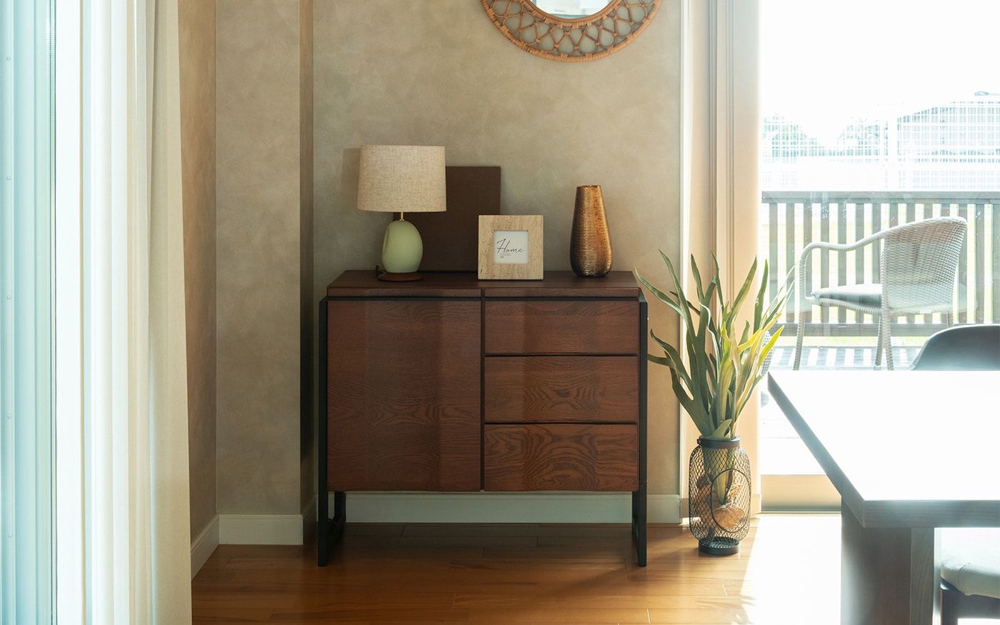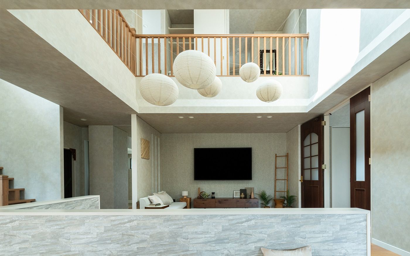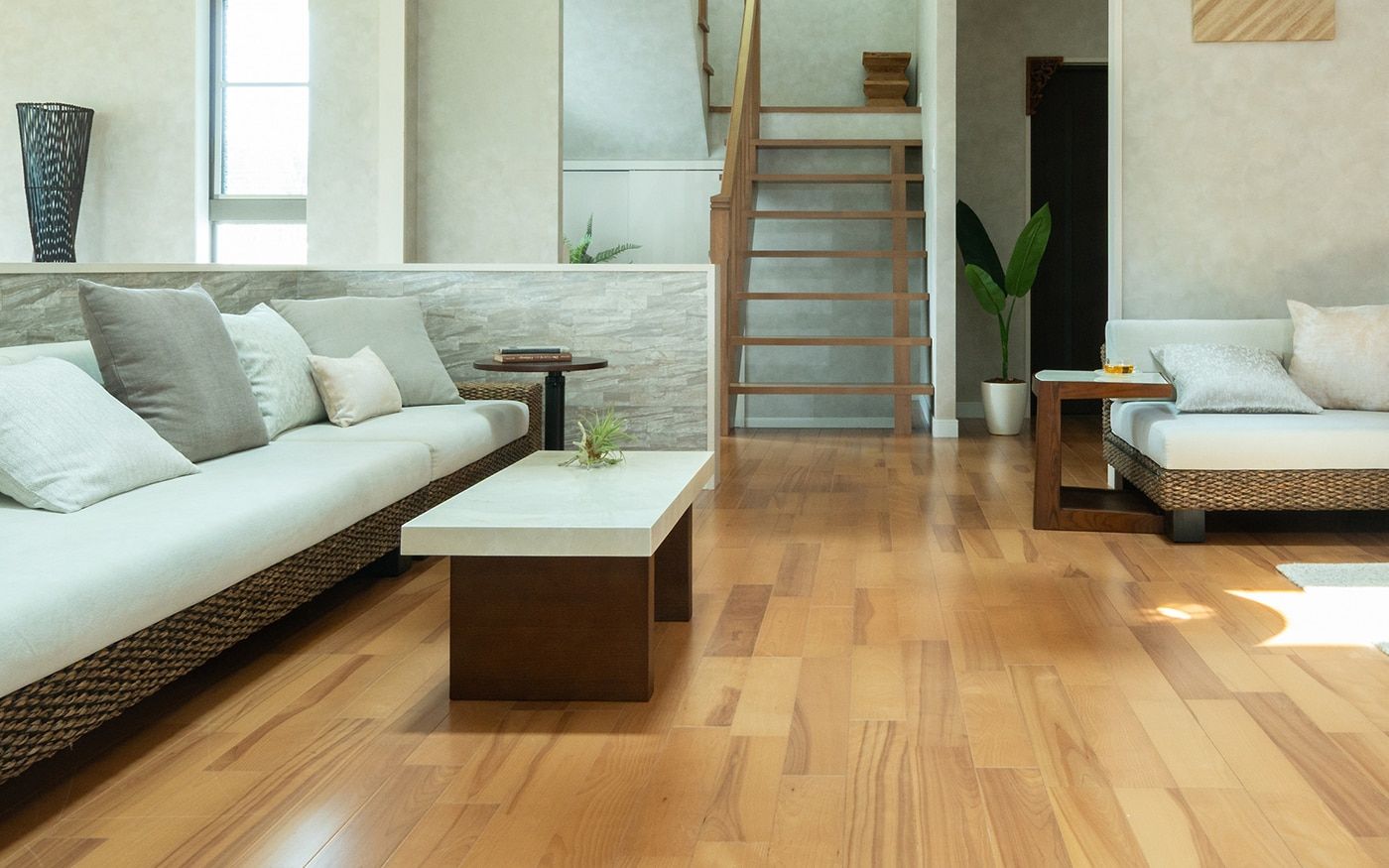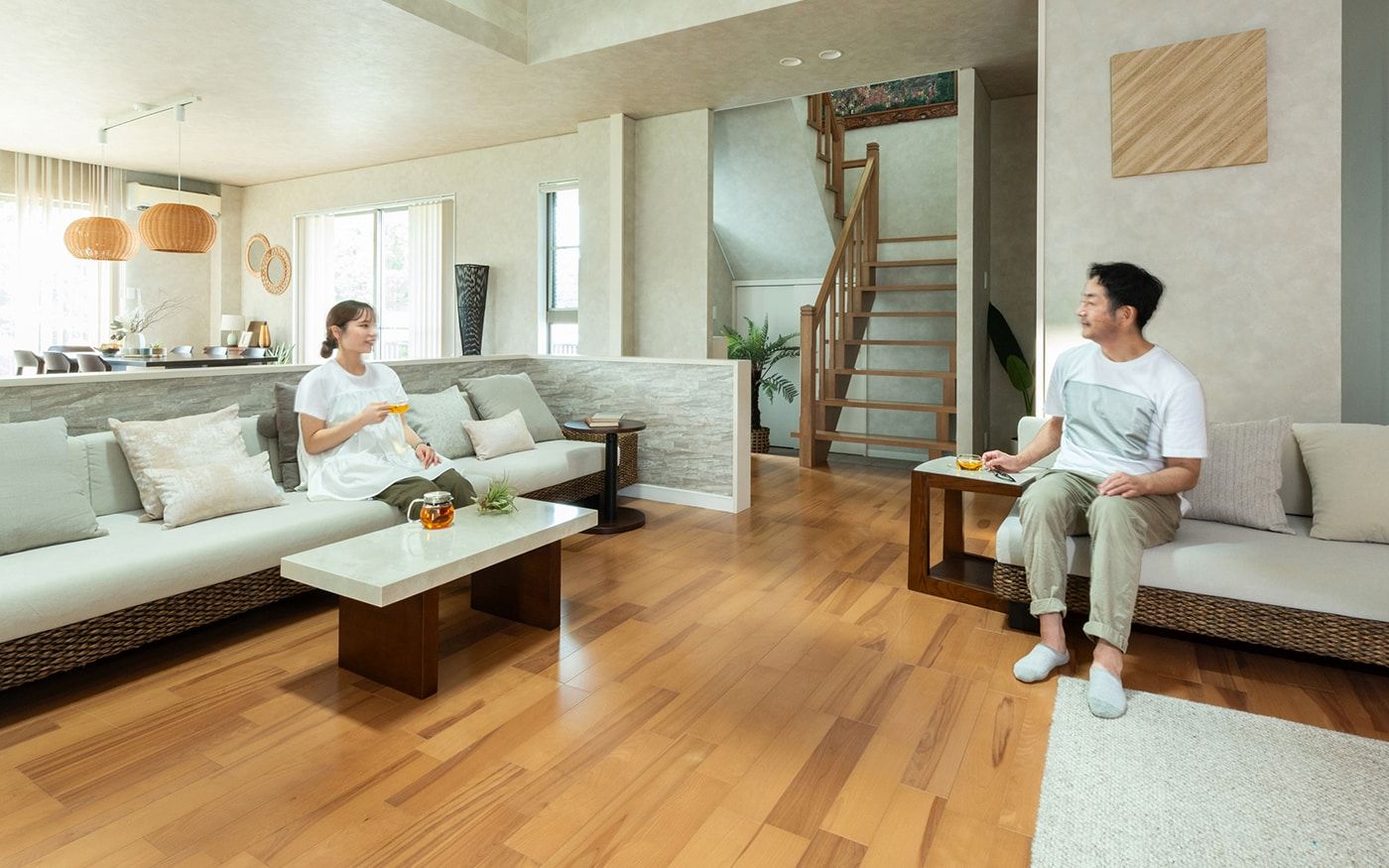 アースカラーであるベージュ・ブラウンなどのナチュラルカラーを取り入れることでお部屋に白浜リゾートの浜辺や土、木々を連想させる効果があるため、自然の情景を切り取ったようなリビングが完成します。