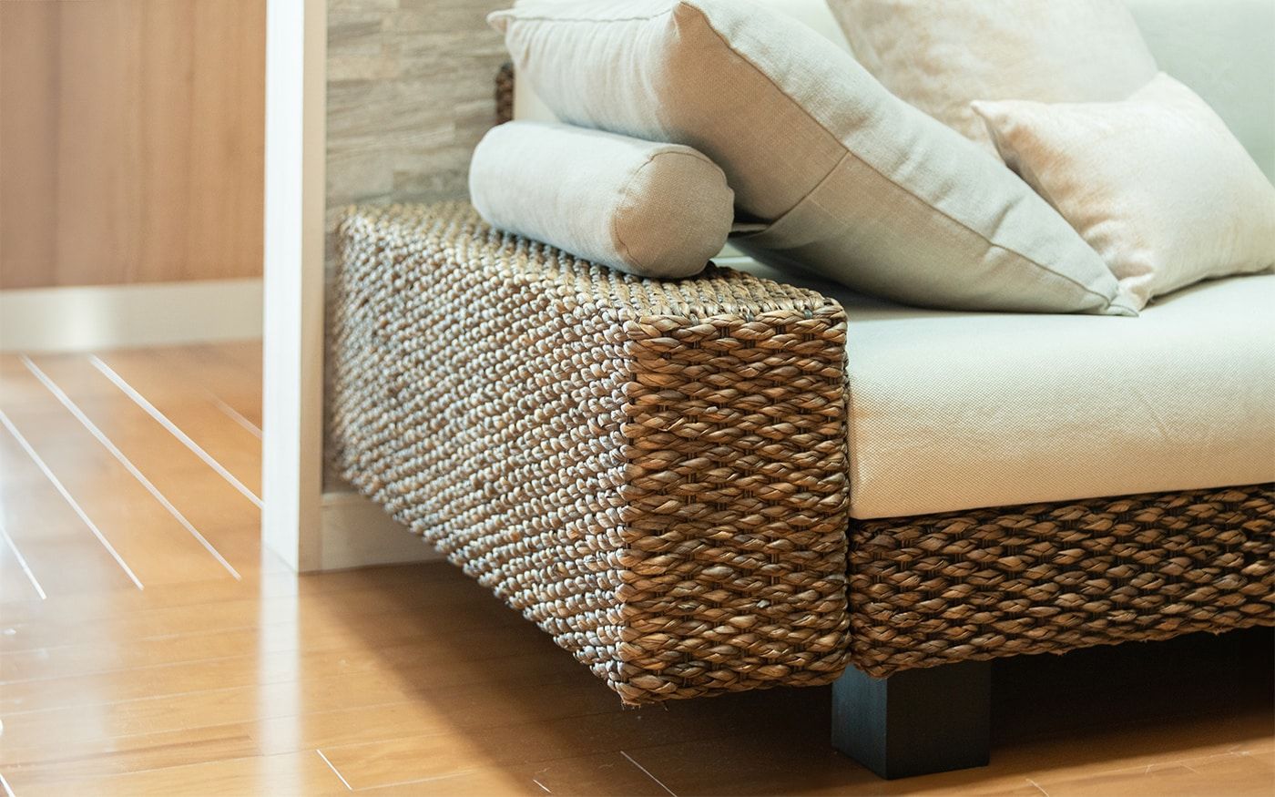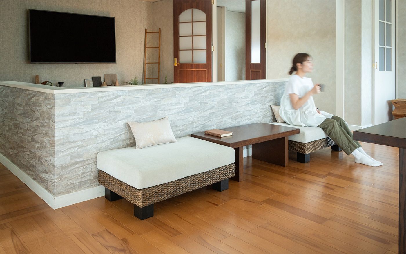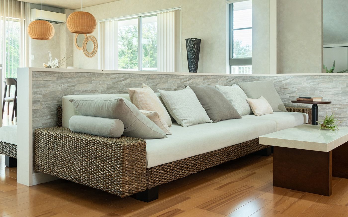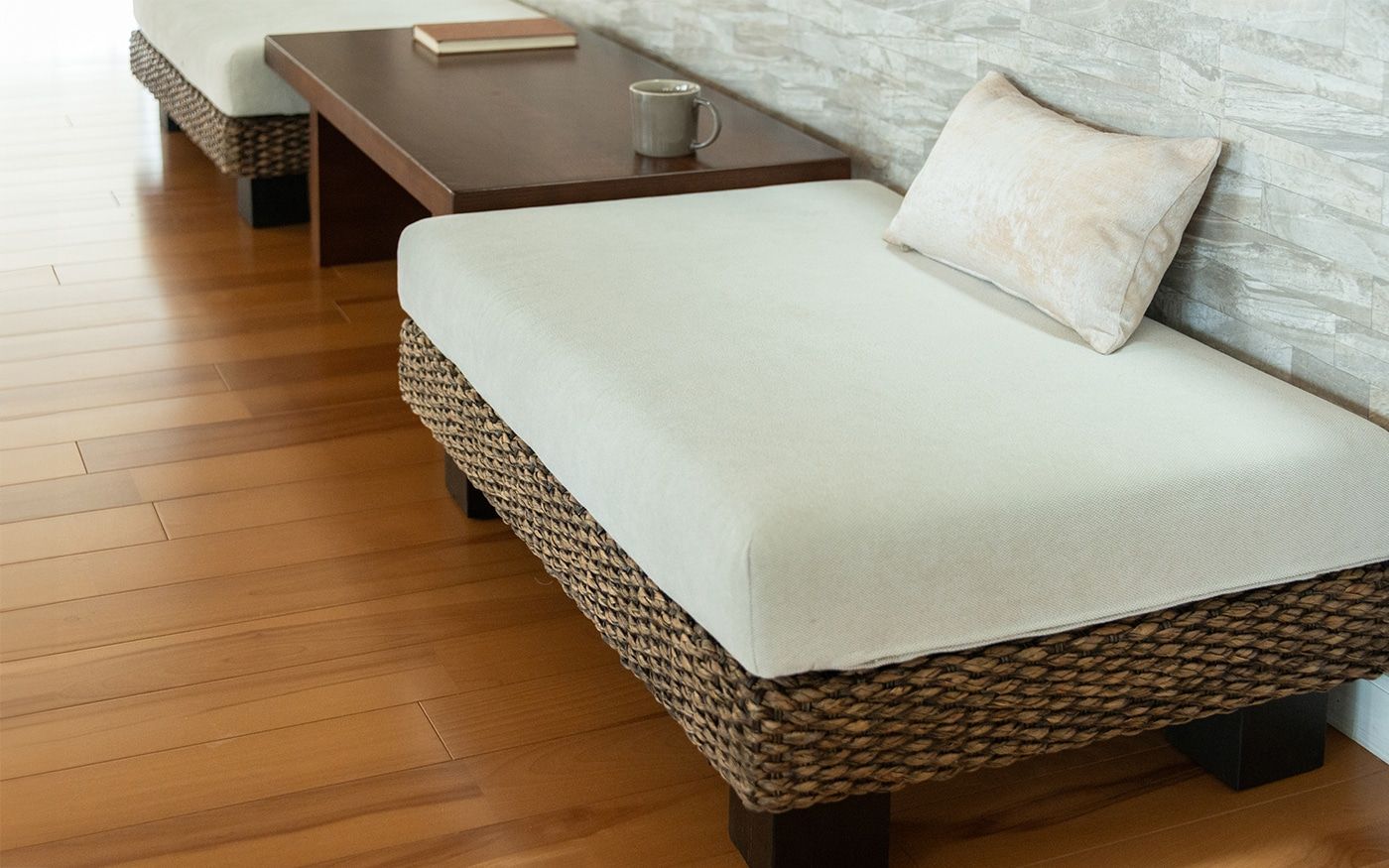 ソファスペースの裏側に同素材のオットマンを2台とローテーブルを組み合わせて配置することで、寛ぎスペースが広がったような非日常感のある空間に。同素材で統一感も出しつつ、快適さを増すことが可能です。