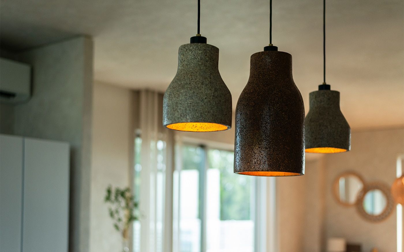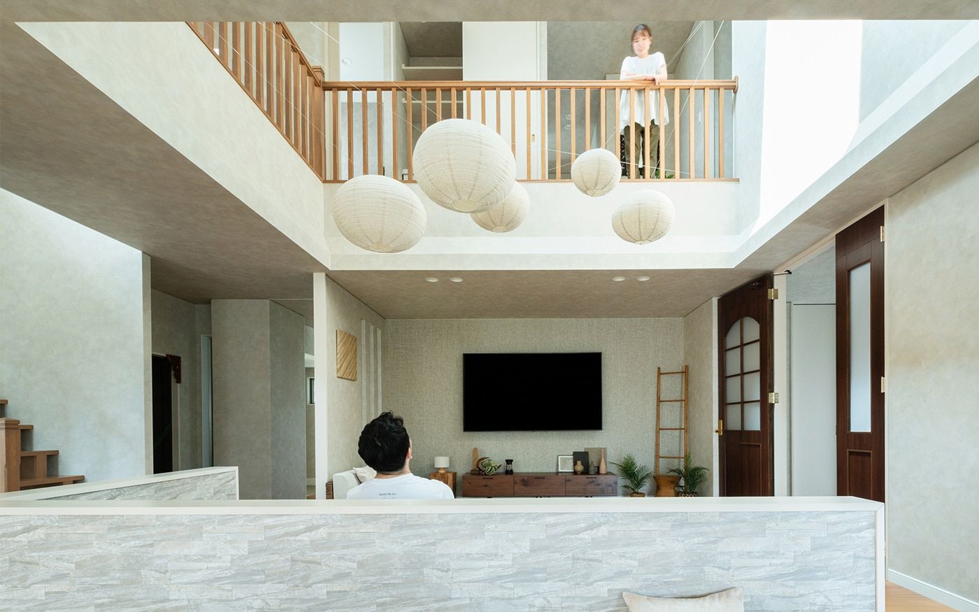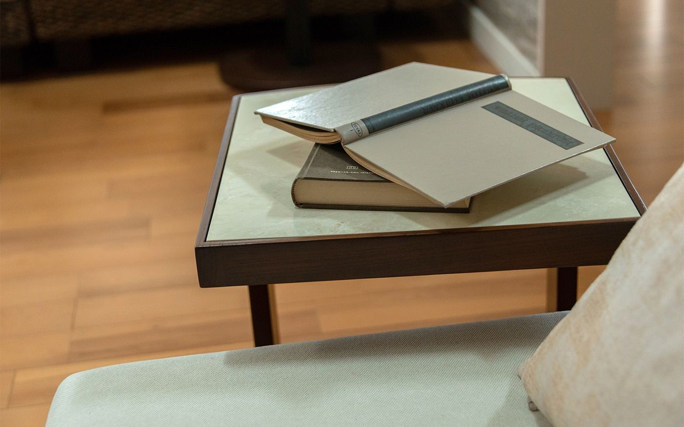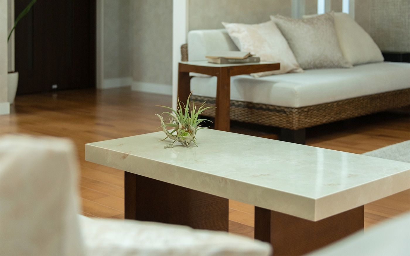 ソファスペースの裏側に同素材のオットマンを2台とローテーブルを組み合わせて配置することで、寛ぎスペースが広がったような非日常感のある空間に。同素材で統一感も出しつつ、快適さを増すことが可能です。