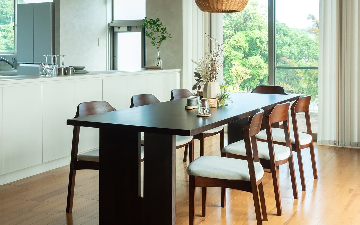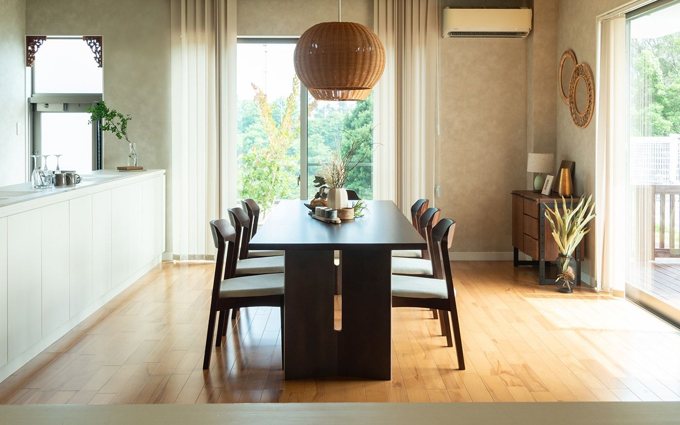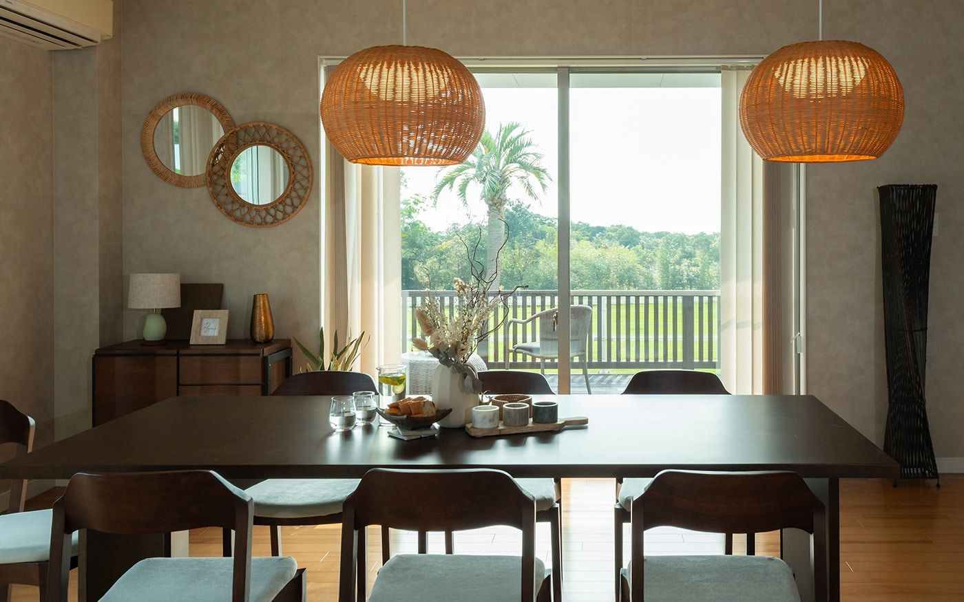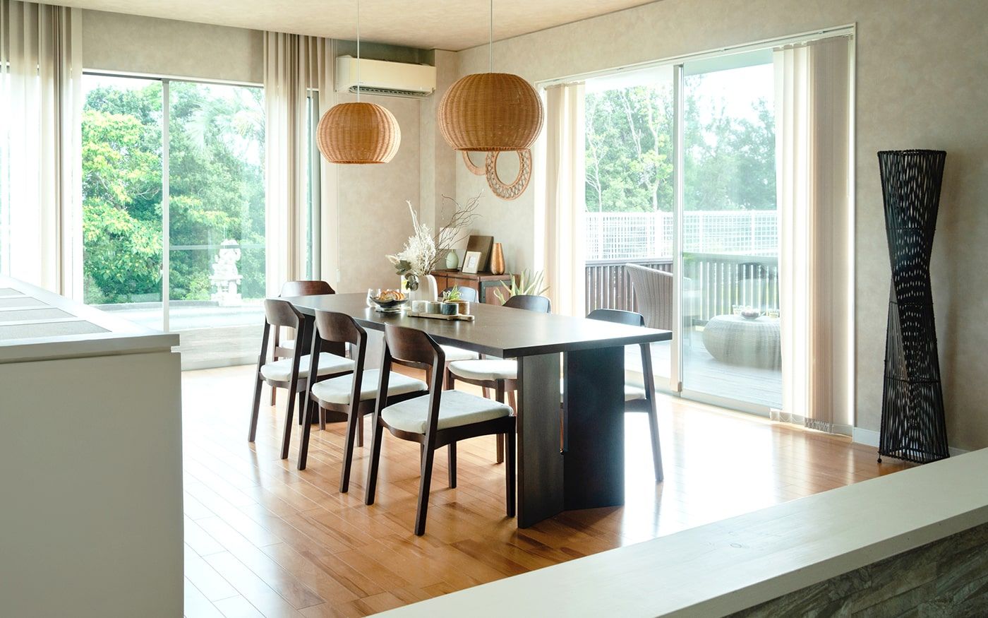 ダイニングスペースには、キッチン前とリビング前の2カ所に広々とした無垢材ダイニングテーブルセットを設置。最大9名程で座れる空間にゆとりを持たせた家具選びがポイントです。リゾートの中で食事をしているかのような心地よさを感じられます。