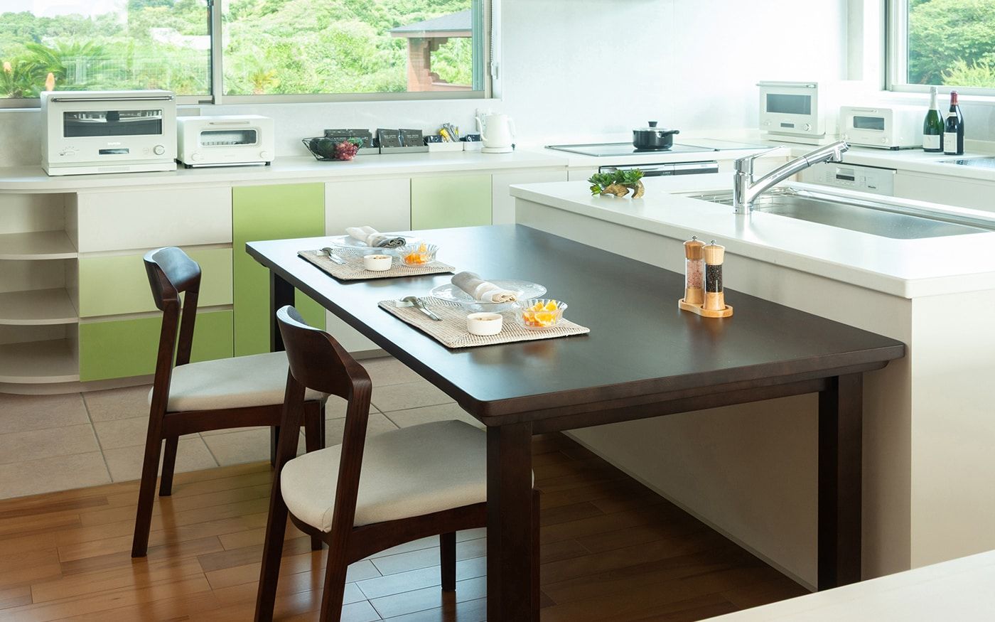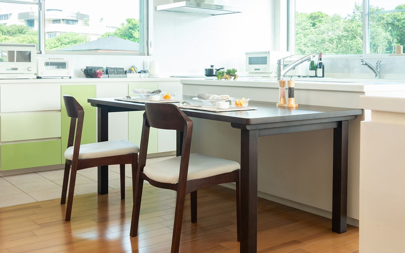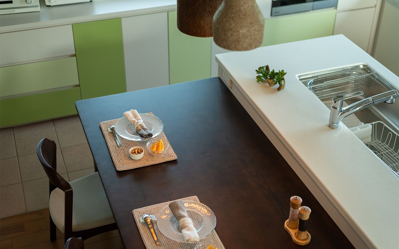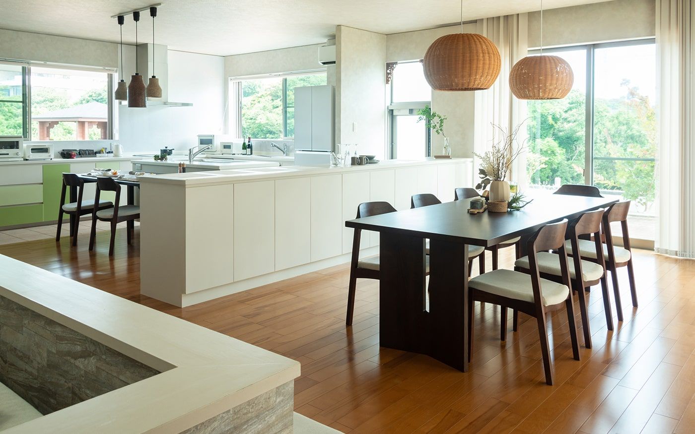 ダイニングスペースには、キッチン前とリビング前の2カ所に広々とした無垢材ダイニングテーブルセットを設置。最大9名程で座れる空間にゆとりを持たせた家具選びがポイントです。リゾートの中で食事をしているかのような心地よさを感じられます。