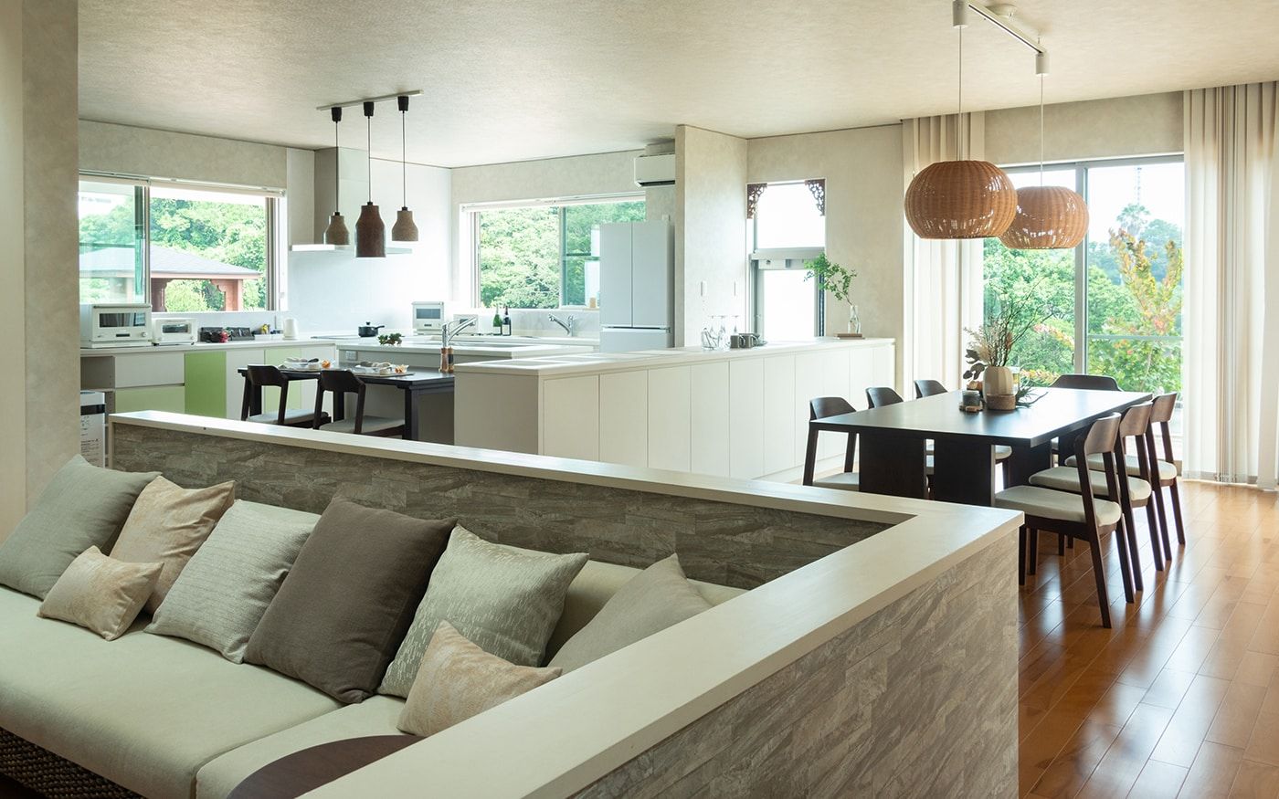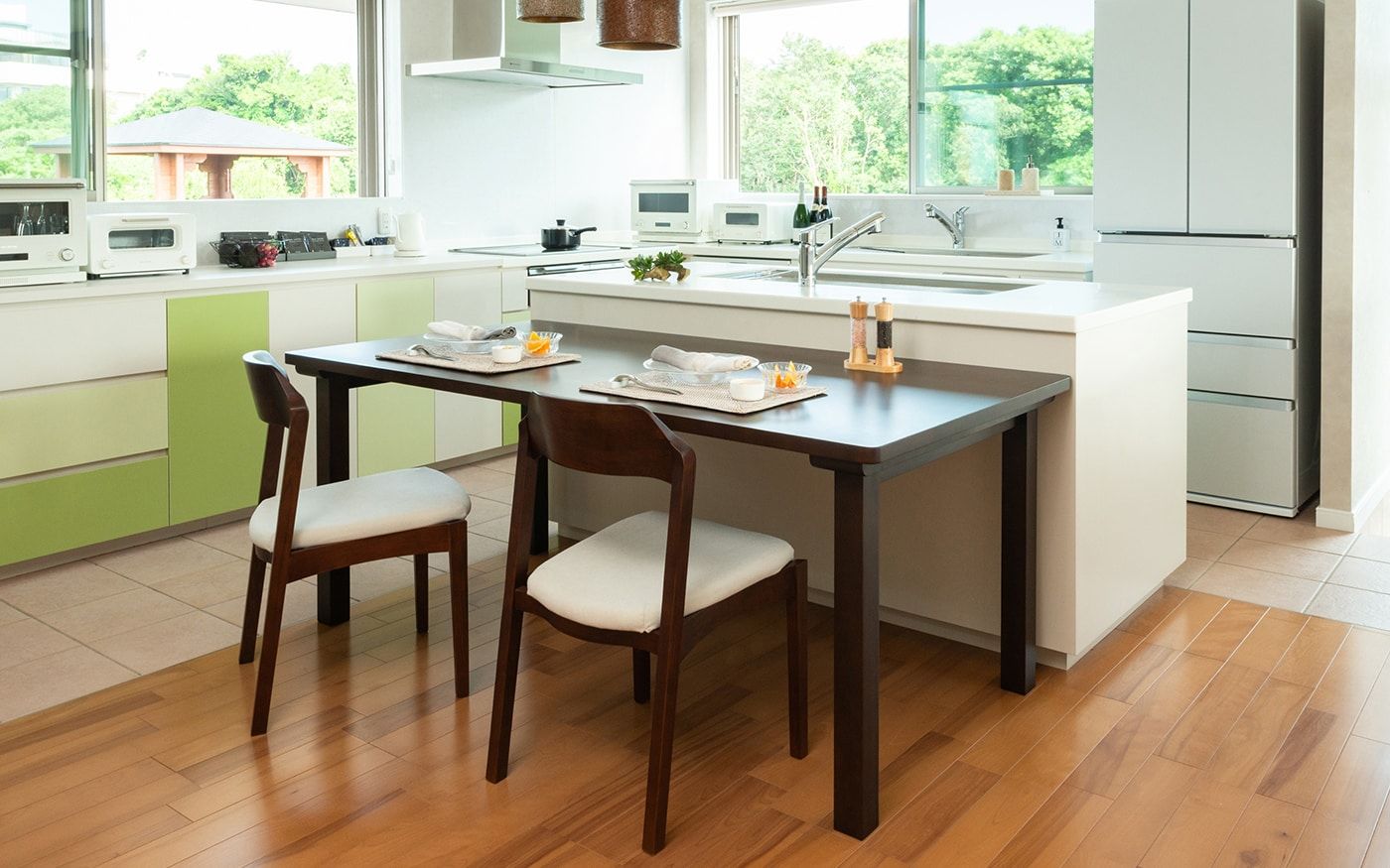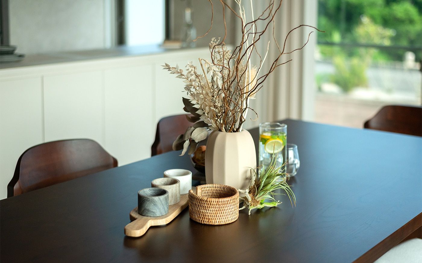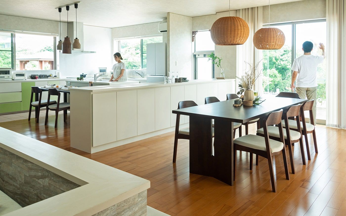ダイニングスペースには、キッチン前とリビング前の2カ所に広々とした無垢材ダイニングテーブルセットを設置。最大9名程で座れる空間にゆとりを持たせた家具選びがポイントです。リゾートの中で食事をしているかのような心地よさを感じられます。