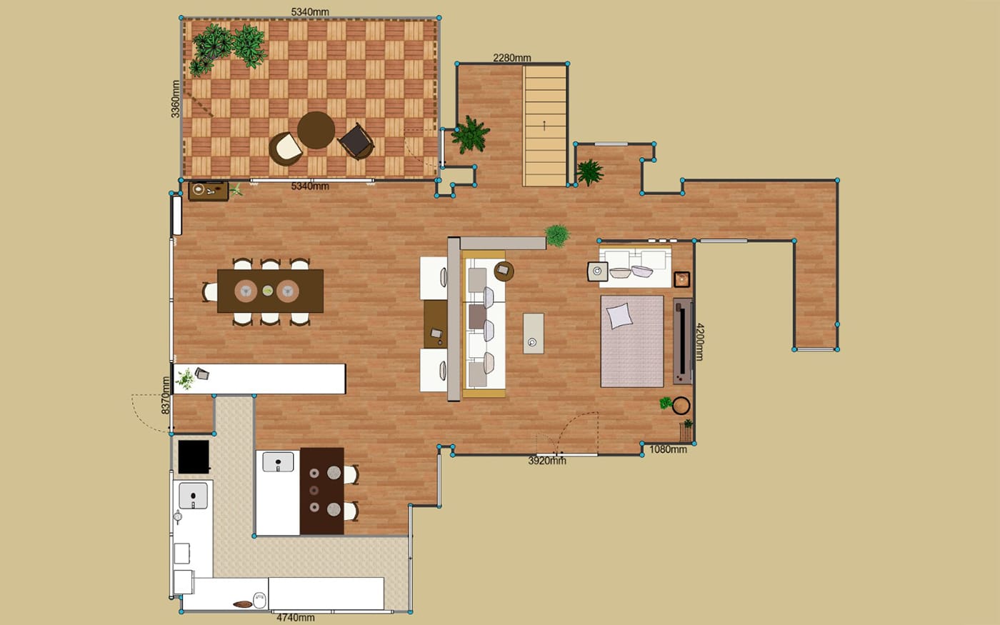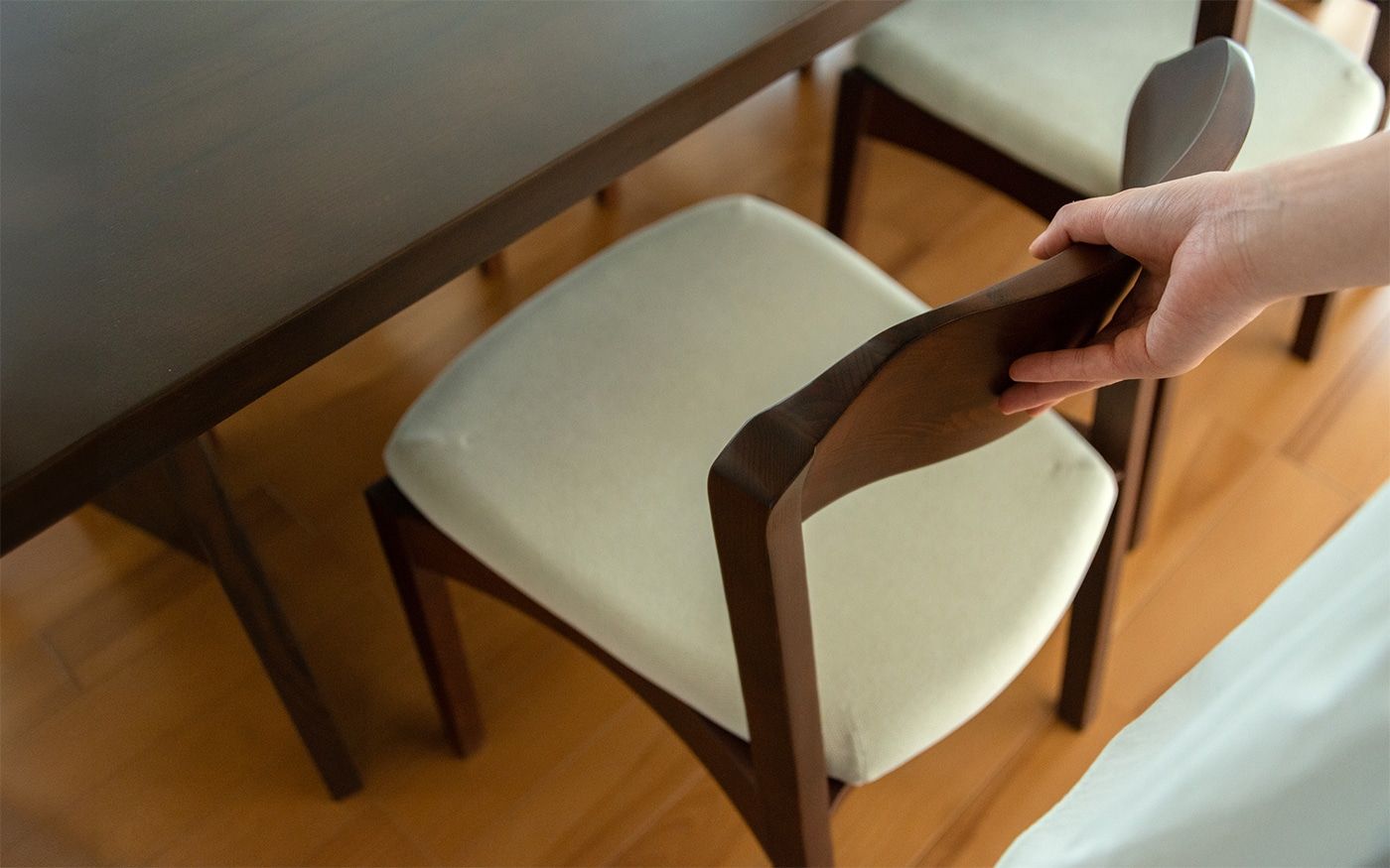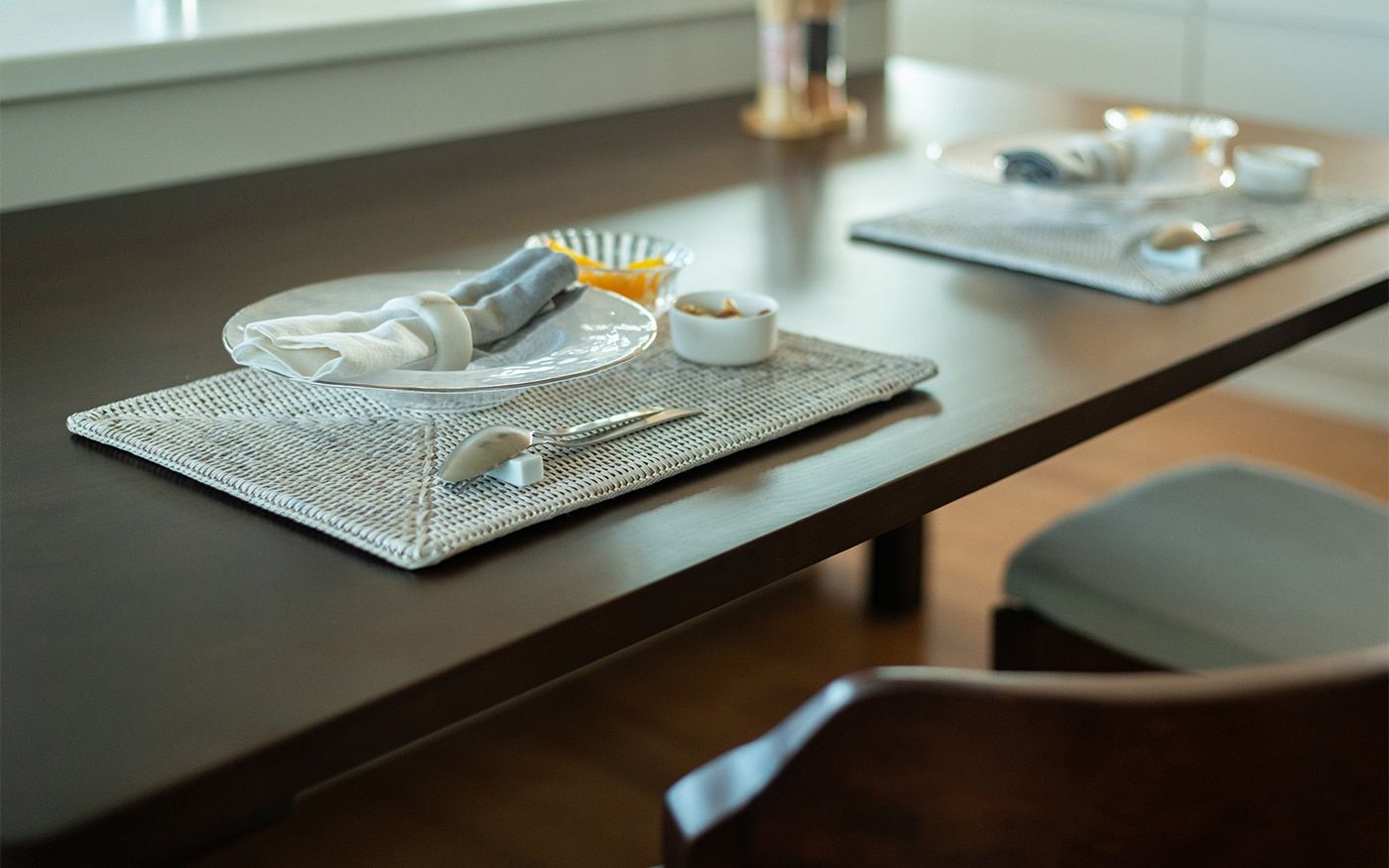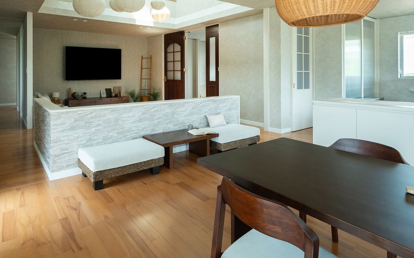 ダイニングスペースには、キッチン前とリビング前の2カ所に広々とした無垢材ダイニングテーブルセットを設置。最大9名程で座れる空間にゆとりを持たせた家具選びがポイントです。リゾートの中で食事をしているかのような心地よさを感じられます。