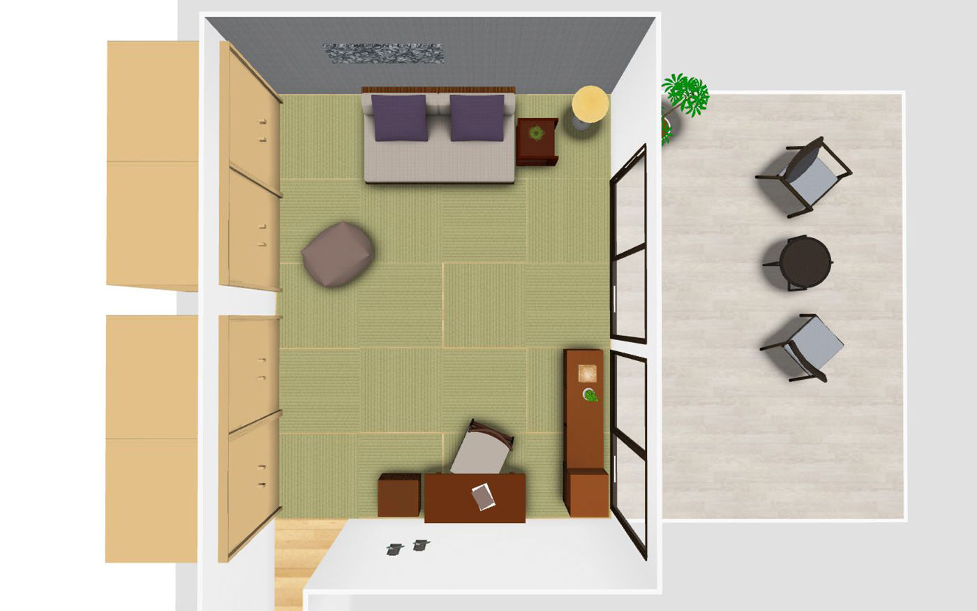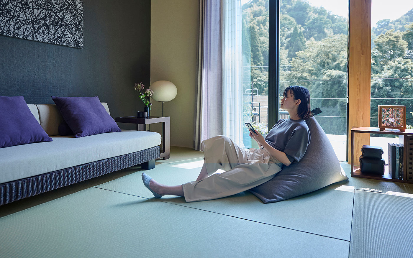 畳の空間にローソファとビーズクッションを組み合わせることで、和と洋の暮らしを絶妙にミックスできます。ソファに座るだけでなく、床に直接座ることもできるため、自由で開放感のあるリビングを実現可能に。心地よいくつろぎの時間を楽しみながら、和の風情を感じることができる空間です。