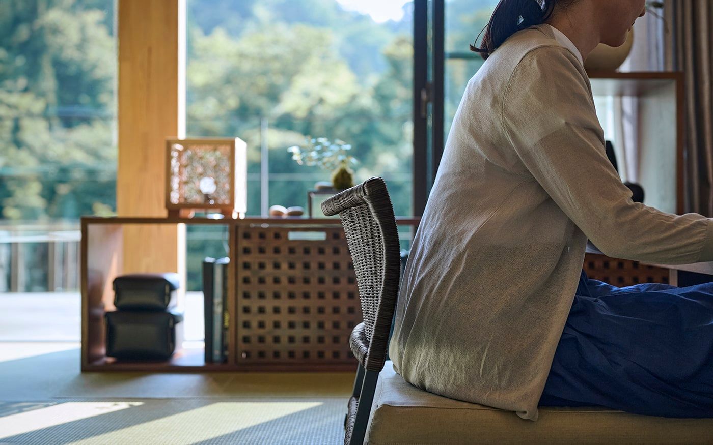 畳の上に座椅子と座卓を配置した、和の佇まいを感じる床座の書斎スペース。無垢材のローボードを脇に置いてお気に入りのインテリアを飾れば、個性豊かな空間が完成します。自然素材に囲まれたこのスペースで、集中して作業を進めることができるでしょう。