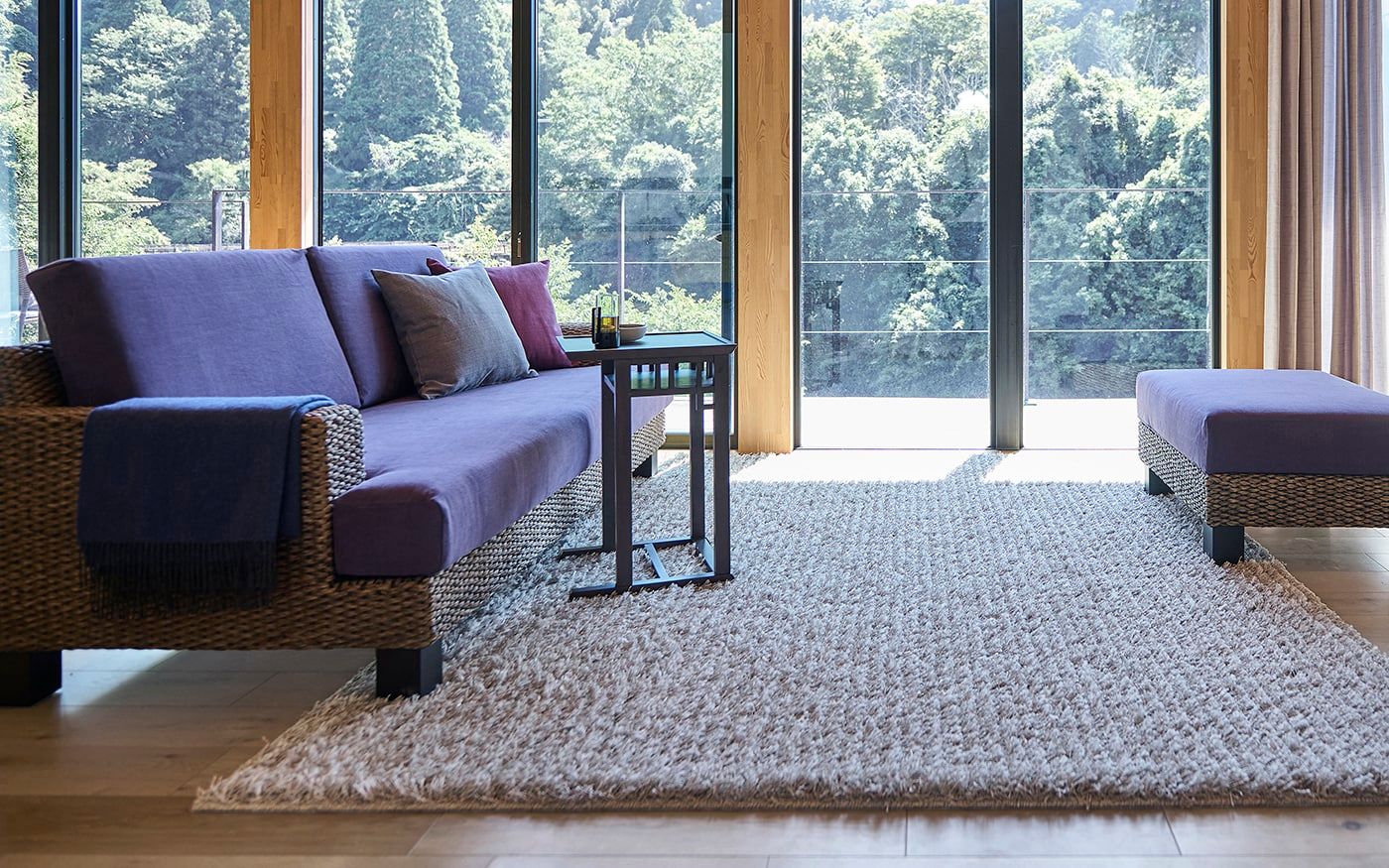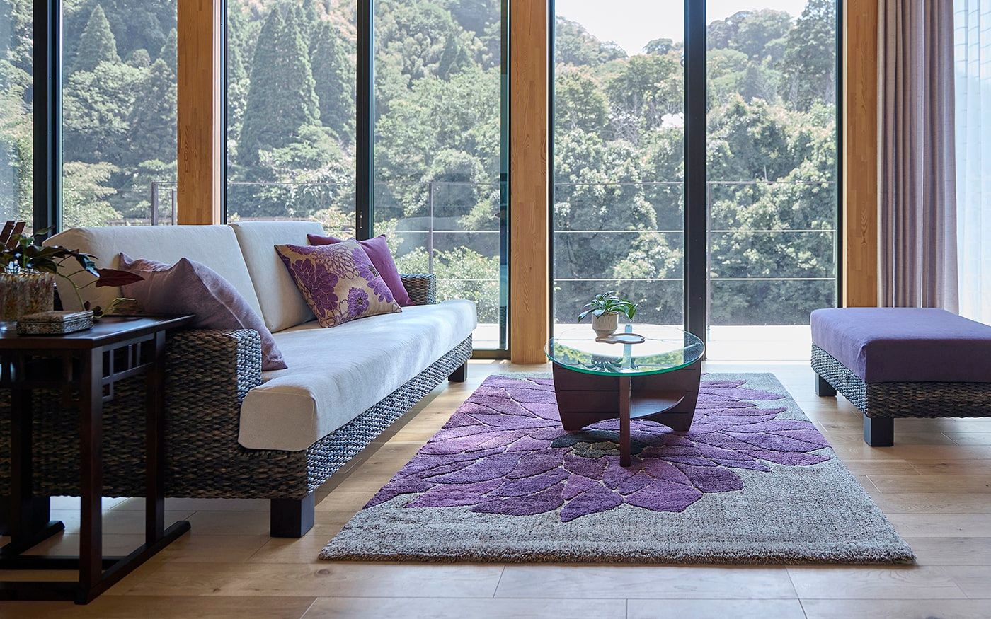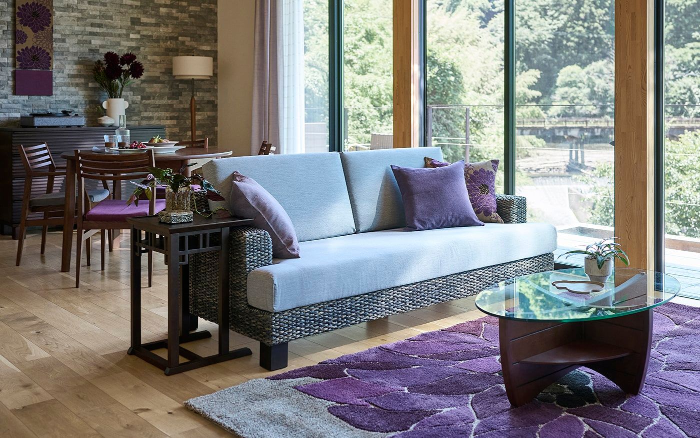 モダンなグレーインテリアに紫のアクセントを加えることで、空間に洗練された印象を与えます。紫は高貴で落ち着いた色合いのため、グレーのシンプルさを引き立てます。クッションやラグなどに紫を取り入れて、部屋全体に深みと個性をプラスし、居心地の良い空間を演出してみては?