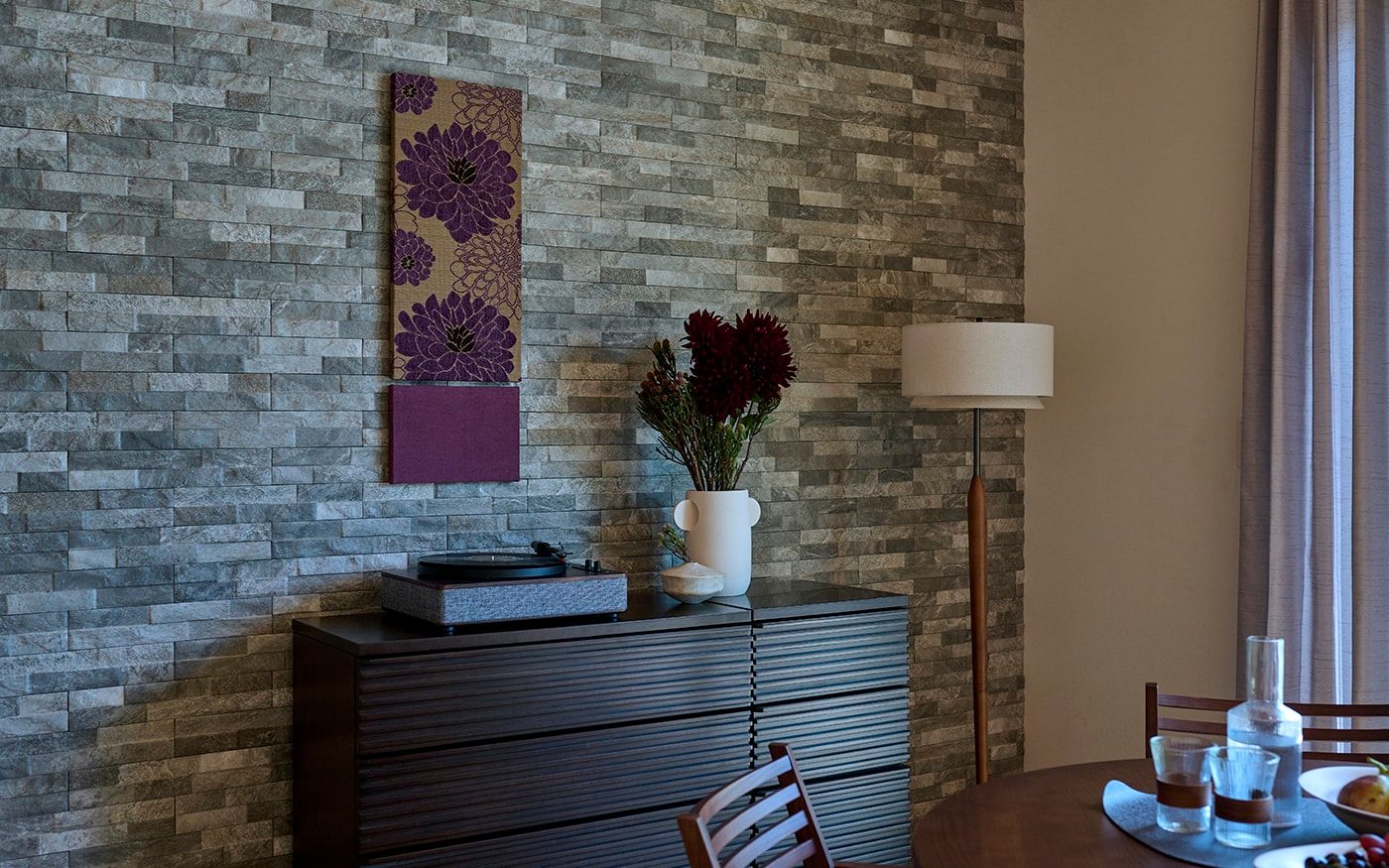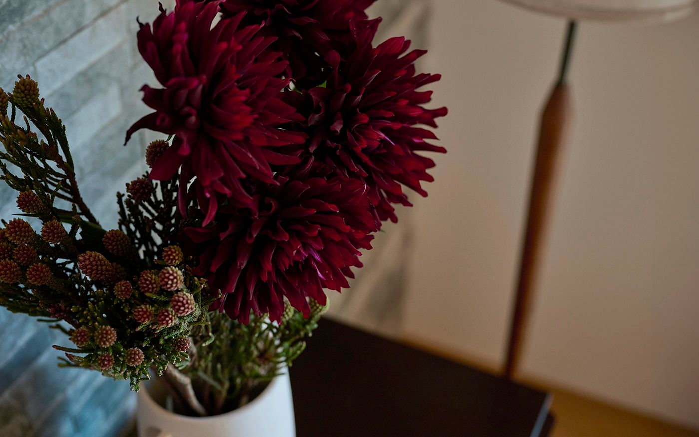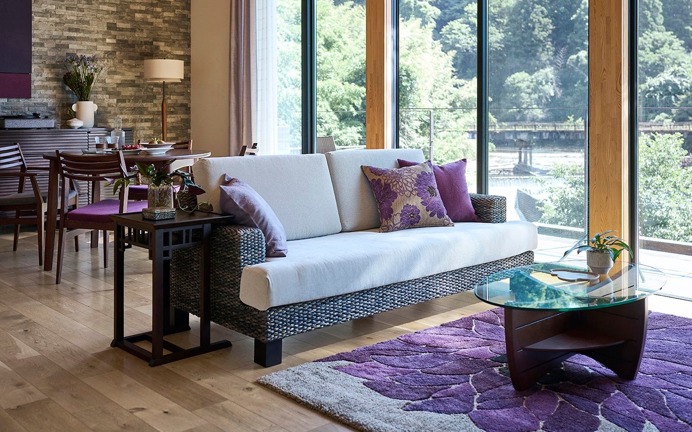 モダンなグレーインテリアに紫のアクセントを加えることで、空間に洗練された印象を与えます。紫は高貴で落ち着いた色合いのため、グレーのシンプルさを引き立てます。クッションやラグなどに紫を取り入れて、部屋全体に深みと個性をプラスし、居心地の良い空間を演出してみては?
