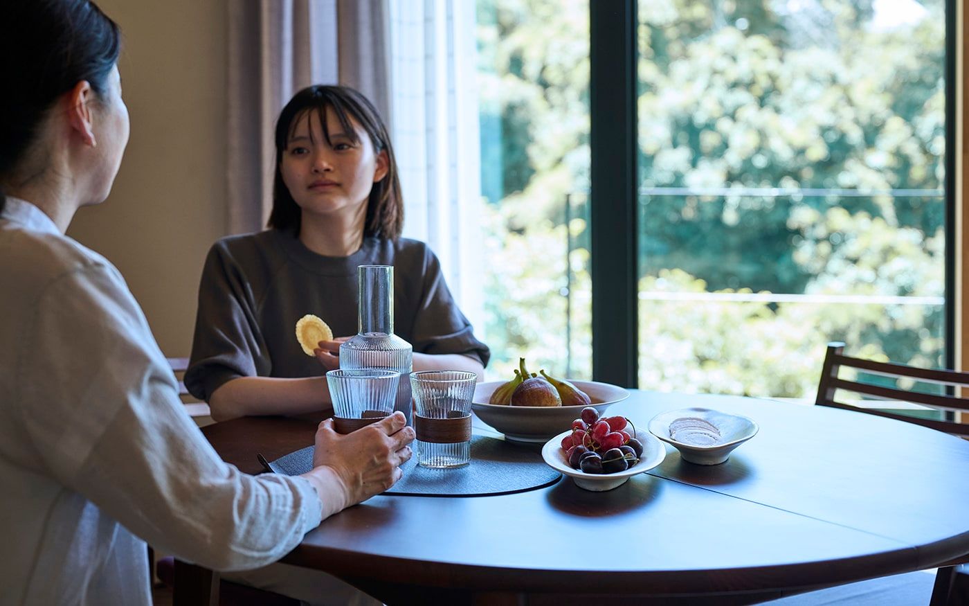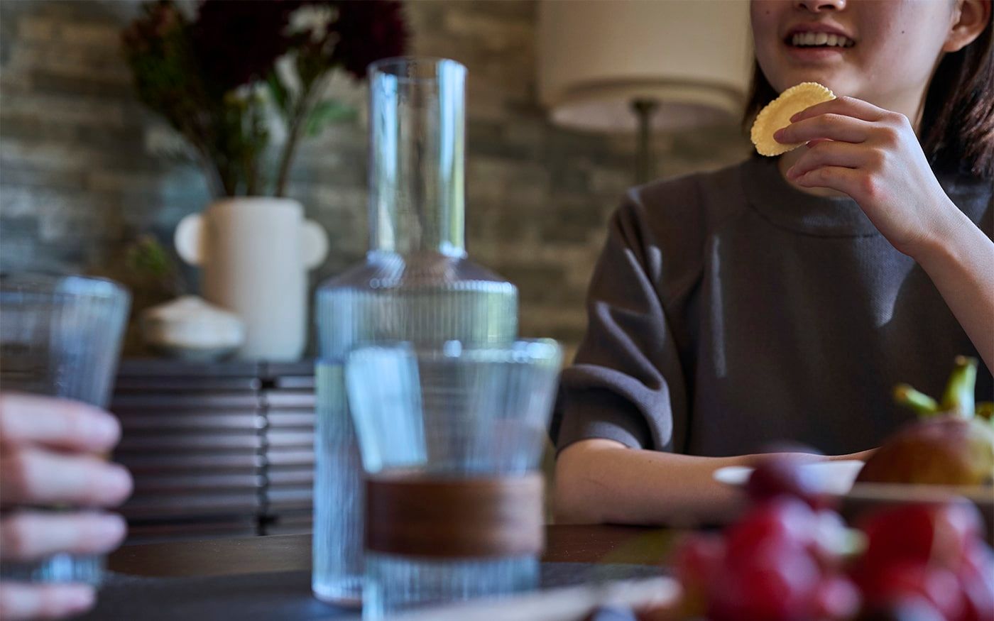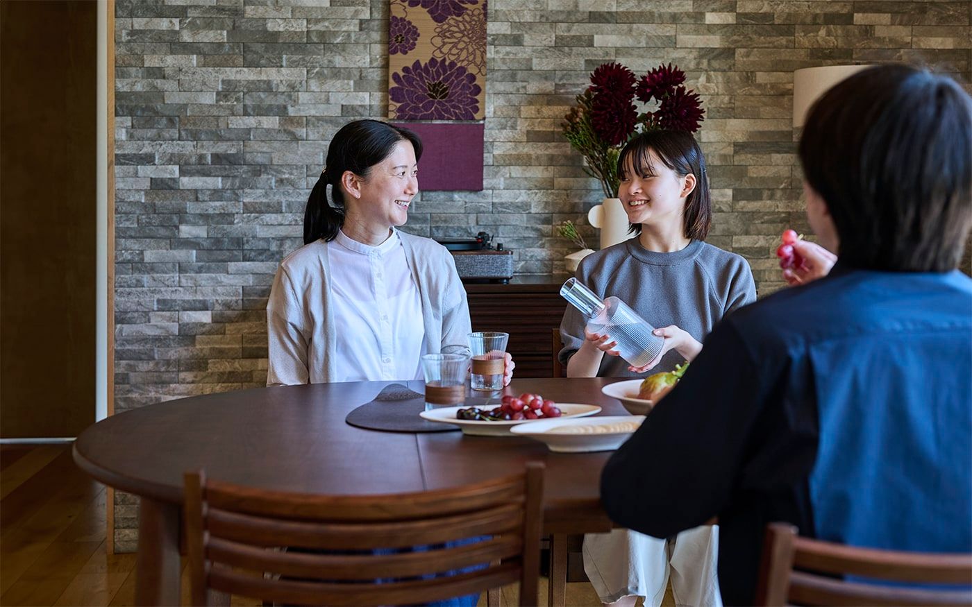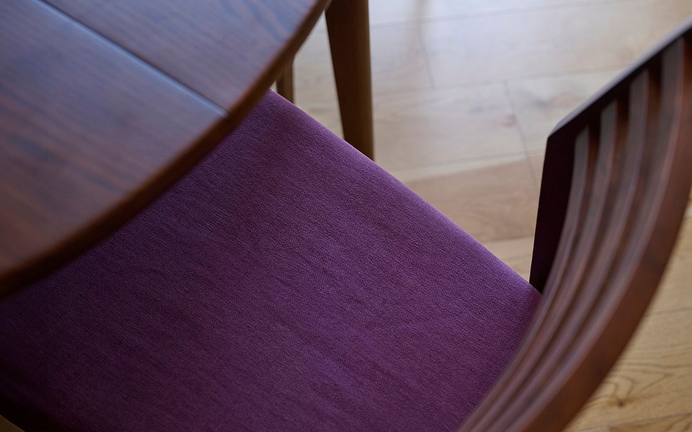 伸長式の円形ダイニングテーブルは、家族や友人との集まりに最適です。パープルのチェアカバーや壁面装飾を組み合わせることで、食卓に華やかさと落ち着きをもたらします。色彩豊かな食事の時間は、会話を弾ませ、心地よいひとときを演出してくれるでしょう。
