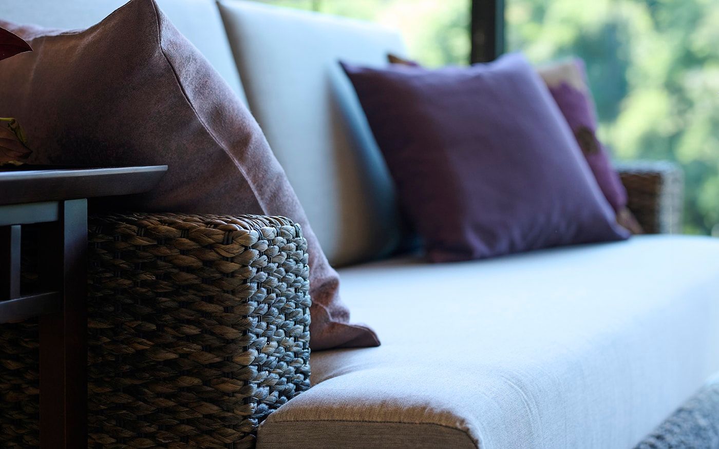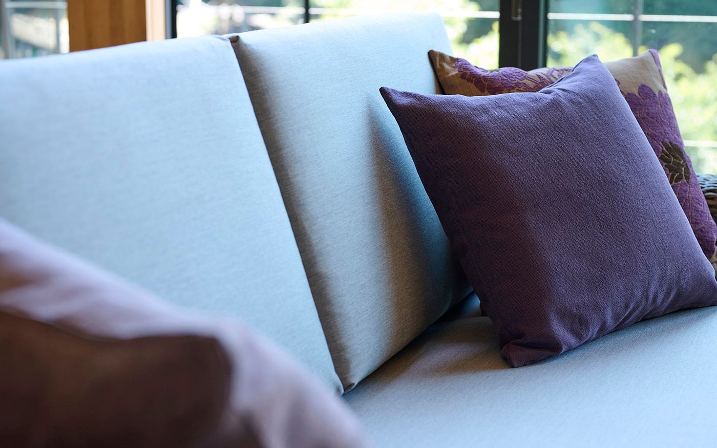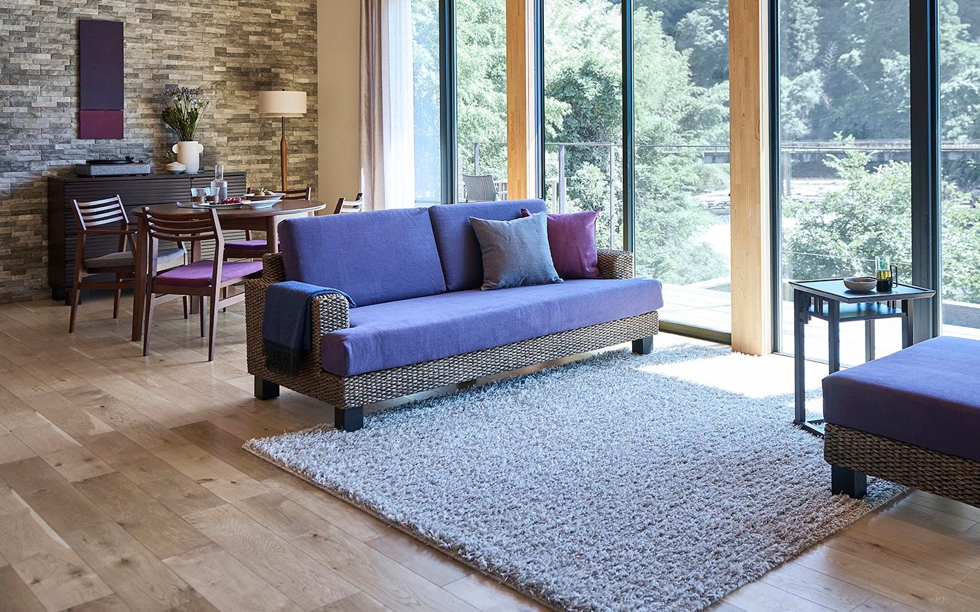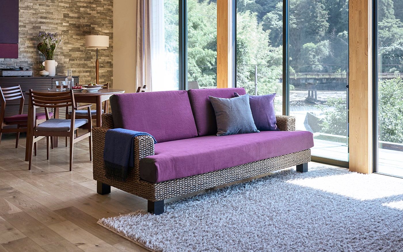 お部屋をパープルコーデに模様替えすると、空間の見え方を大きく変えられます。例えば、ソファカバーを変えると、空間に落ち着きと高級感が。さらに、クッションを濃い紫色にすれば華やかさをプラス。足元にグレーのラグを敷くことで、パープルのインテリアをより魅力的に見せ、居心地の良い空間が生まれます。