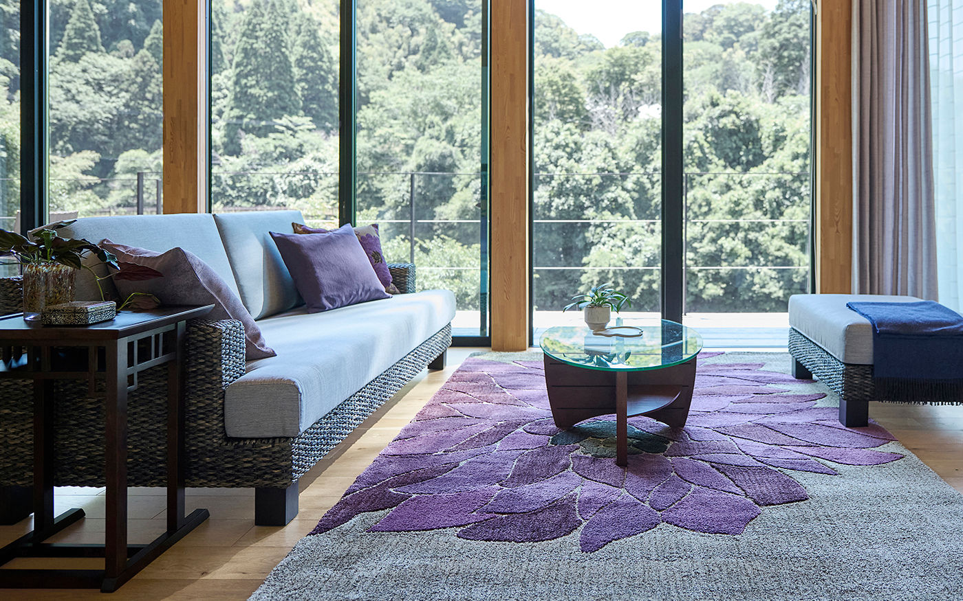 モダンなグレーインテリアに紫のアクセントを加えることで、空間に洗練された印象を与えます。紫は高貴で落ち着いた色合いのため、グレーのシンプルさを引き立てます。クッションやラグなどに紫を取り入れて、部屋全体に深みと個性をプラスし、居心地の良い空間を演出してみては?