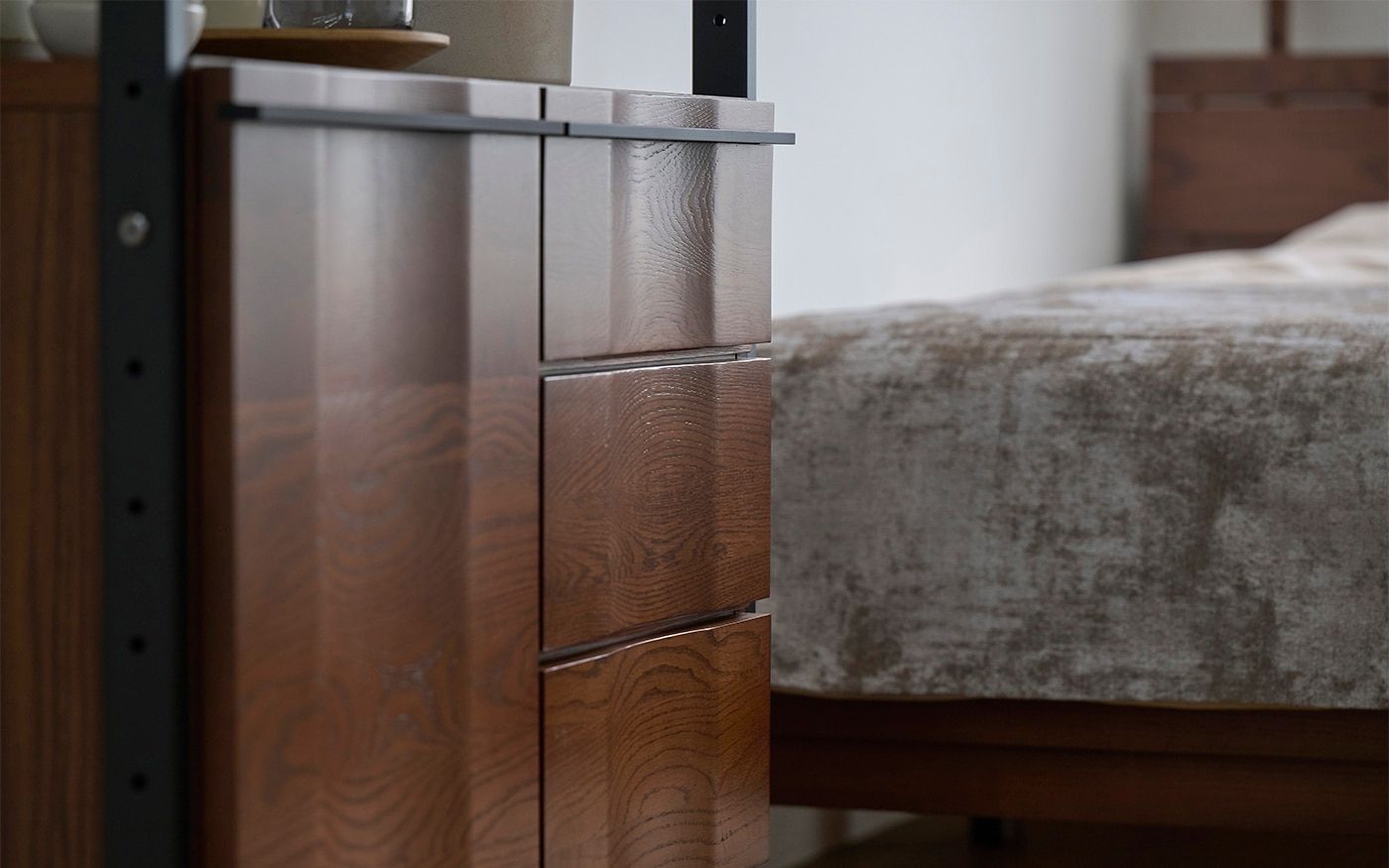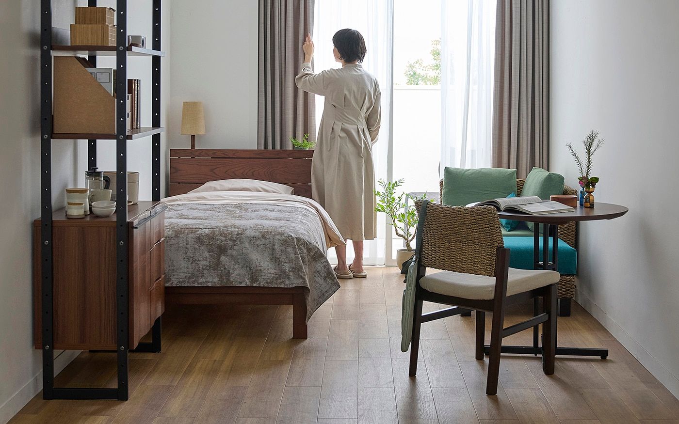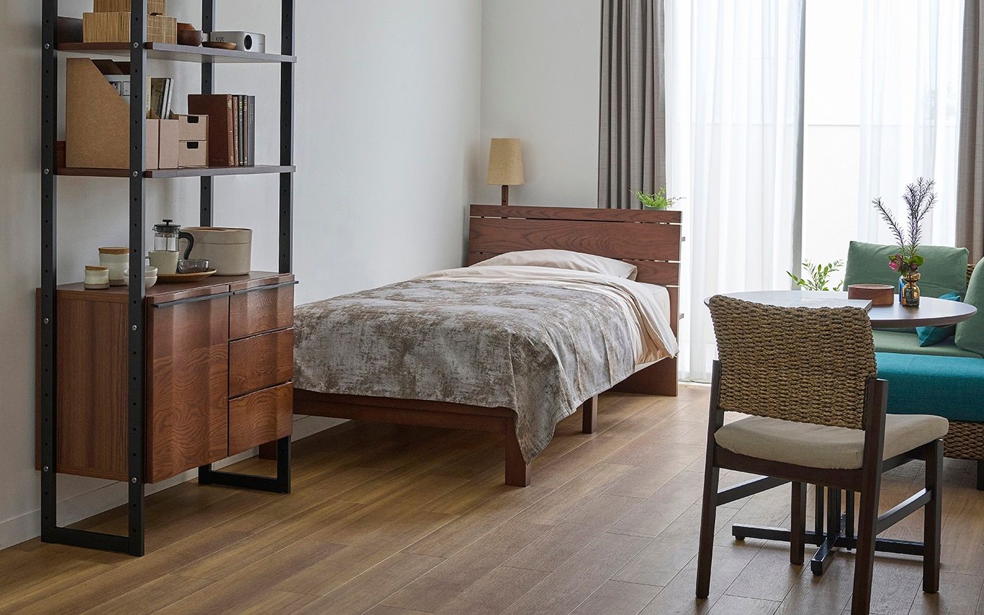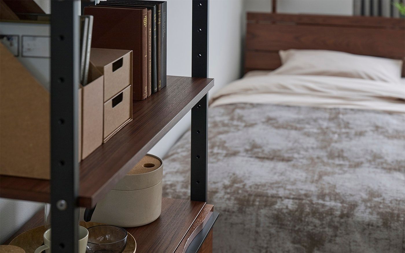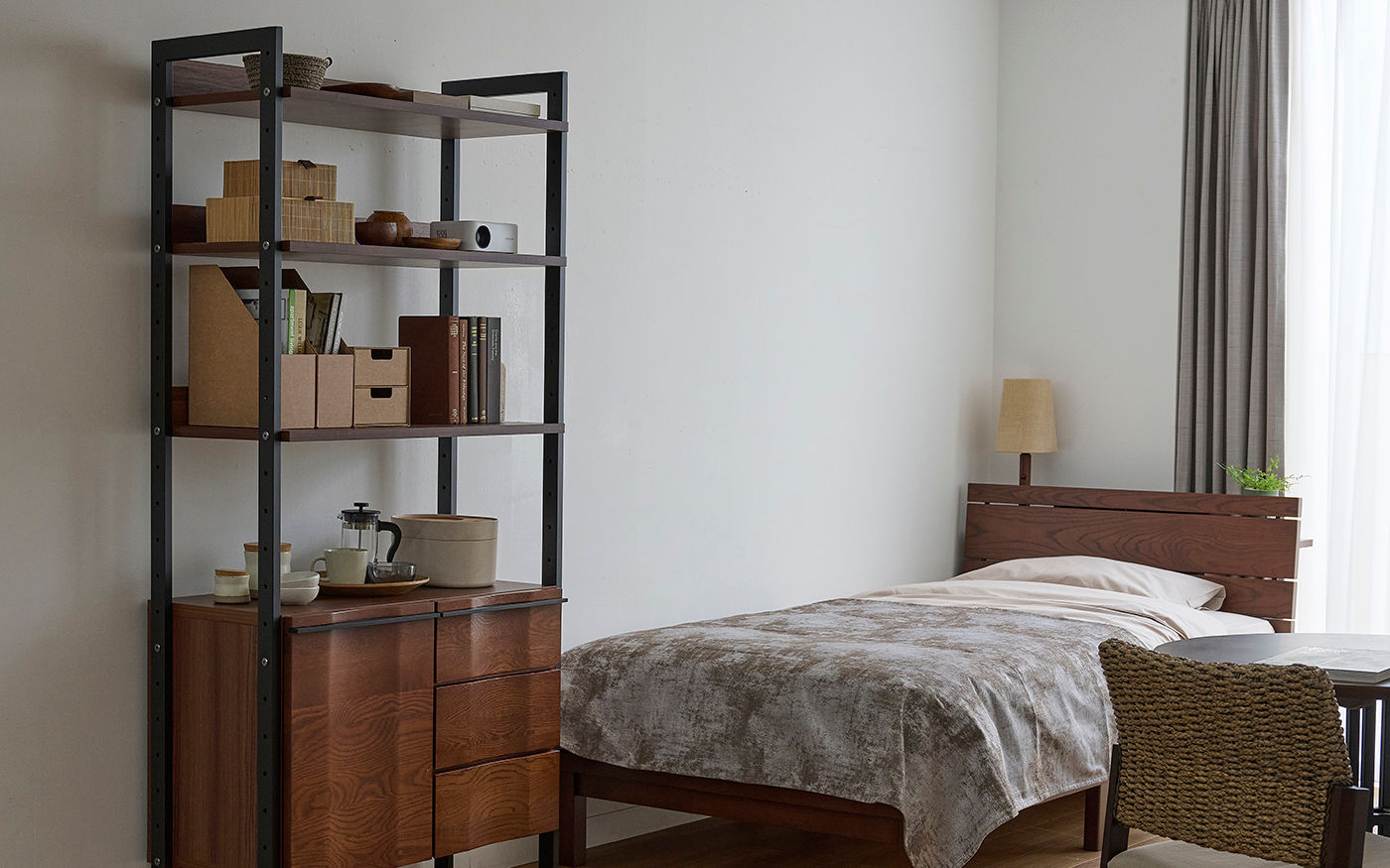 天然木とスチールの異素材を融合させた、リビングシェルフを取り入れた空間。抜け感のあるデザインが、空間を圧迫せず洗練された印象を与え、狭い一人暮らしにも美しく馴染みます。