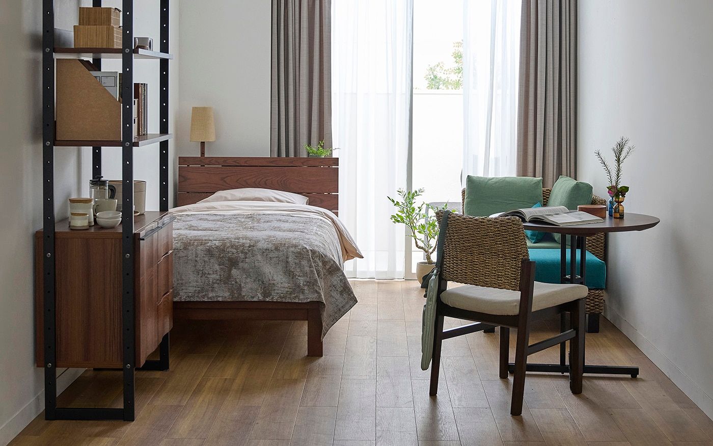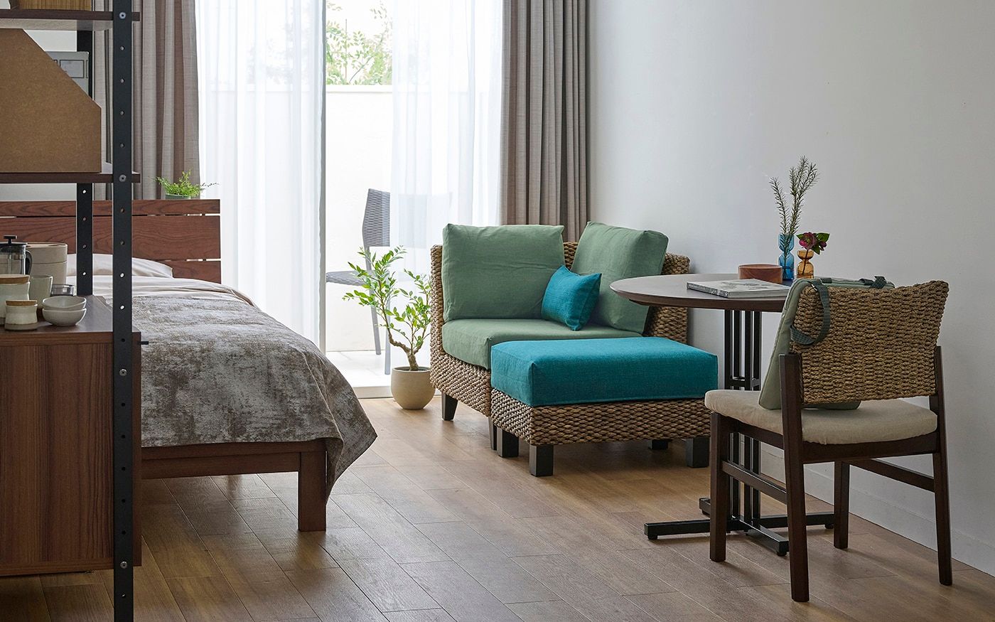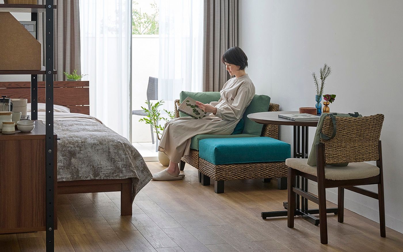 コーナーソファとオットマンを組み合わせた1Pソファは、ワンルームのベストポジションに。グリーンのアクセントが空間に映え、無垢材ベッドとも相性よく調和した寛ぎ場を作ります。