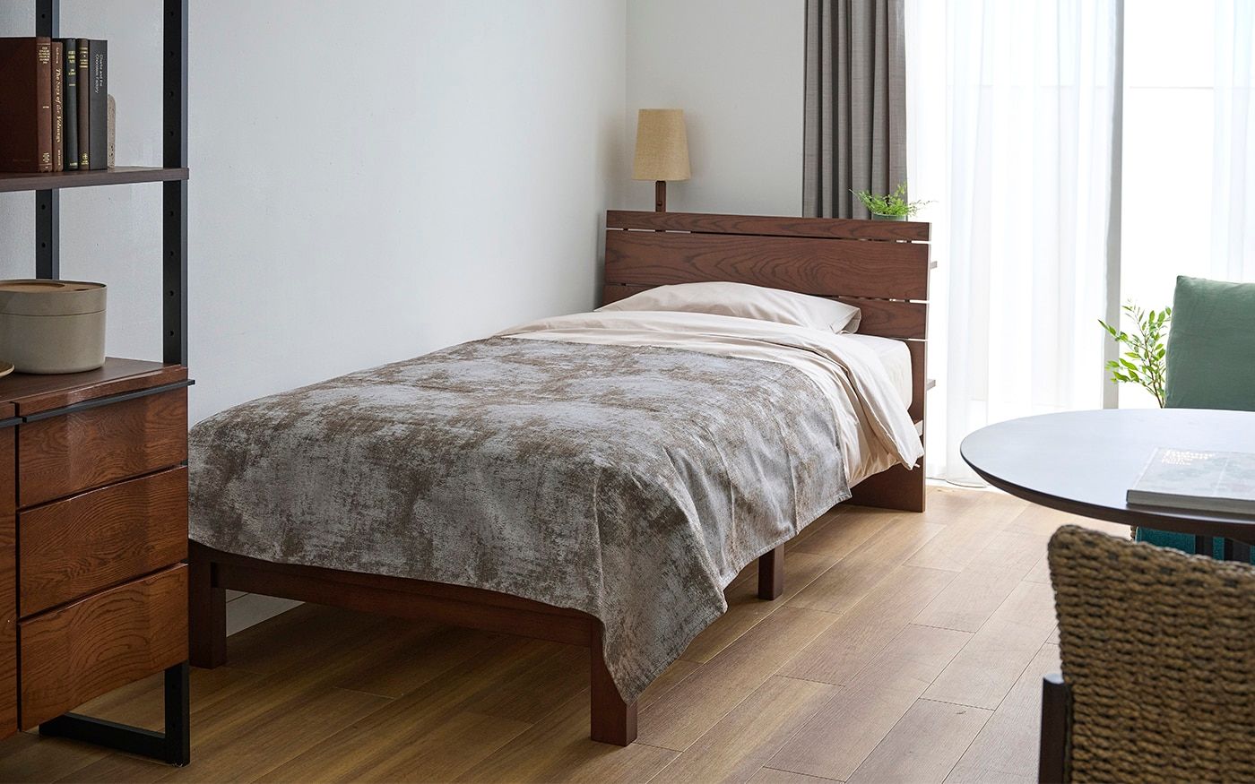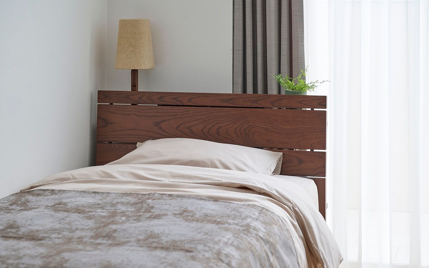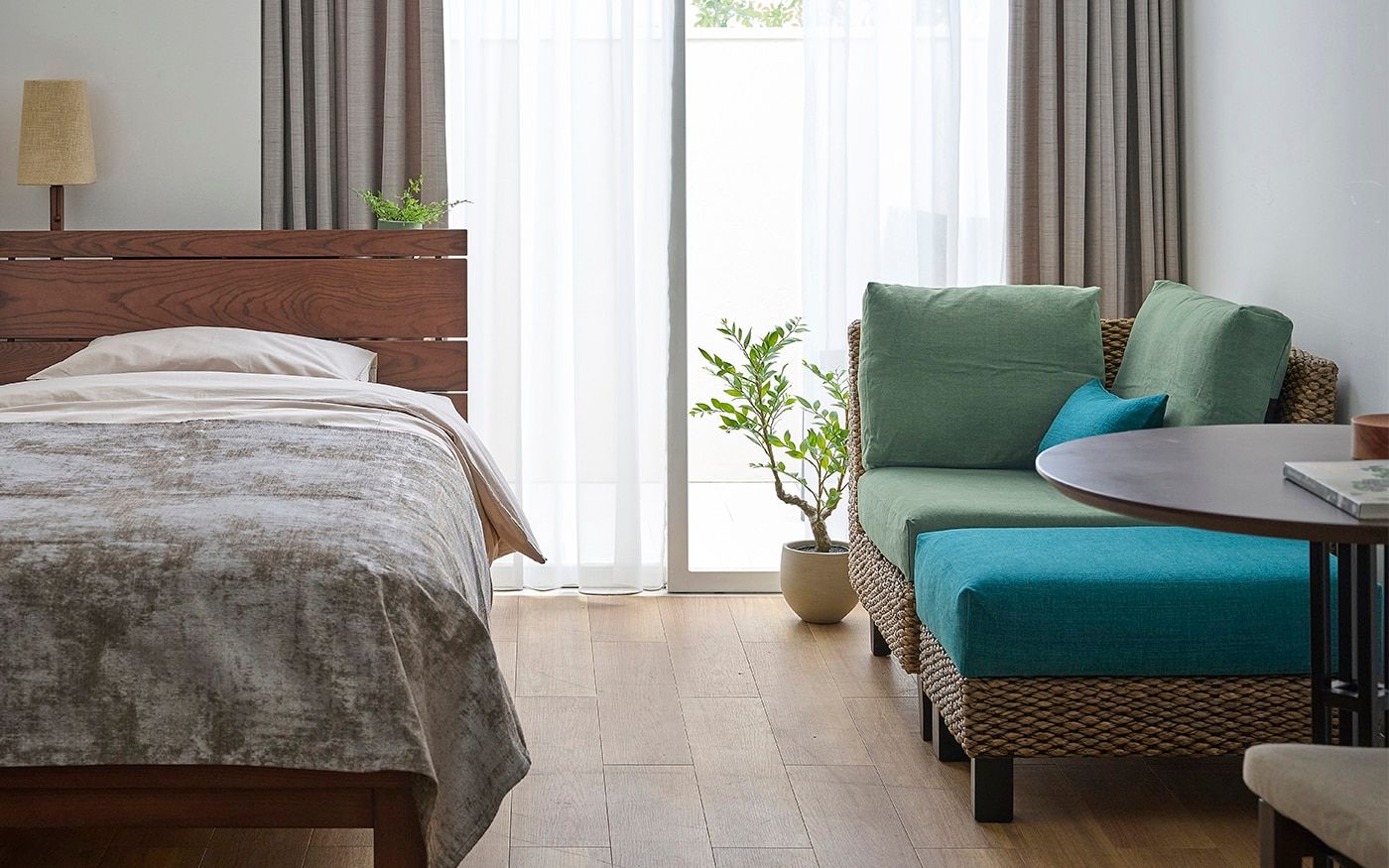 コーナーソファとオットマンを組み合わせた1Pソファは、ワンルームのベストポジションに。グリーンのアクセントが空間に映え、無垢材ベッドとも相性よく調和した寛ぎ場を作ります。