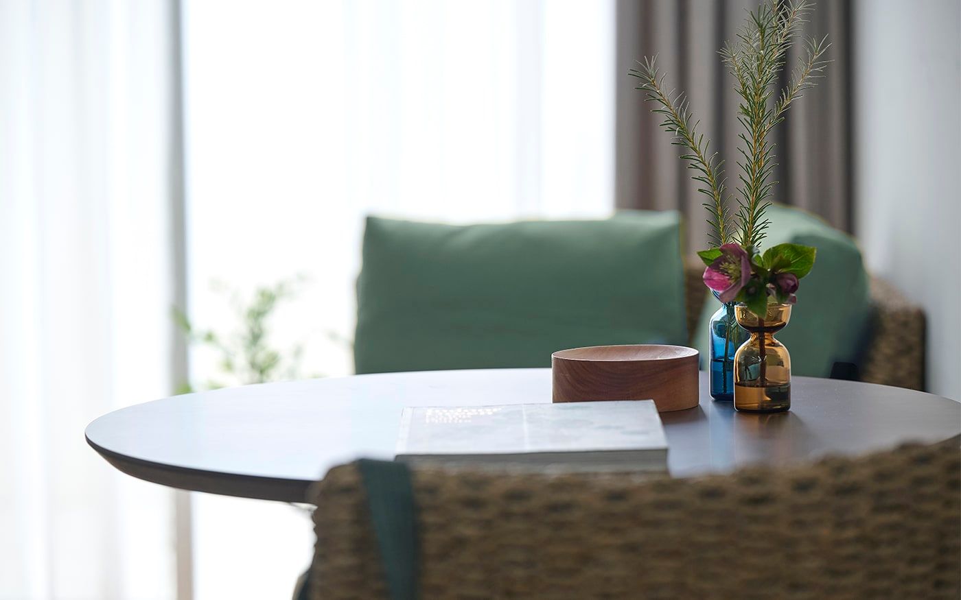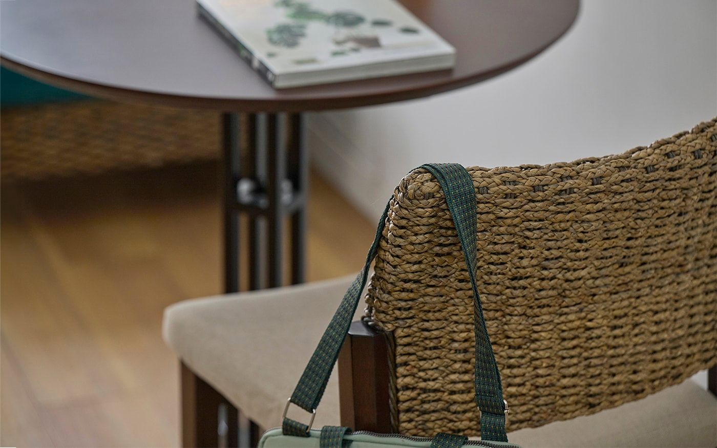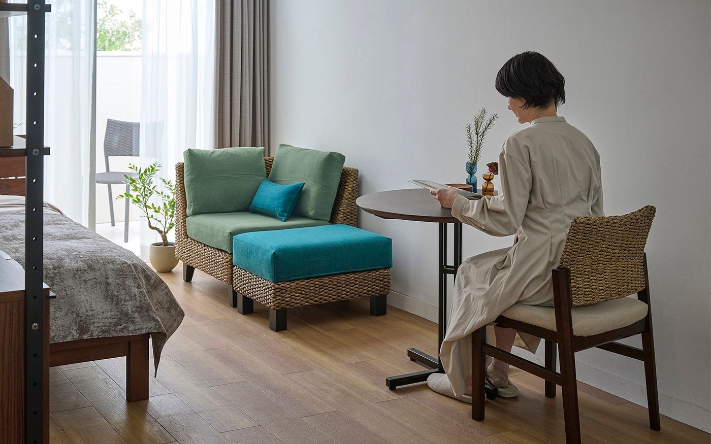 省スペースに収まる円形テーブルと、ヒヤシンス素材のチェアを合わせてカフェ風のスペースに。天然素材の風合いが日常を格上げし、限られた広さでも心ゆくまでリラックスできるでしょう。