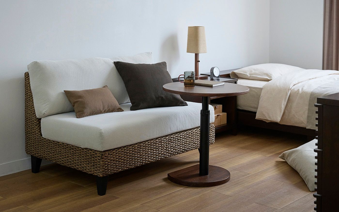 直径55cmの広い天板を備えた円形サイドテーブルは、食事と作業をスマートに兼用できる万能な一台。温もりある無垢材が部屋に馴染み、昇降式でシーンに合わせた高さ調節も自由自在です。これ一つでワンルームに上質なゆとりが生まれます。