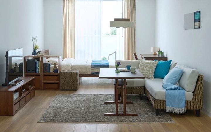 心地よいリゾート風の空間で、忙しい毎日をリセット。ヒヤシンスソファにブラウンのソファカバーを合わせ、円形サイドテーブルを添えれば、自分らしいオフの時間に。自然素材の温もりに包まれるワンルームは、癒やしのひとときです。