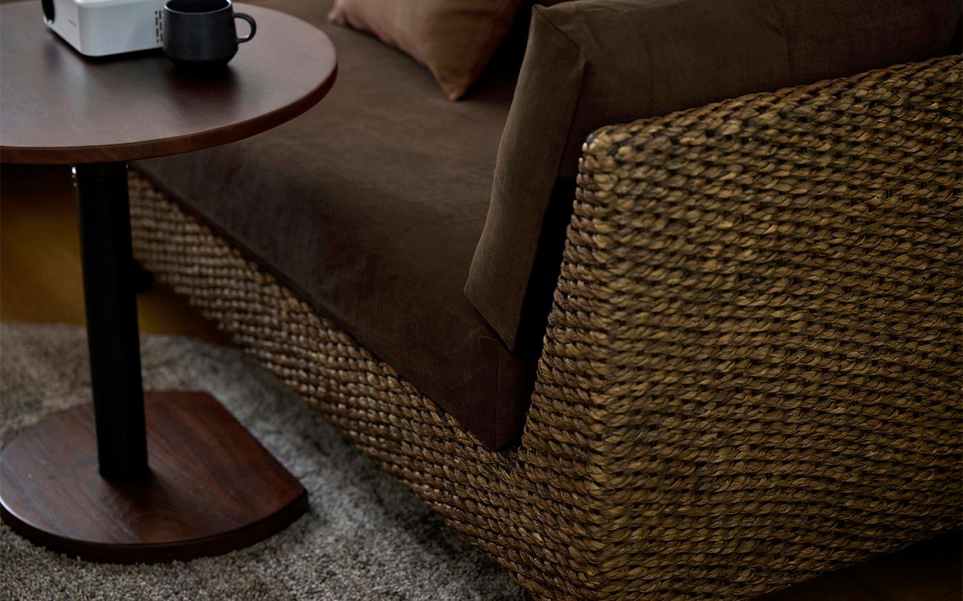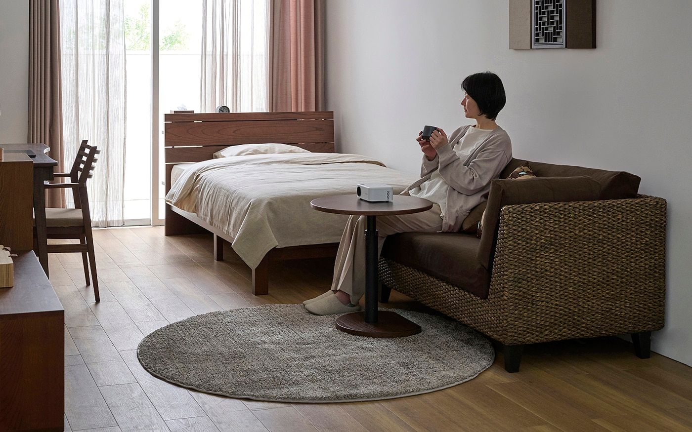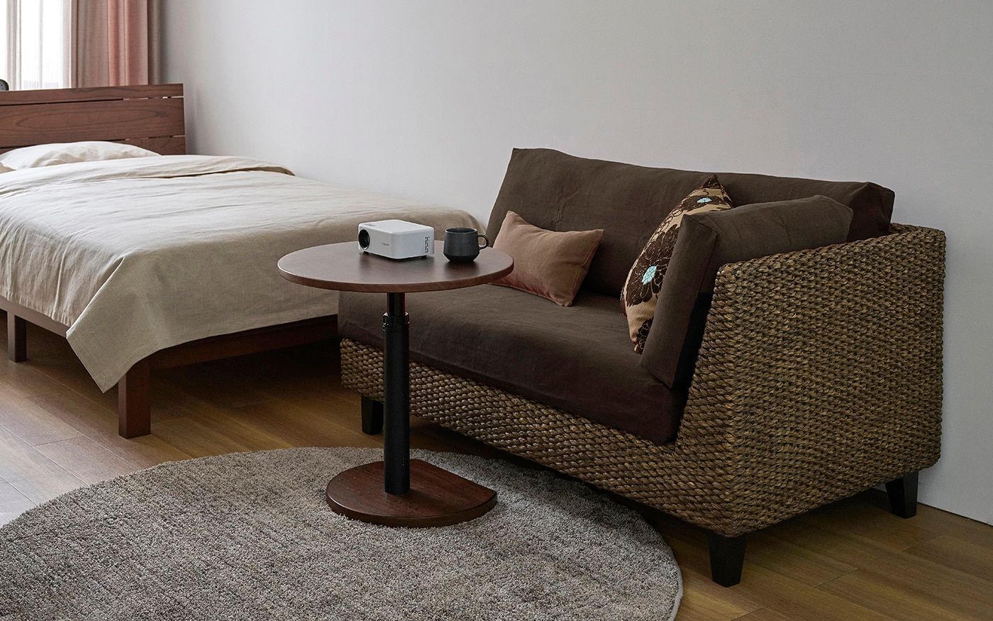 心地よいリゾート風の空間で、忙しい毎日をリセット。ヒヤシンスソファにブラウンのソファカバーを合わせ、円形サイドテーブルを添えれば、自分らしいオフの時間に。自然素材の温もりに包まれるワンルームは、癒やしのひとときです。